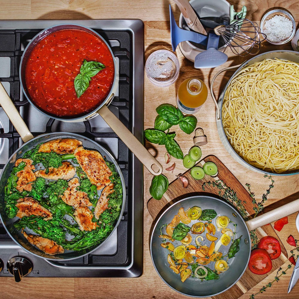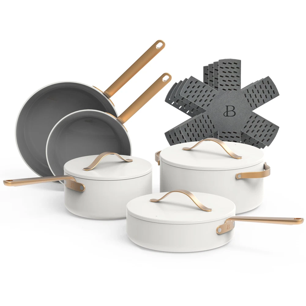 Beautiful 12pc Ceramic Non-Stick Cookware Set, White Icing by Drew Barrymore Made with a non-toxic, ceramic non-stick coating Durable construction for fast and even heating Sleek design with gold pressed forged aluminum lid handles Pressed forged aluminum lid for cohesive look and cooking control Oven safe up to 500°F, including pressed forged aluminum lids lids Dishwasher safe, handwash recommended Compatible with all stovetops, including induction 12-piece cookware set includes: 8" fry pan 10" fry pan 3qt sauté pan 2qt saucepan 5qt Dutch oven 4 cookware protectors 4 cookware protectors
