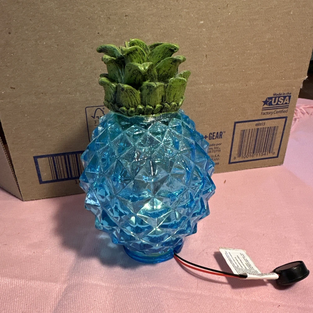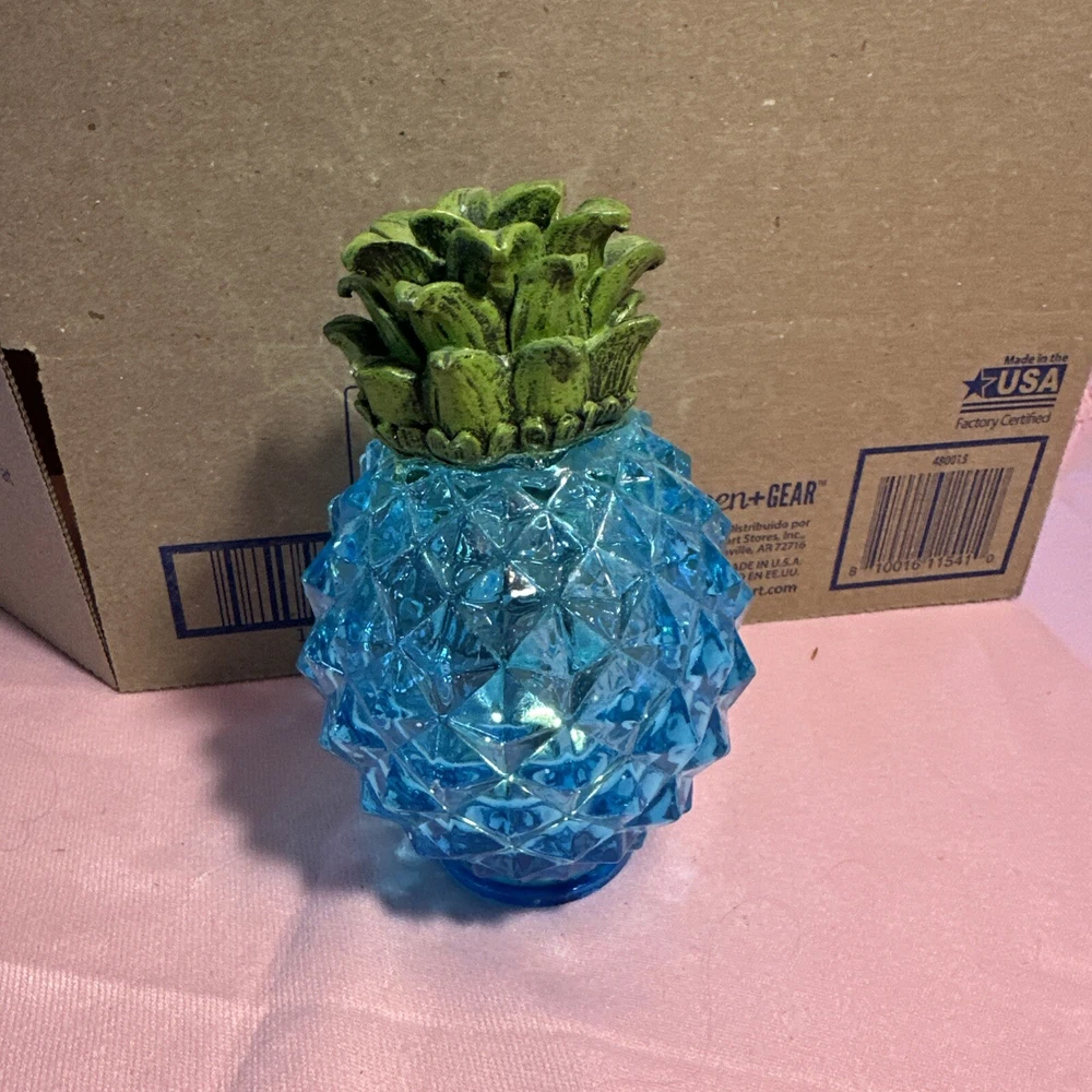 This is a beautiful blue pineapple night light from the 1990s. It emits warm white light in an indirect direction, suitable for low-light settings in any room. The lamp is made of glass, stands 5 inches tall, and has a traditional style. It is battery-powered with an on/off switch, making it convenient for use by teens, adults, and kids. Perfect for adding a touch of charm to any occasion. Lot LD