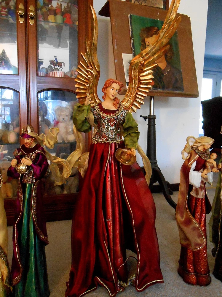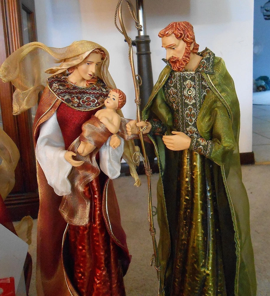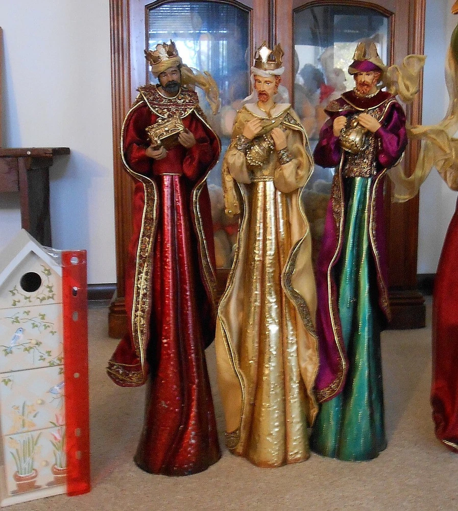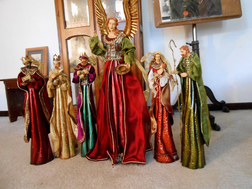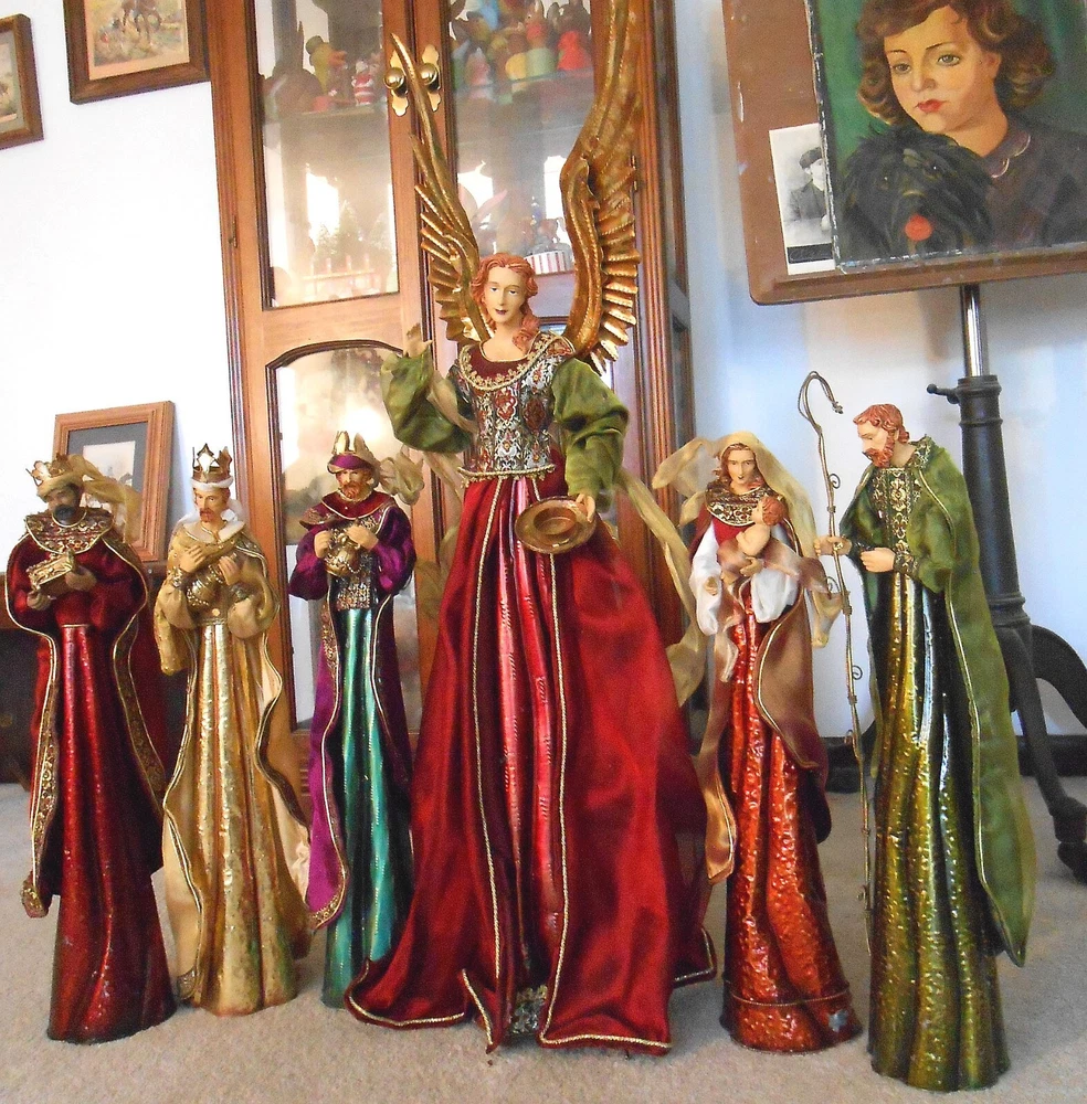 Beautiful Large 28" Nativity Set - Silk, Velvet, Enameled Tin from Philippines Rare large set of Nativity figures made of an enameled tin with weights inside. They are lavish with velvet, silk, and gold accents. Angel is 28" tall to her head or 43" tall to tip of her gold tin wings. The other figures are 21" tall. The angel has a "Philippines" label on the bottom. They are in very nice condition with the exception of a few enamel rubs on the bottom of the Angel and one of the kings. Due to the size and weight of the box shipping is $35.00. I will refund you if it comes to less. I also except pickup.