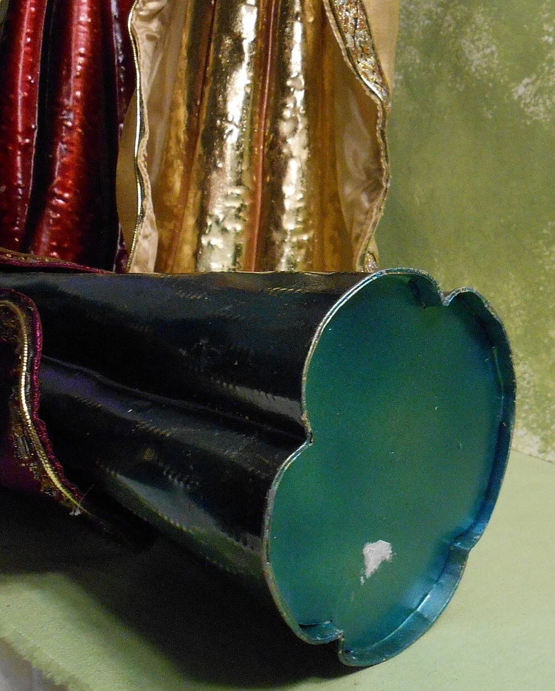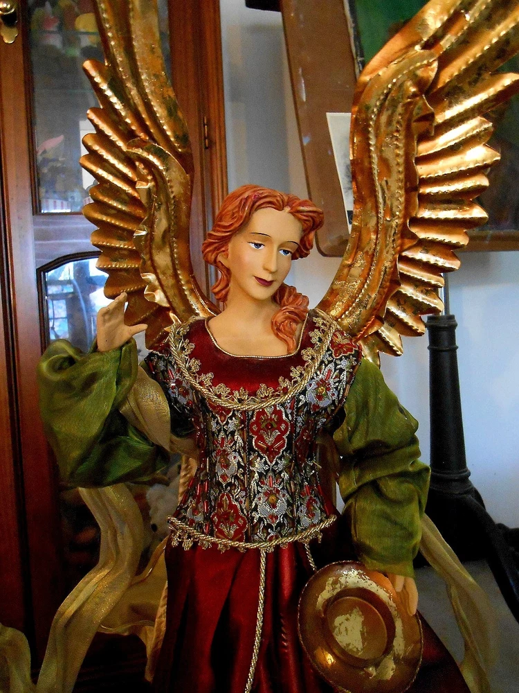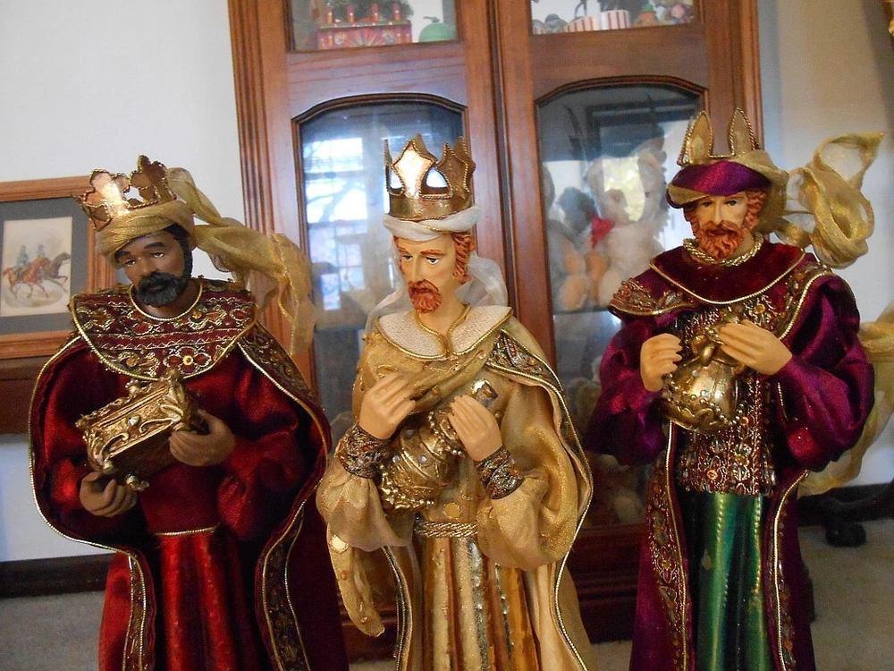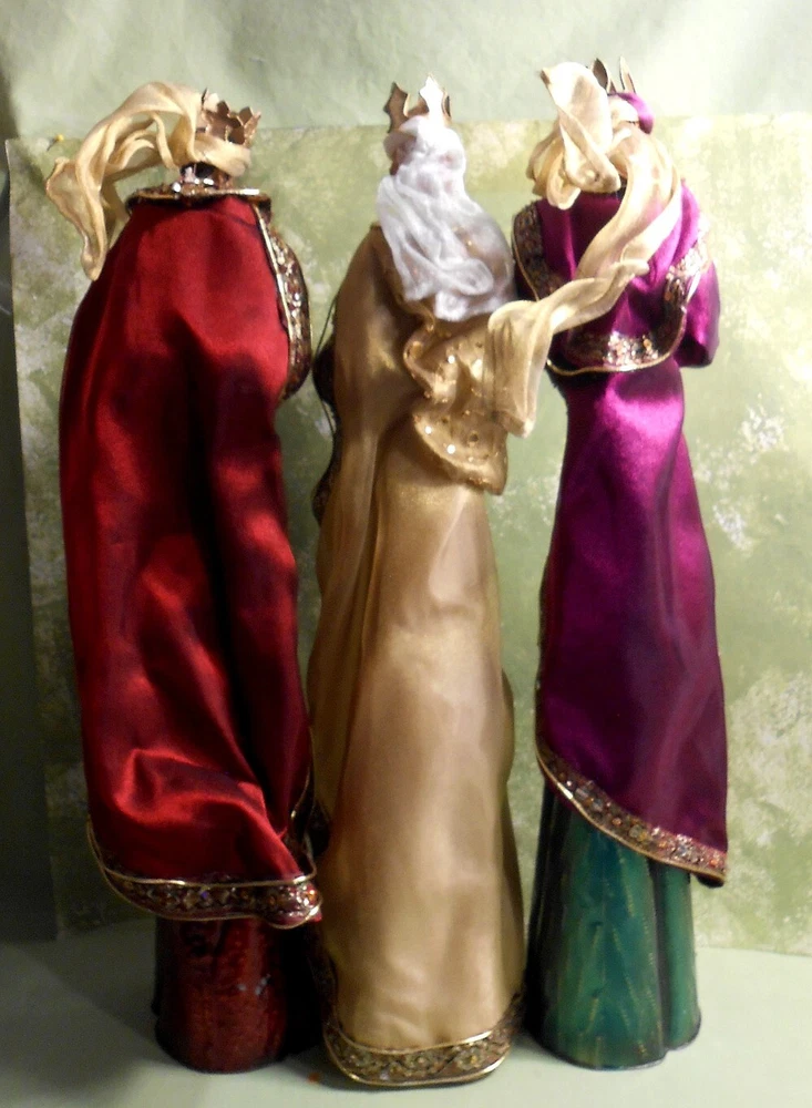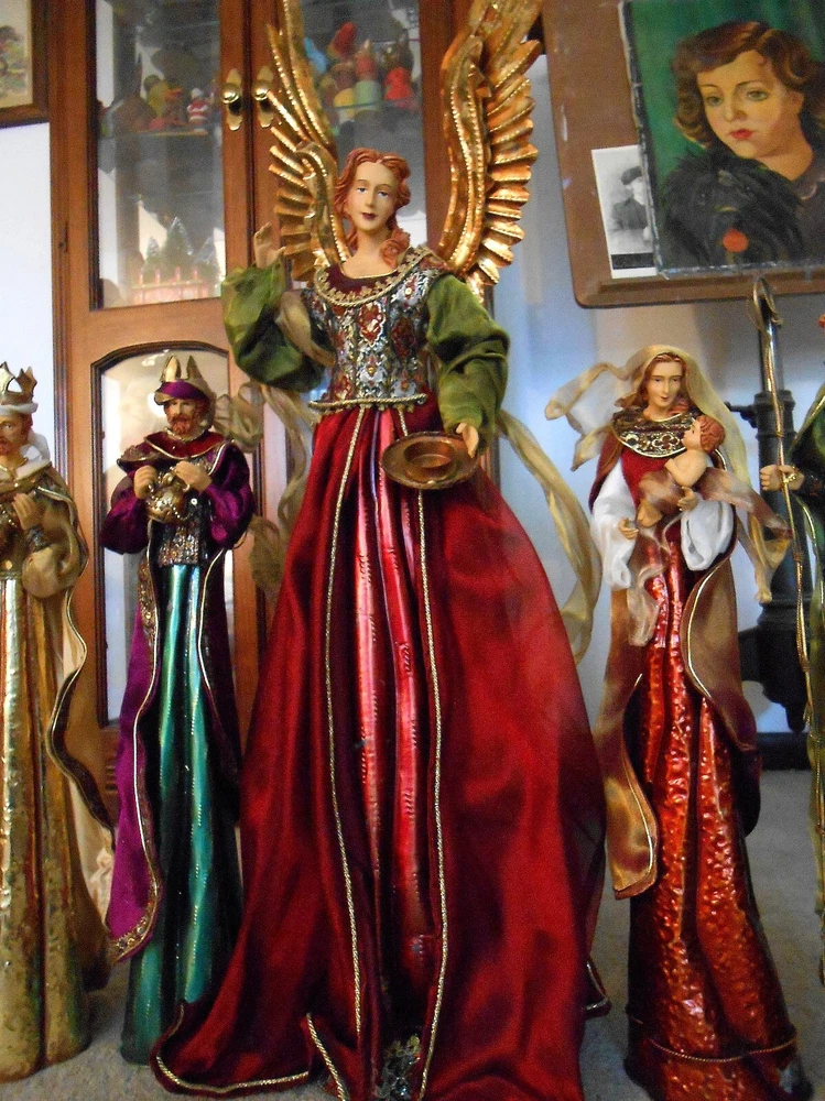 Beautiful Large 28" Nativity Set - Silk, Velvet, Enameled Tin from Philippines Rare large set of Nativity figures made of an enameled tin with weights inside. They are lavish with velvet, silk, and gold accents. Angel is 28" tall to her head or 43" tall to tip of her gold tin wings. The other figures are 21" tall. The angel has a "Philippines" label on the bottom. They are in very nice condition with the exception of a few enamel rubs on the bottom of the Angel and one of the kings. Due to the size and weight of the box shipping is $35.00. I will refund you if it comes to less. I also except pickup.