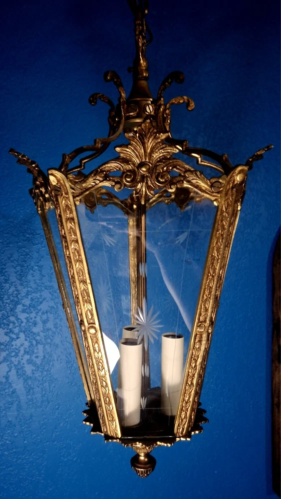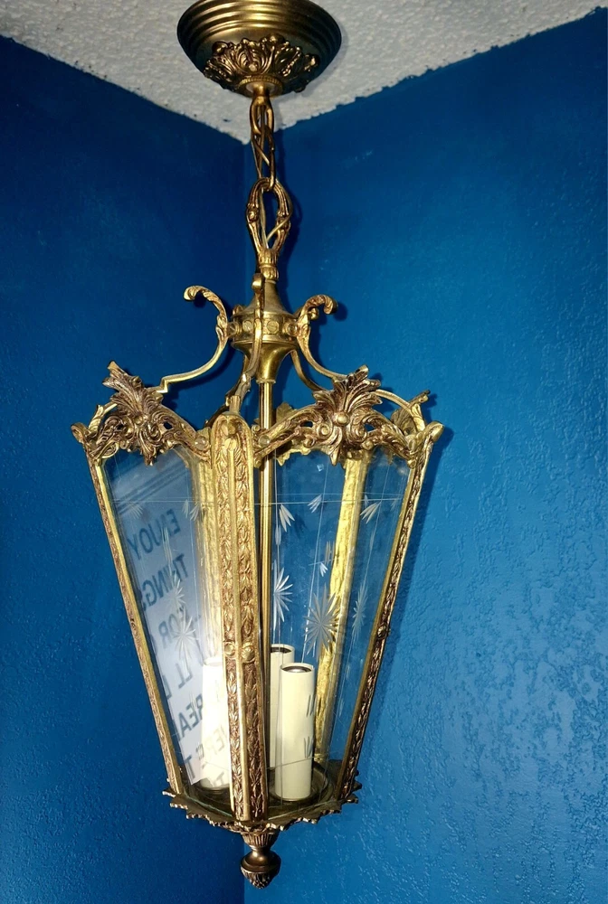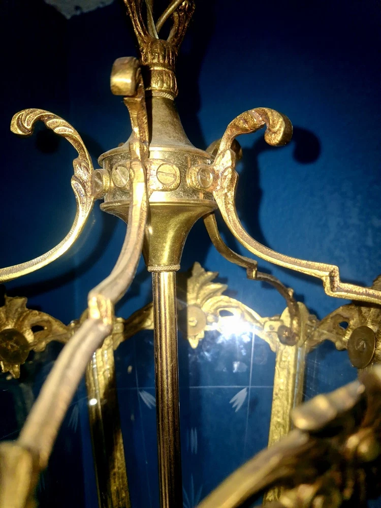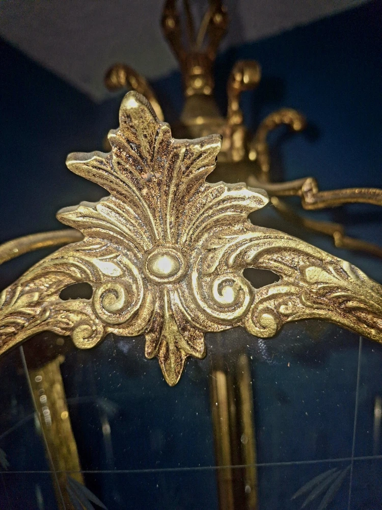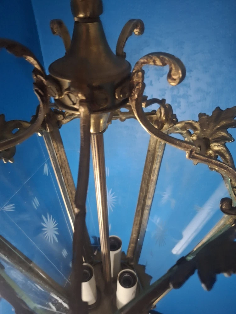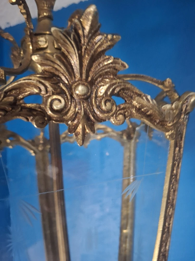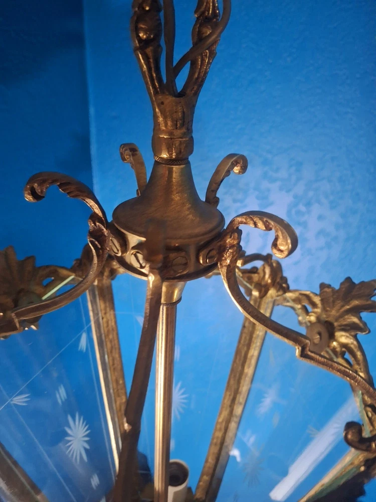 This beautiful vintage chandelier is a stunning piece that will add a touch of elegance to any space. Crafted from gilt brass and featuring intricate etched glass, this medium-sized lantern is a true work of art. With a French style that is both timeless and sophisticated, it is the perfect addition to any room in your home. Whether you're looking to add some character to your living room or create a cozy atmosphere in your bedroom, this antique original chandelier is sure to impress. With its warm gold Brass patina. Lantern measures 22 oe 23 inches from ceiling cover to bottom of Lantern
