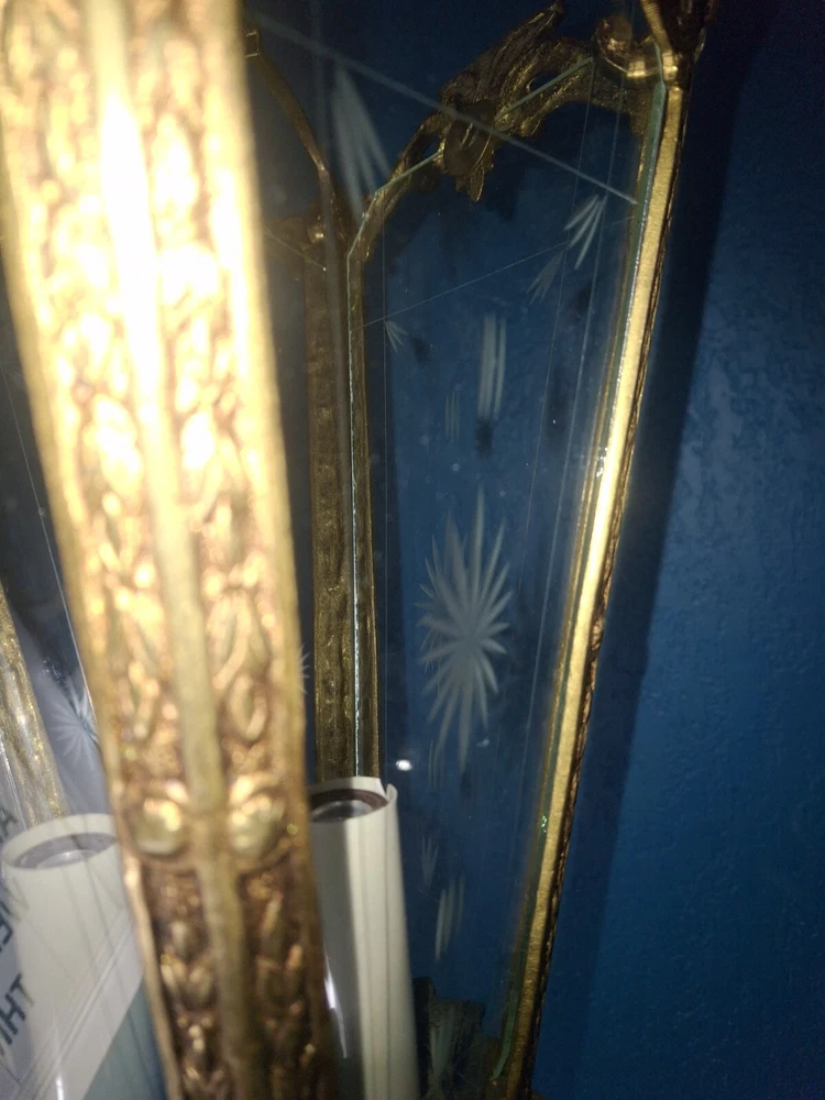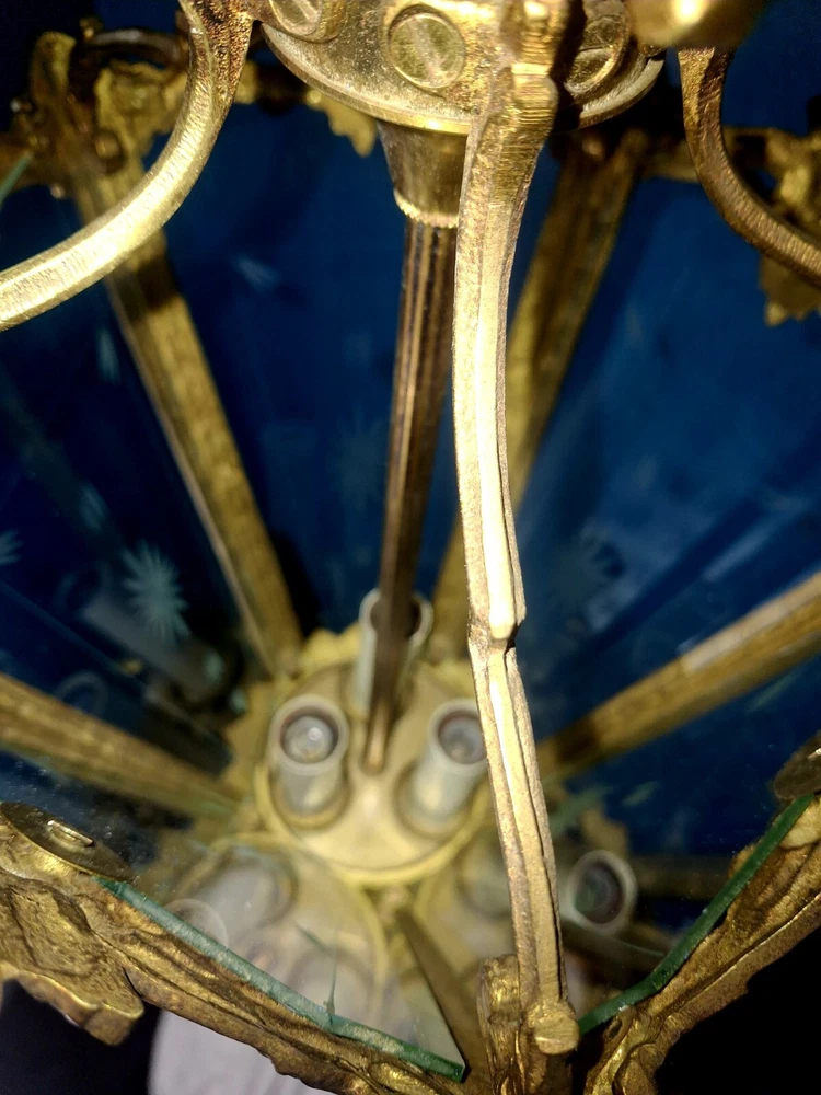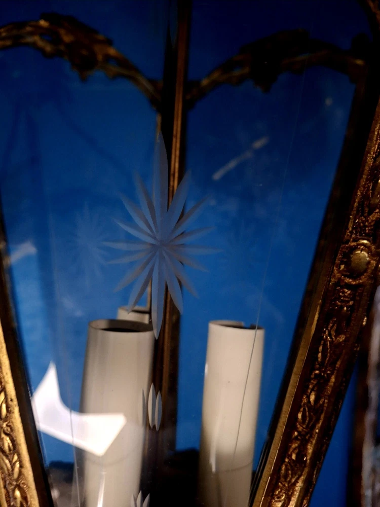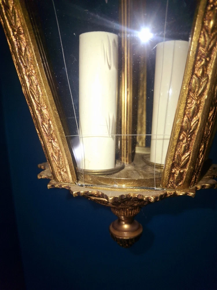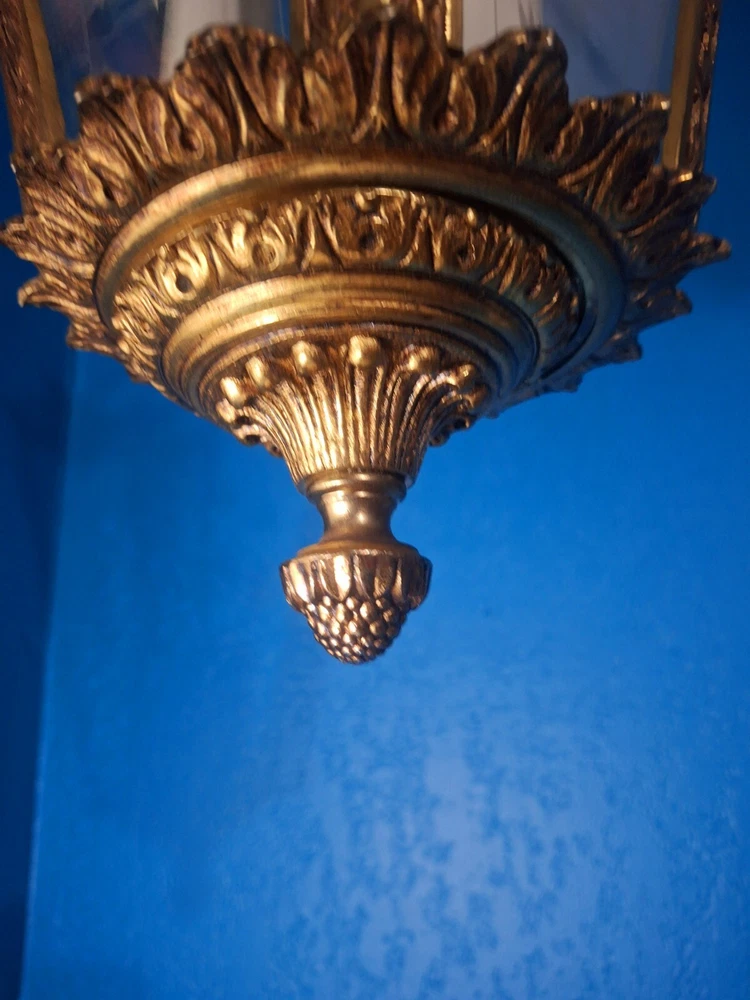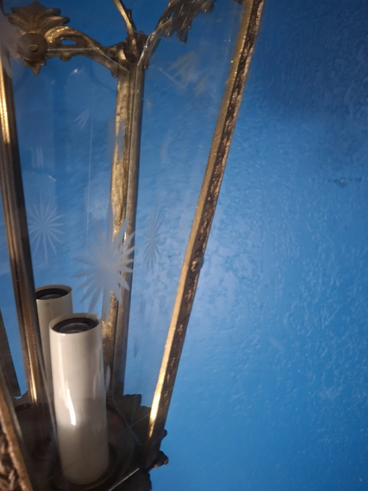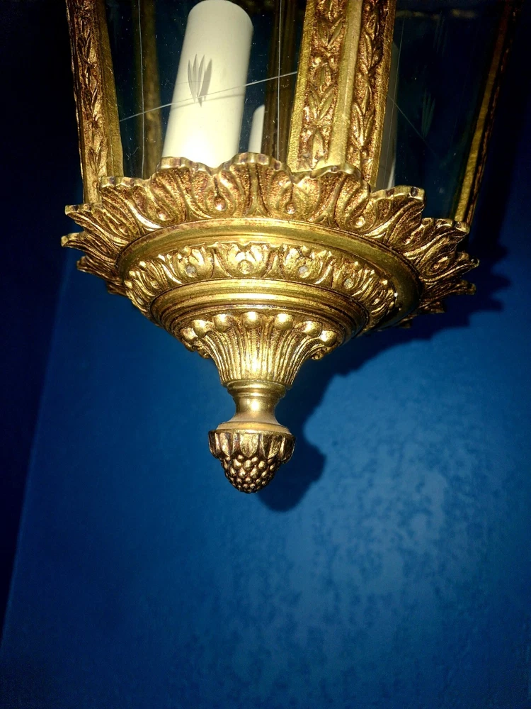 This beautiful vintage chandelier is a stunning piece that will add a touch of elegance to any space. Crafted from gilt brass and featuring intricate etched glass, this medium-sized lantern is a true work of art. With a French style that is both timeless and sophisticated, it is the perfect addition to any room in your home. Whether you're looking to add some character to your living room or create a cozy atmosphere in your bedroom, this antique original chandelier is sure to impress. With its warm gold Brass patina. Lantern measures 22 oe 23 inches from ceiling cover to bottom of Lantern