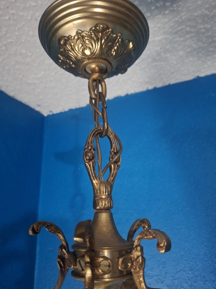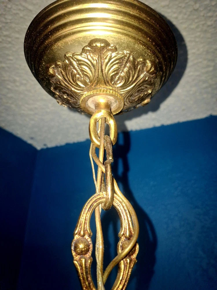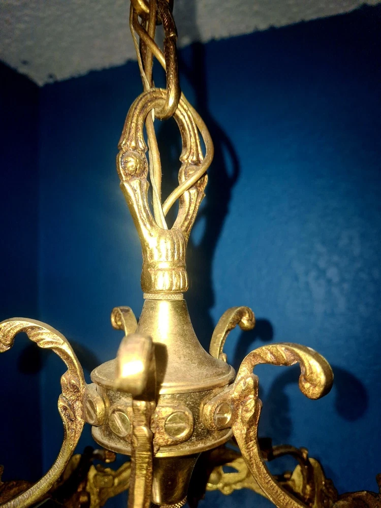 Color: Gold Size: Medium Material: Brass, Glass Original/Reproduction: Antique Original Style: French Type: Chandelier Decade: 1950s