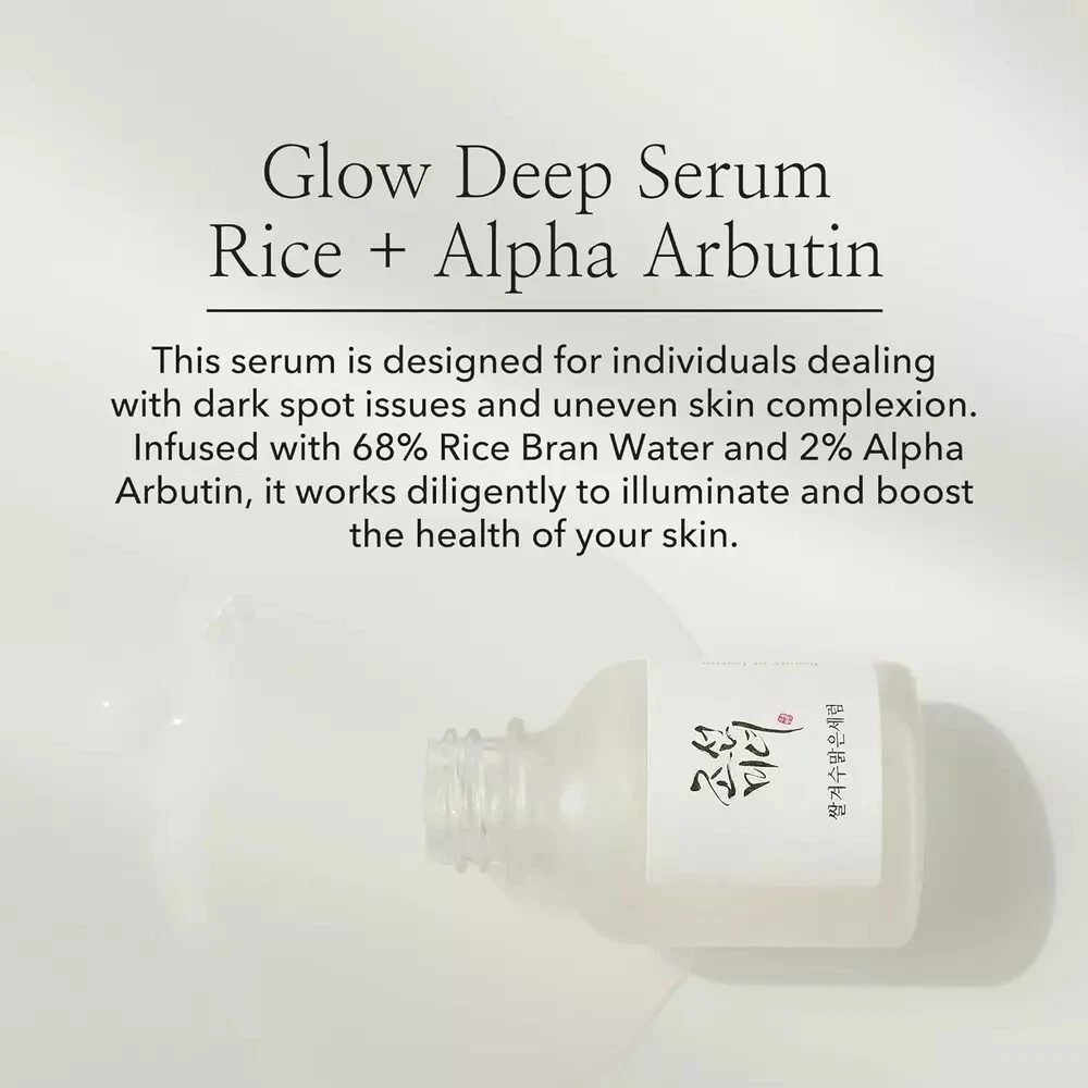Beauty of Joseon Glow Deep Serum Rice + Alpha-Arbutin Description Item model number BOJ-J0011 Color Glow Deep Serum Product Dimensions 1.69 x 1.69 x 3.94 inches; 2.4 ounces Product Benefits Moisturizing,Nourishing Use for Skin, Face Skin Type Sensitive Skin,Dry Skin Scent Fragrance Free Brand Beauty of Joseon Manufacturer Beauty of Joseon Radiant Revelation: Unveil the beauty secrets of Joseon with the Glow Deep Serum, a meticulously crafted blend of rice and alpha-arbutin for unparalleled radiance. Address dark spots, discoloration, and acne scars with a powerful formula enriched with rice and alpha arbutin. Korean Skincare Essential: Elevate your skincare routine with the Beauty of Joseon Glow Deep Serum, a commitment to timeless k-beauty secrets that unlocks the path to glowing, flawless skin. Key Ingredients: Rice Water 68%: Moisturizing, hydration and glowing. Alpha-Albutin 2%: Radiance, dark spots, skin protection and pigmentation. Niacinamide: Skin tone, skin barrier and acne care. Deep Hydration, Rice Bran: Rice bran water moisturizes, enhances suppleness. Experience intense hydration alongside pigmentation correction for ultimate skin health. Tackle Skin Concerns: Suited for all skin types, even sensitive. Tackle uneven tone, dark spots, and dryness. Reveal luminosity and confidence in your skin's journey. Product Description 1 Less Melanin Production 2 Intense Hydration 3 Illuminates Skin Tone Key Ingredients 68% Rice Bran Water Rice has played a very important role as a staple food and skin care ingredient in Korean history. In the Joseon Dynasty, rice bran water was used like the toner of today, and was called Beauty Water. Rice bran is rich in amino acids and minerals, helping to moisturize dry skin. 2% Alpha-Arbutin Alpha-Arbutin works by inhibiting the tyrosinase activity that limits the melanin production in your skin. It is also known to have a 10 times greater effect than regular Beta-Arbutin. What skin types can use it? Suitable for all skin types. In particular, it is designed for concerns about dull skin tone and pigmentation. Since your skin may react sensitively to alpha arbutin if you have sensitive skin, it is recommended to perform a patch test before use. Please recommend the best match? For skin pigmentation, try layering with Revive Serum and Ginseng Essence Water that contain saponin-rich ginseng water. Can I use it both day and night? Yes, you can. However, alpha arbutin is vulnerable to light and heat, so it is recommended for use in the evening. Do I need to keep it refrigerated? Avoid direct sunlight and store it in a cool, dark place. Alpha-arbutin is vulnerable to light and heat, so please use it as soon as possible after opening. See Other Beauty of Joseon Serums Add to Cart Add to Cart Add to Cart Add to Cart Add to Cart Customer Reviews 4.4 out of 5 stars 7,188 4.4 out of 5 stars 147 4.4 out of 5 stars 7,188 4.4 out of 5 stars 7,188 4.4 out of 5 stars 7,188 Price $16.65 $ 16 . 65 $17.00 $ 17 . 00 $16.35 $ 16 . 35 $16.24 $ 16 . 24 $16.70 $ 16 . 70 Skin Concern Dark Spots & Uneven Tone Dark Spots & Uneven Tone Pores + Sebum Wrinkles + Dryness Acne + Breakouts Key Benefit Fades Dark Spots Improves Skin Tone Manages Sebum and Moisture Skin Vitality + Elasticity Soothing + Moisturizing Key Ingredients Rice +Alpha-Arbutin Centella + Vitamin C Propolis + Niacinamide Ginseng + Snail Mucin Green tea + Panthenol Vegan ✔ ✔ ✘ ✘ ✔ Cruelty-free ✔ ✔ ✔ ✔ ✔