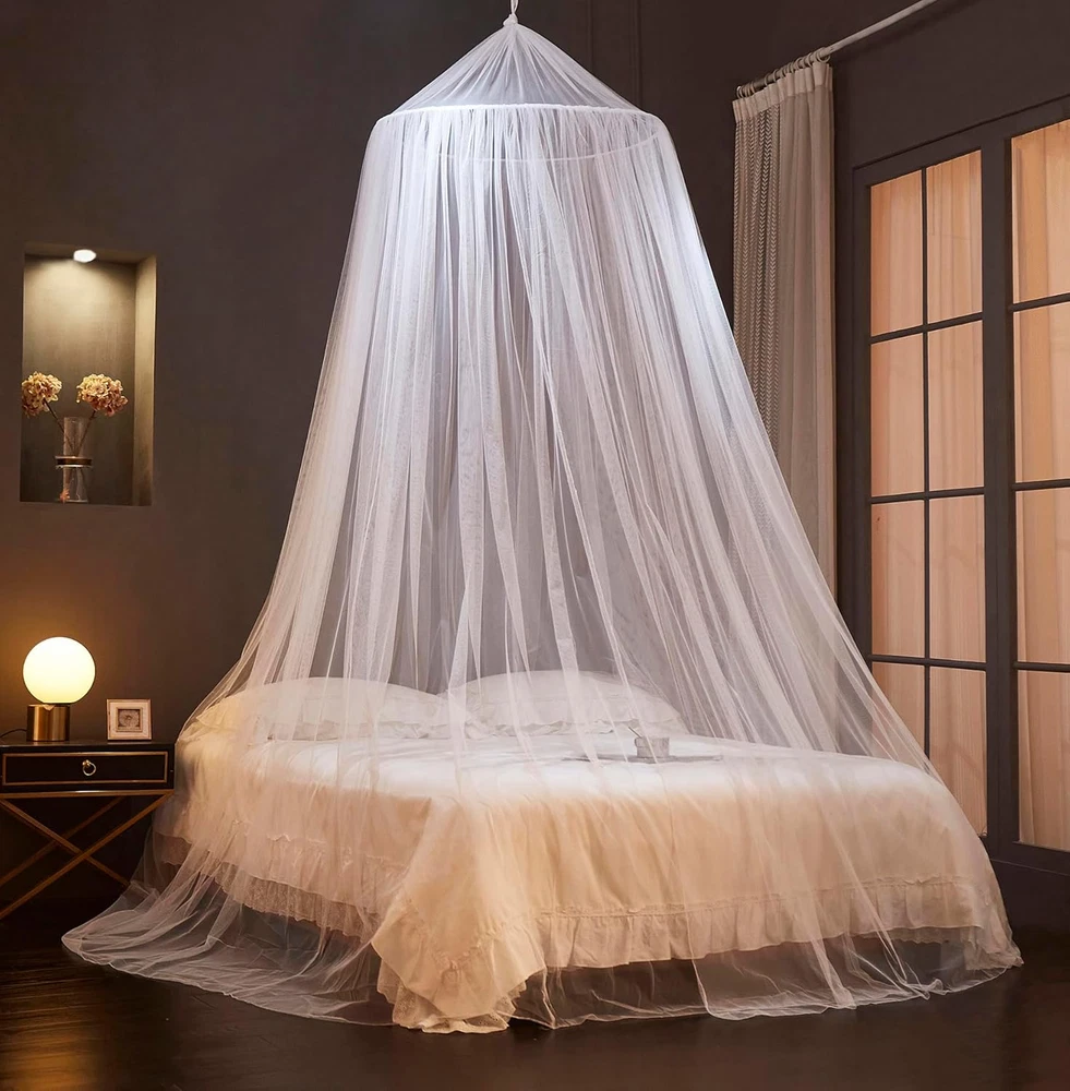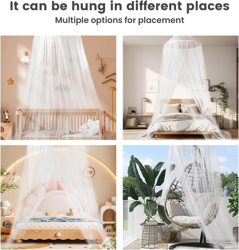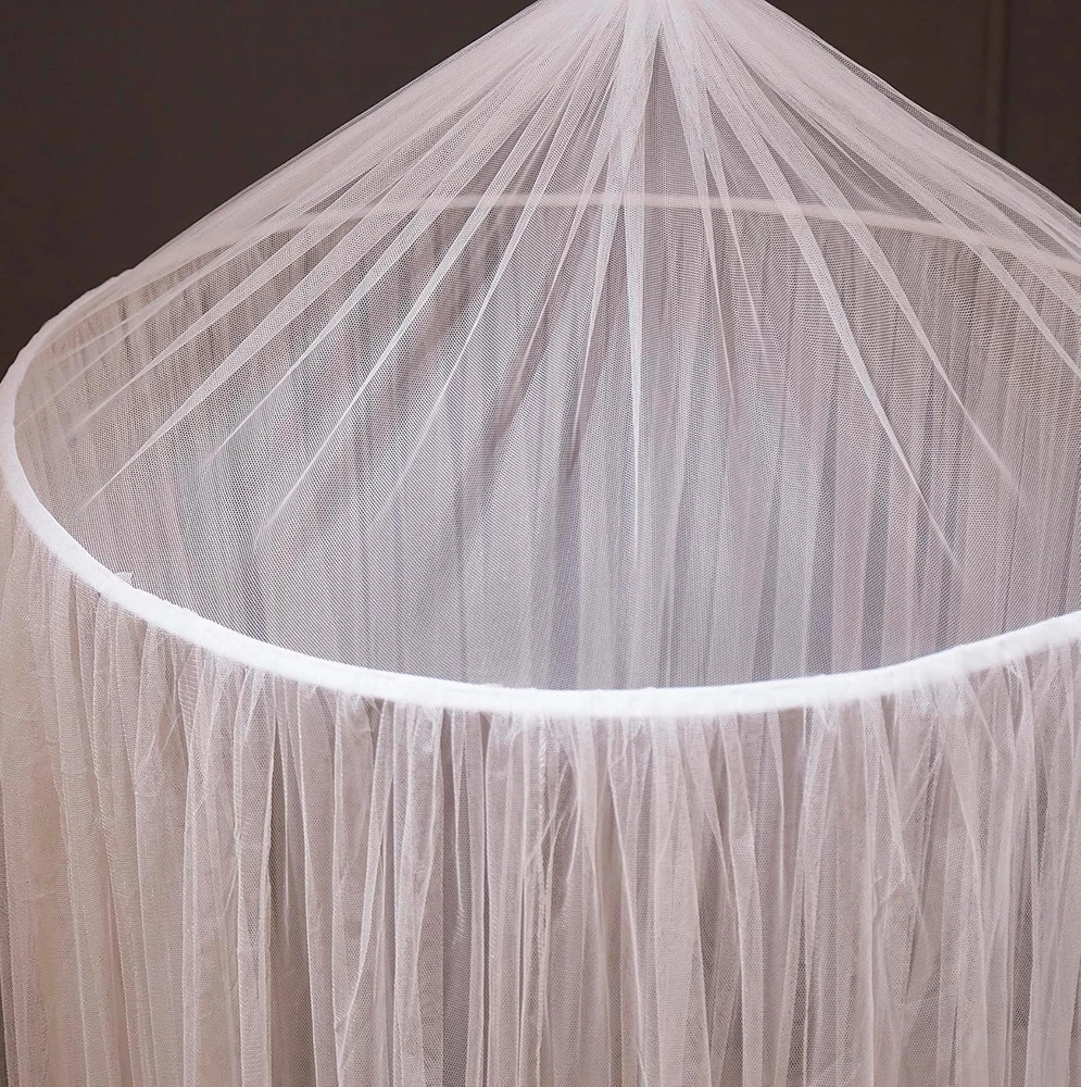 Perfect Size:90" H; hoop measures 23" in diameter; 400" around the base, Suitable for Various Bed,including Single bed/Twin bed/full bed/queen king bed/daybed/bunk bed Premium-Quality Materials:100% Polyester, 50D, 380 Meshes per sq inch, Fire Retardant Fabric,don't have any special coating or treatment,.The mesh is so small that mosquitoes/bed bugs can't get into the net. Keep you from mosquitoes all night. Easy To Use:This Mosquito Net has one opening for easy entrance.All the installation accessories are attached to the mosquito net,It came with a sticky pad thing and a screw hook, so you can choose how to hang it up.With the included ropes, you can adjust the height of the Mosquito Net until the bottom edge completely touches the floor. All-Round Protection : Classical 4 openings design, easy access,provides you a 4 dimensional space of comfort ,offer all sides protections for your family, helps keep flies, bites, and other insects away from your skin. 100% Satisfaction Guaranteed: If you have any questions or need our help, please contact us. You can email us or call us on Amazon. We will solve the problem for you as soon as possible. Thank you for choosing our bed canopies for your kids. Mosquito Net Bed Canopy