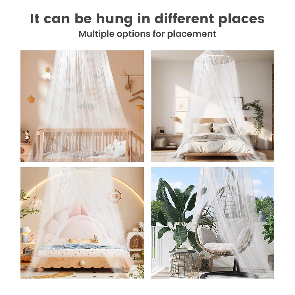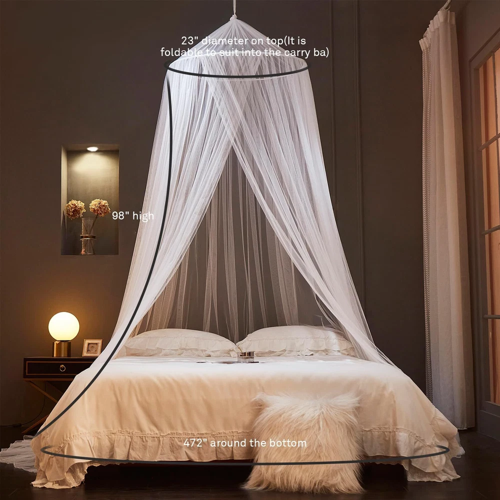Mosquito Net Bed Canopy Perfect Size:90" H; hoop measures 23" in diameter; 400" around the base, Suitable for Various Bed,including Single bed/Twin bed/full bed/queen king bed/daybed/bunk bed Premium-Quality Materials:100% Polyester, 50D, 380 Meshes per sq inch, Fire Retardant Fabric,don't have any special coating or treatment,.The mesh is so small that mosquitoes/bed bugs can't get into the net. Keep you from mosquitoes all night. Easy To Use:This Mosquito Net has opening for easy entrance.All the installation accessories are attached to the mosquito net,It came with a sticky pad thing and a screw hook, so you can choose how to hang it up.With the included ropes, you can adjust the height of the Mosquito Net until the bottom edge completely touches the floor. All-Round Protection : Classical 4 openings design, easy access,provides you a 4 dimensional space of comfort ,offer all sides protections for your family, helps keep flies, bites, and other insects away from your skin. 100% Satisfaction Guaranteed: If you have any questions or need our help, please us. You can us or us on . We will solve the problem for you as soon as possible. Thank you for choosing our bed canopies for your .