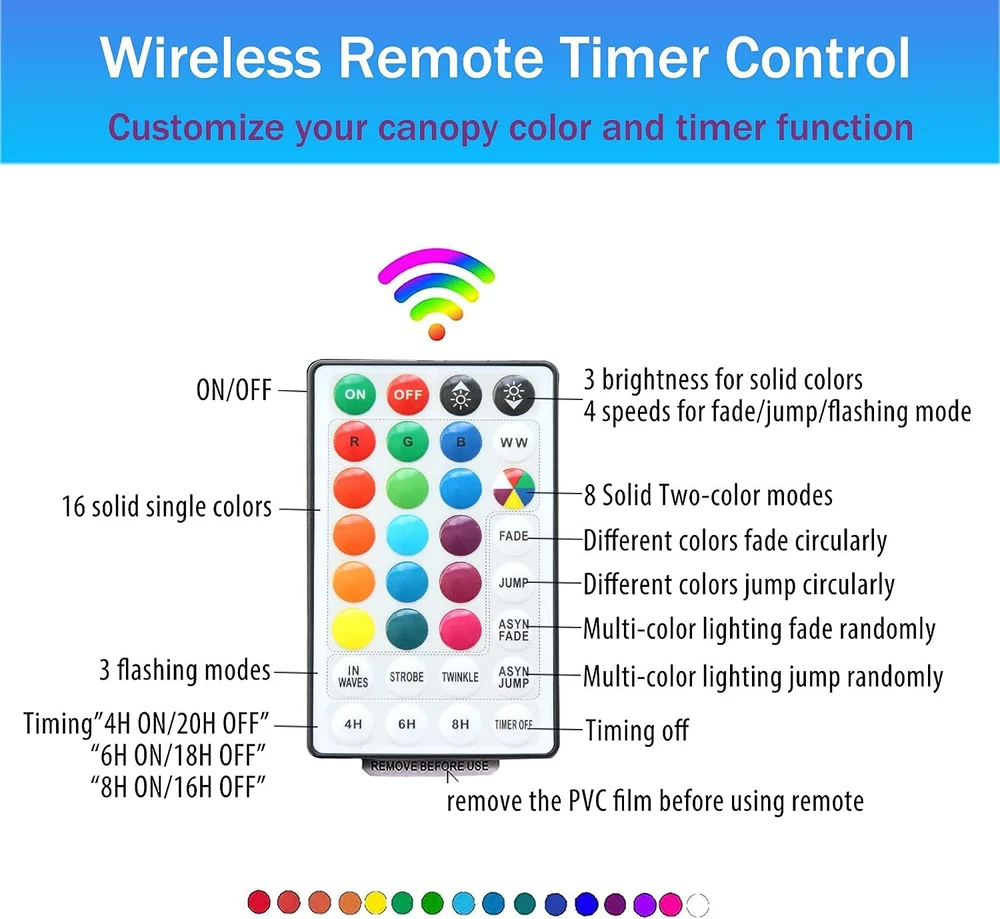 This princess bed Canopy is an new design. There are 100 LED star lights with 18 colors options and multicolor. Pink for princess, blue for Brave knight, purple for queen, red/blue/white lights for 4th July, multi-color for Christmas decor etc This gift packaging starry bed canopy will surprise your girls and boys. There are 100 shining stars accompany your girls to sleep, which illuminates the bedroom with floating stars around the bed The canopy string lights can be controlled with remote. There are 18 different color options and 7 multicolor(twinkling and flashing). It also has 3 timer (4 hours on/20 hours off, 6 hours on/18 hours off, 8 hours on/16 hours off) The round canopy with different light colors bring you sweet dream in summer night It’s easy to set up. The canopy is applicable to various types of bed,such as twin bed,full bed,king bed,queen bed. Set it up either in bedroom or anywhere else you like Product Description Obrecis Bed Neting Canopy with Fairy Starry Lights Want to make some summer fun for your girls? Now, let’s create a dream starry sky for your girls with this color change starry bed canopy curtain. Fit Various Bed Round dome, 1 Entry SIZE: 2.5m/8.2ft in height, 12m/39.4ft in circumference of bottom fit various size bed, including single, twin,queen, king size bed MATERIAL: 100% Polyester, high quality soft & light fabric mesh LED : 100 LED fairy string lights Canopy Bed with Color Changing Star 16 solid color + 8 multicolor—Meet the needs of us. You can customize the shape and color of the light string to decorate the bedroom, welcome to share your ideas with us. Remote Control 32 key unique solid two-color modes design remote control 3 Timer mode (4h on/20h off, 6h on/18h off, 8h on/16h off) 4 flashing speed For Girls Bedroom Sleep under wonderful starry sky Ideal gift for your princess, fill the room with joy and surprise For Outside Camping Creat a funny playhouse tent for girls For Nursery Bed Allowing your girls and boys a peaceful and relaxing sleep