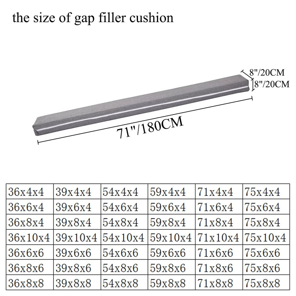 【※ Bed Gap Filler Size】 Pillow wedge for headboard gap fits perfectly to your bed gap or sofa gap. ★ NOTE: As bed crack pillow is vacuum packaging, please remove the vacuum bag, and shake vigorously every place for a while, and headboard space filler will restore its original shape after 48 hours later. 【※ Premium quality Material】Mattress extender cover is made of premium quality linen fabric, breathable, delicate touch; insert is filled with upgraded environmental-friendly foam, excellent density and high resilience can give you long-lasting comfort when leaning against the headboard 【※ Removable & Washable Cover】Mattress gap filler cover are made with zippered cover which is removable and washable. Zipper lock keeps cushion tight closed and assists in cushion stuffing. 【※ More Practical & beautiful】 All size include 36 inches, 39 inches, 54 inches, 59 inches, 71 inches and 75 inches (Twin, Full, Queen, King, California King), give you more option. Putting this bed crack pillow during bed gap or sofa gap, will reduce the trouble of dropping things for you, and let your home more beautiful. 【※ Multi-purpose Usage】This soft flexible pillow can be used as wedge headboard pillow, bed gap filler, mattress extender, mattress gap filler. Works great between wall and mattress, or as sofa back support cushion. You can even use it as foot rest for under desk. 【※ Bed Gap Filler Size】 Pillow wedge for headboard gap fits perfectly to your bed gap or sofa gap. ★ NOTE: As bed crack pillow is vacuum packaging, please remove the vacuum bag, and shake vigorously every place for a while, and headboard space filler will restore its original shape after 48 hours later. 【※ Premium quality Material】Mattress extender cover is made of premium quality linen fabric, breathable, delicate touch; insert is filled with upgraded environmental-friendly foam, excellent density and high resilience can give you long-lasting comfort when leaning against the headboard 【※ Removable & Washable Cover】Mattress gap filler cover are made with zippered cover which is removable and washable. Zipper lock keeps cushion tight closed and assists in cushion stuffing. 【※ More Practical & beautiful】 All size include 36 inches, 39 inches, 54 inches, 59 inches, 71 inches and 75 inches (Twin, Full, Queen, King, California King), give you more option. Putting this bed crack pillow during bed gap or sofa gap, will reduce the trouble of dropping things for you, and let your home more beautiful. 【※ Multi-purpose Usage】This soft flexible pillow can be used as wedge headboard pillow, bed gap filler, mattress extender, mattress gap filler. Works great between wall and mattress, or as sofa back support cushion. You can even use it as foot rest for under desk.