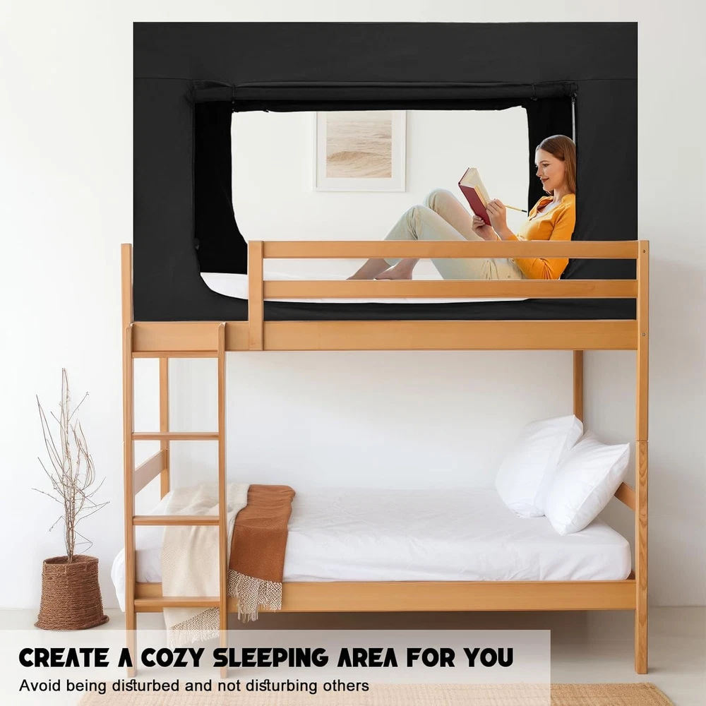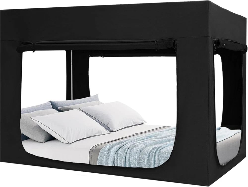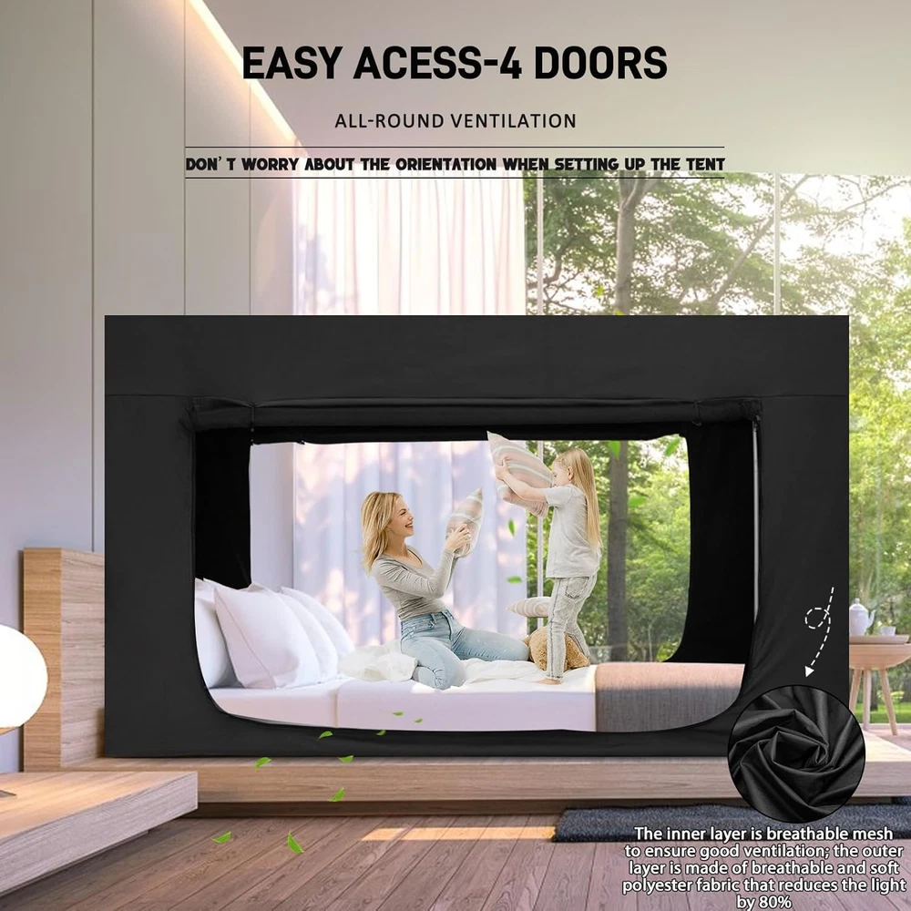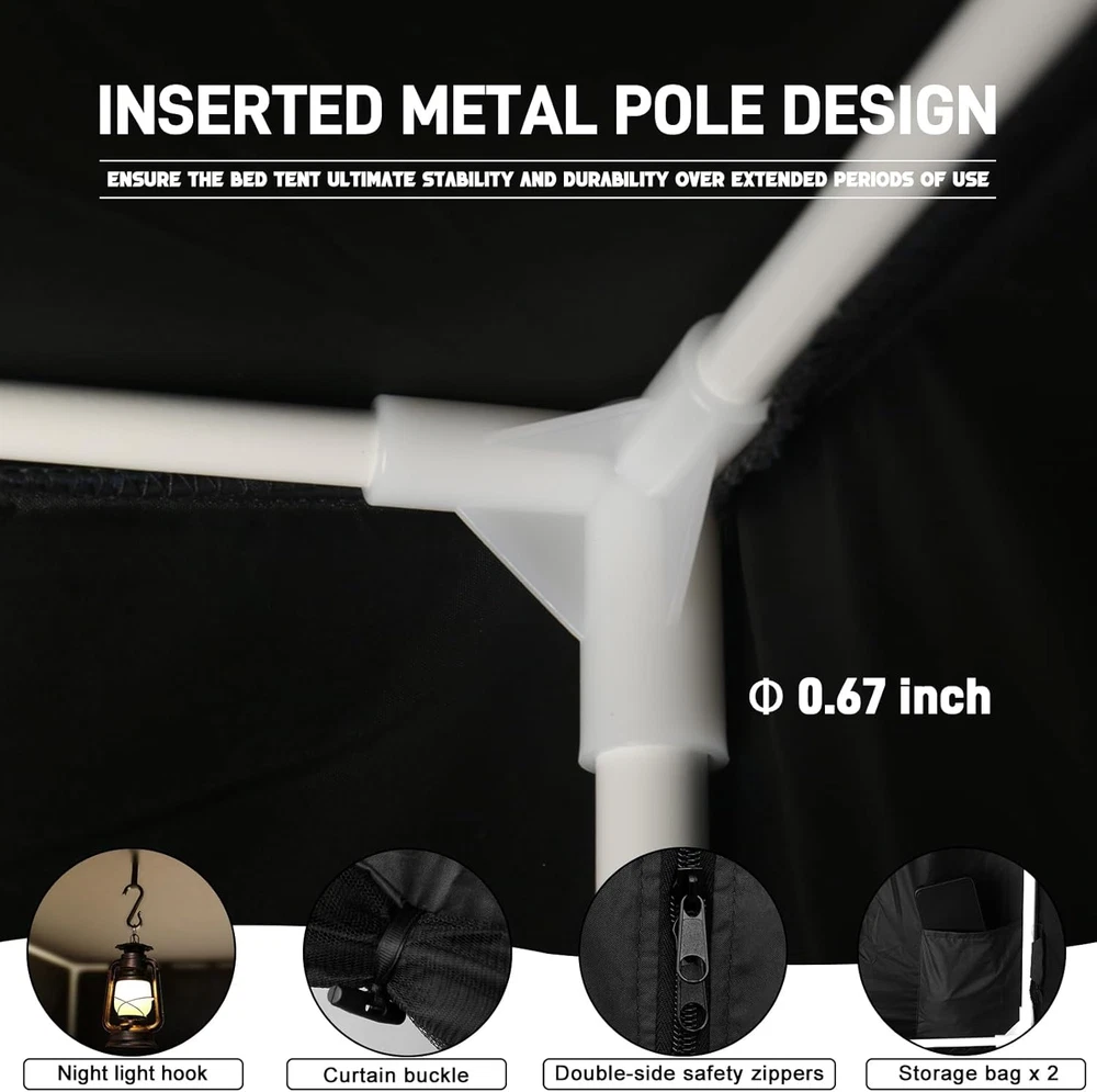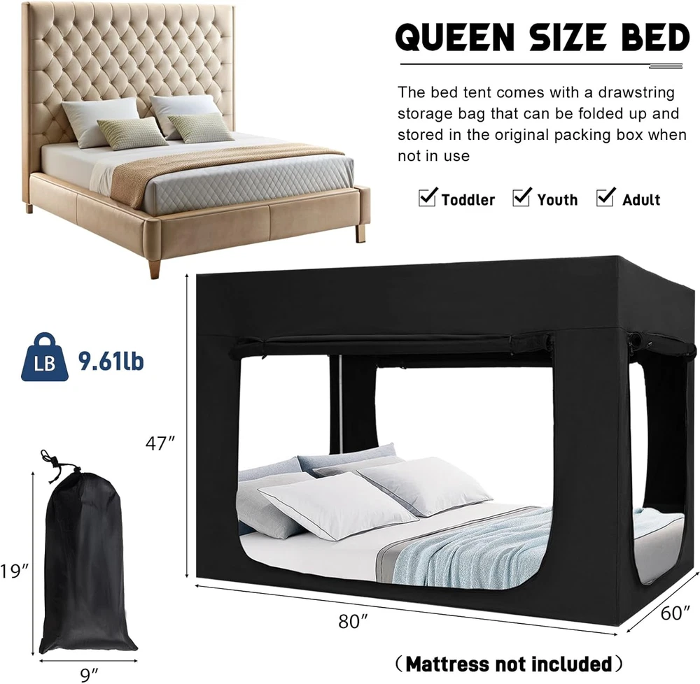 ☑Reinforced Rectangular Design: Our bed tents feature a unique inserted pole design, compared to pop-up tents on the market, we use 0.67inch diameter metal poles to build the rectangular frame of the bed tents, which help this bunk twin bed tent ensure ultimate stability and durability over extended periods of use. ☑Cozy Sleeping Space: This bunk twin bed tent measures 80 x 60 x 47 inches, made of breathable and soft polyester fabric. The dark black fabric can reduce most of the light and is great for bedrooms, dorm rooms, or those who have trouble sleeping in bright environments, creating a cozy space to sleep in. ☑Easy Acess-4 Doors: This bed tent has 4 spacious large doors with double zippers that can be opened or closed inside and outside, making it easy for you to get in and out and don't worry about the orientation when setting up the tent. Each door has two layers of panels: the first layer is breathable mesh to ensure good ventilation; the second layer is black sponge fabric that reduces the light by 80%, you can choose the right light according to your needs, create your own sleeping oasis. ☑Multifunctional Design: There are 2 storage pockets inside the bed tent to place items. 2 zipper opening to place the charging cable, and 1 night light hook. Reflective zipper pulls allow you to quickly find the zipper door in the dark. ☑Easy to Intall and Store: A detailed installation manual is included in the package, it only takes a few minutes to install. In addition, the bed tent comes with a drawstring storage bag that can be folded up and stored in the original packing box when not in use. Bed Tent Bed Canopy Tents for Adult and Kids - Portable Sleeping Bed Tents 80% Blackout with 4 Doors Breathable Private Space Tents(Mattress Not Included) Dimensions Size: Queen Color: Black
