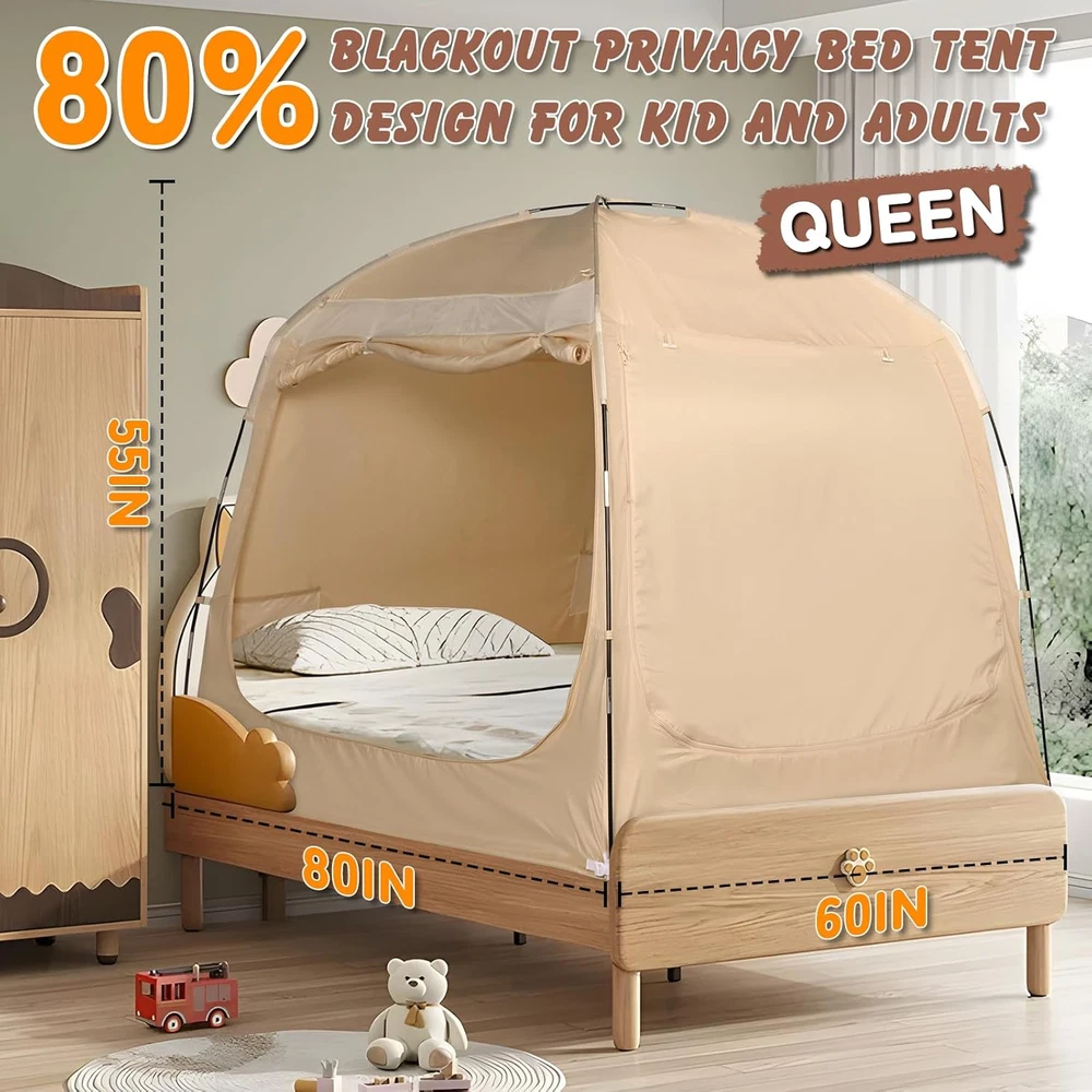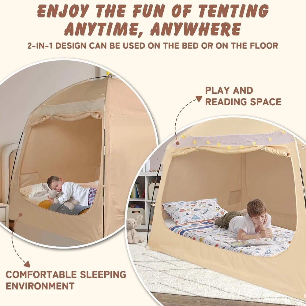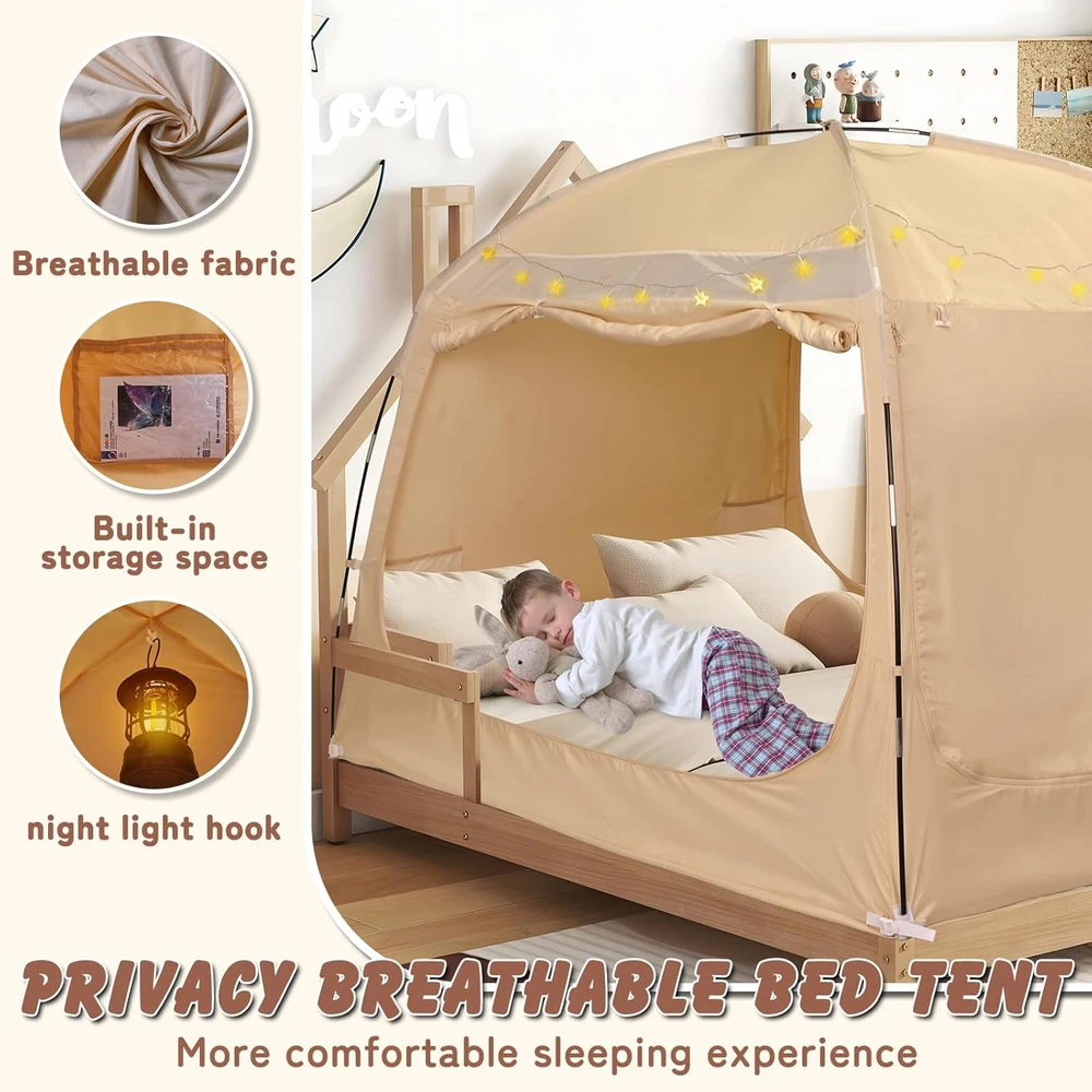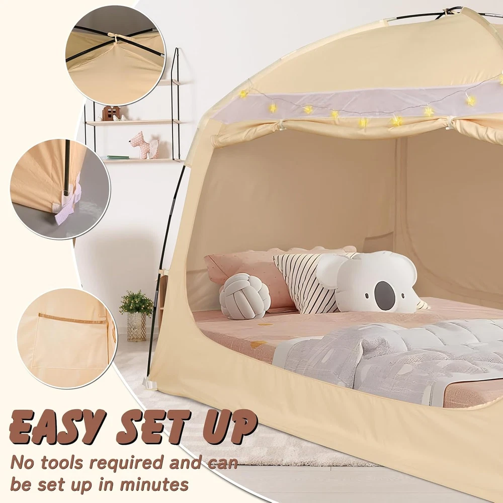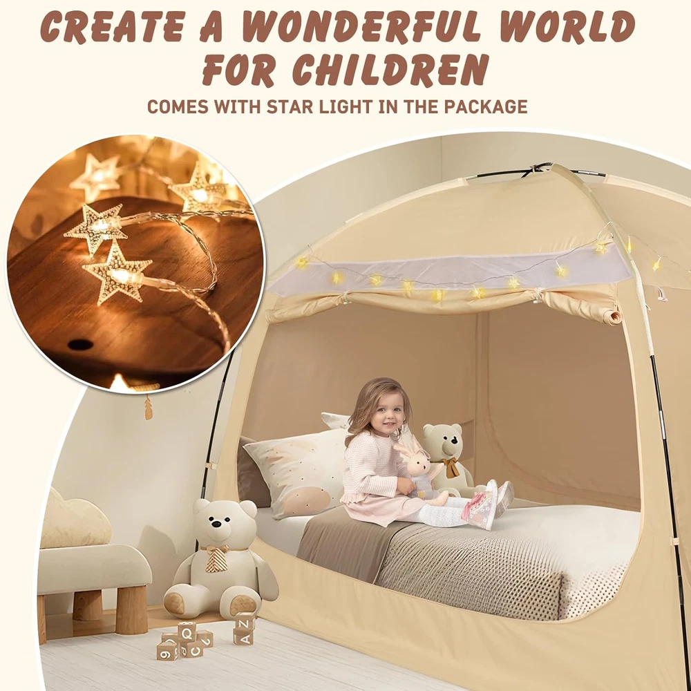 Sleep Oasis - Hazacl bed tent with 80% blackout and effective noise reduction, our bed tents shield you from light and sound disturbances, ensuring you enjoy uninterrupted sleep. Large space kids play tent - The Hazacl bed tent features a unique dome castle shape, providing children with their private fortress for playing, relaxing, and reading. Its spacious design accommodates multiple children, perfect for play and group activities. The included star-shaped light strip inside the tent can cultivate children's imagination and creativity, allowing children to immerse themselves in endless adventurous fun. Easy to set up - Thanks to the excellent structural design of the bed tent, you can create a unique, sturdy, and private sleeping space in just a few minutes without tools. It is more convenient to disassemble and reassemble, making it very suitable for travel. High Quality Materials - The Hazacl Bed Tent is made of machine washable premium breathable polyester fabric to ensure a comfortable and ideal sleeping environment. The sturdy fiberglass pole frame can withstand children's active play and remain stable. Versatile Design - The bed tent offers thoughtful, user-friendly designs to enhance your sleep and play experience. The top of the tent features a nightlight hook for dark reading, two storage pockets, and a transparent pocket for iPad viewing. Adjustable corner straps ensure the tent fits snugly to your bed, creating a cozy and immersive space. Ideal Gift: This bed tent can not only bring you a better sleeping experience but also be a relaxing game fortress for children, the included star-shaped strip lights add more fun making it a perfect gift for boys and girls. Hazacl bed tent comes with professional customer service. If you have any questions or concerns, please contact us. We will respond to you within 24 hours and do our best to solve the problem. Product Description