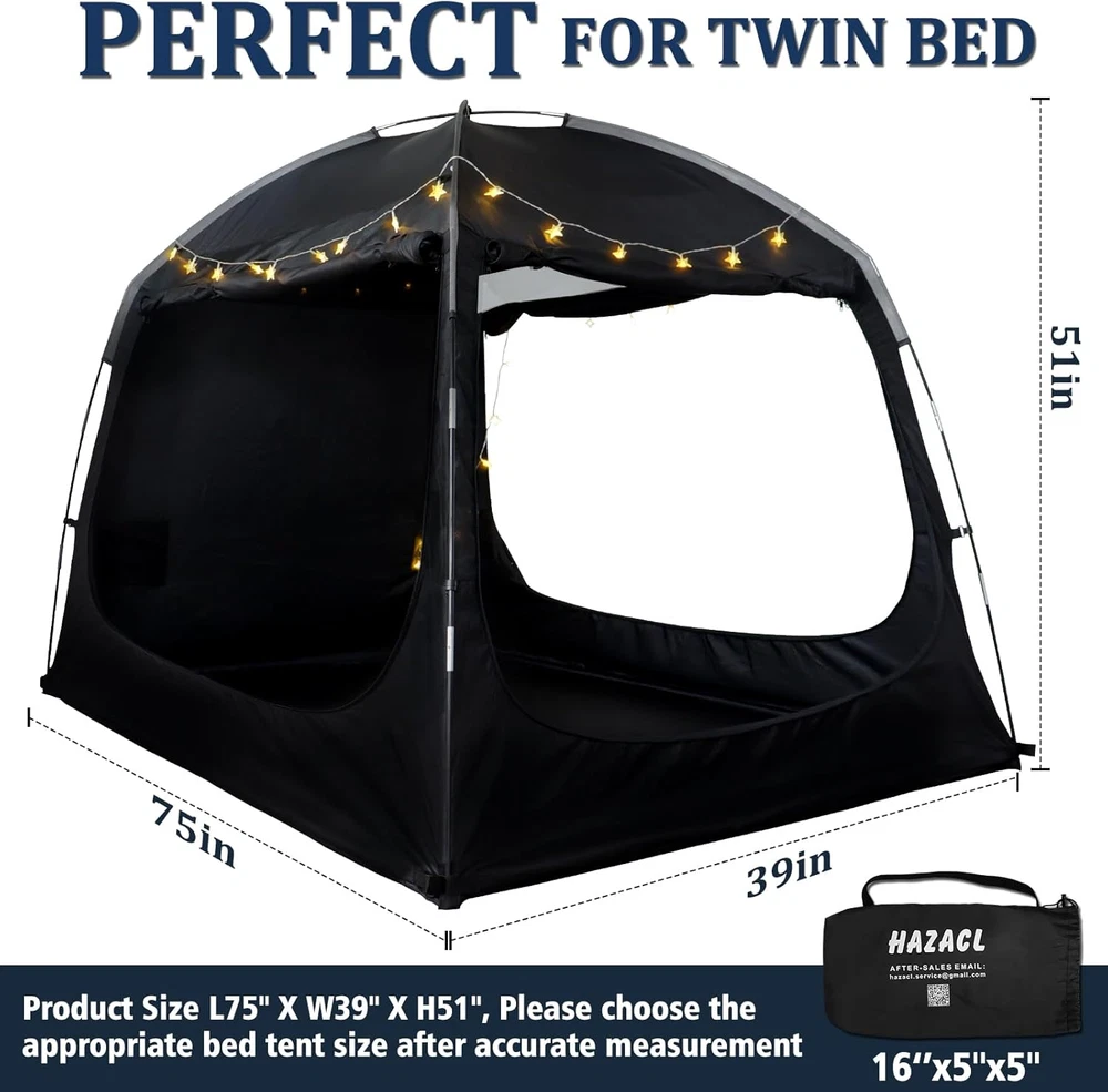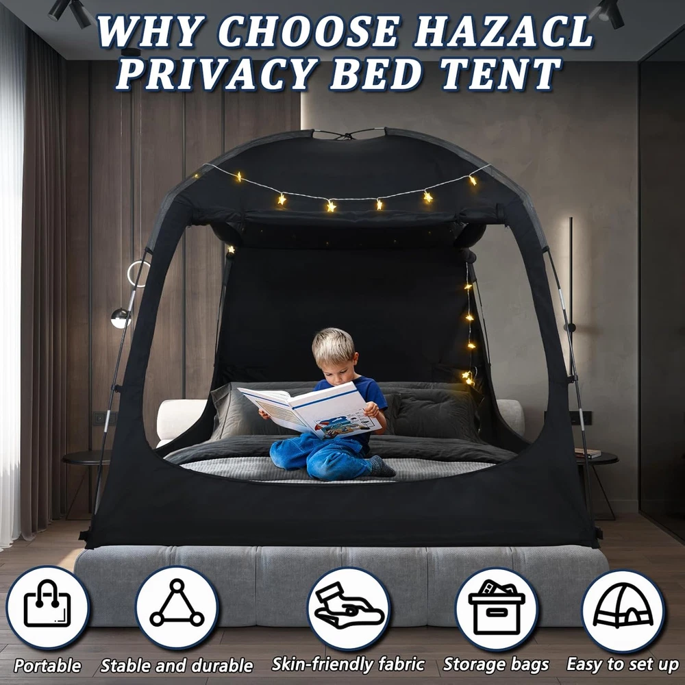 Polyester Imported Sleep Oasis - Hazacl bed tent with 80% blackout and effective noise reduction, our bed tents shield you from light and sound disturbances, ensuring you enjoy uninterrupted sleep. Large space kids play tent - The Hazacl bed tent features a unique dome castle shape, providing children with their private fortress for playing, relaxing, and reading. Its spacious design accommodates multiple children, perfect for play and group activities. The included star-shaped light strip inside the tent can cultivate children's imagination and creativity, allowing children to immerse themselves in endless adventurous fun. Easy to set up - Thanks to the excellent structural design of the bed tent, you can create a unique, sturdy, and private sleeping space in just a few minutes without tools. It is more convenient to disassemble and reassemble, making it very suitable for travel. High Quality Materials - The Hazacl Bed Tent is made of machine washable premium breathable polyester fabric to ensure a comfortable and ideal sleeping environment. The sturdy fiberglass pole frame can withstand children's active play and remain stable. Versatile Design - The bed tent offers thoughtful, user-friendly designs to enhance your sleep and play experience. The top of the tent features a nightlight hook for dark reading, two storage pockets, and a transparent pocket for iPad viewing. Adjustable corner straps ensure the tent fits snugly to your bed, creating a cozy and immersive space. Ideal Gift: This bed tent can not only bring you a better sleeping experience but also be a relaxing game fortress for children, the included star-shaped strip lights add more fun making it a perfect gift for boys and girls. Hazacl bed tent comes with professional customer service. If you have any questions or concerns, please contact us. We will respond to you within 24 hours and do our best to solve the problem. Product Description