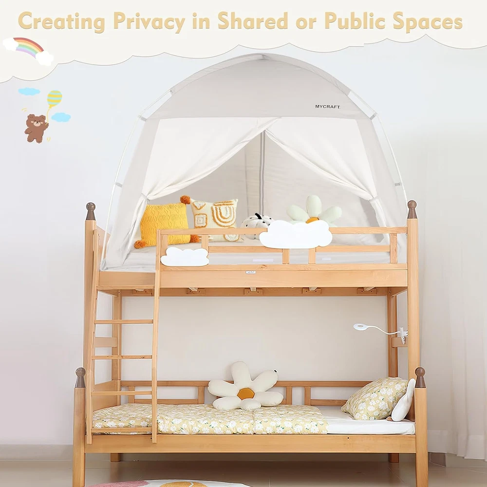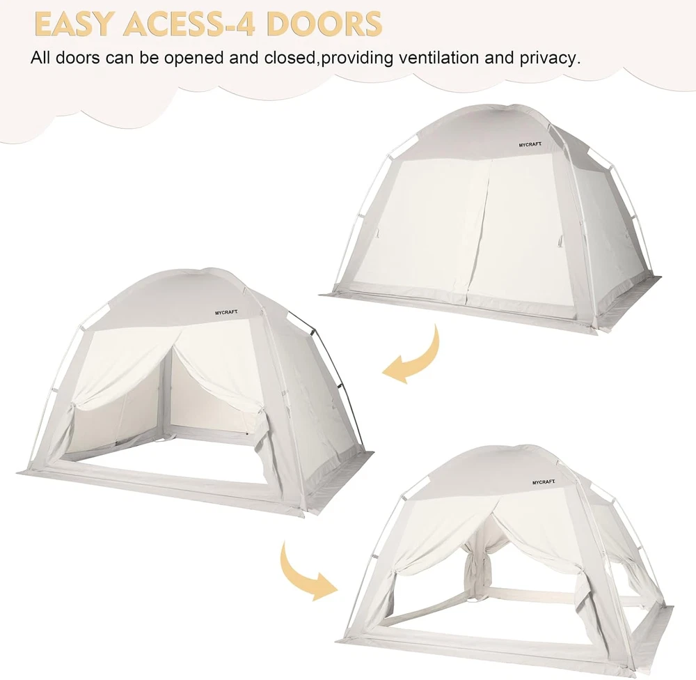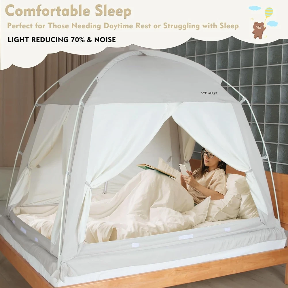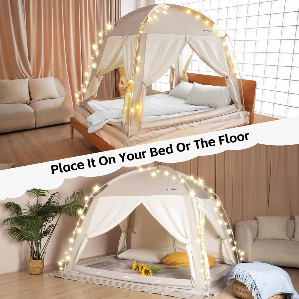 Durability and Quality: This tent for bed is made of polyester-cotton fabric,which is softer and quieter,reinforced with sturdy fiberglass poles. Available sizes include TWIN (74" x 38" x 51"),FULL (75" x 53" x 47"),and QUEEN (78" x 59" x 51") Comfort and Privacy Tent: The indoor tent features 4 doors,providing you with a private and cozy space. You can choose to open or close multiple doors,ensuring good air circulation Improved Sleep Environment:This bed tent twin can block light and reduce sound, creating a quieter sleep environment, making it perfect for those sensitive to light and noise Versatile Use: This adult indoor tent can be used on a bed or as a floor tent for camping-themed bedrooms, encouraging children to express their creativity in their own spaces Functional Design for All Ages: This bed fort is ideal as a bed fort or sleep tent,featuring ample interior space that makes it perfect for both children and adults. It serves as a multifunctional indoor castle,reading nook,or camping-themed bedroom Easy Assembly: Similar to a camping tent, this bed canopy is quick and simple to set up, and it comes with a storage bag for convenient transport and storage Product Description Create a cozy retreat with Bed Tent Create a cozy retreat with our Bed Tent—ideal for adding privacy, comfort, and versatility to any bedroom. Made with high-quality materials and designed to suit all ages, this tent is perfect for restful sleep or imaginative play. The Dreambed Tent for Your Home Suitable for different needs Ideal with Air Mattresses or Sleeping Bags Combine this indoor tent with an air mattress for a cozy and practical setup. Ideal with Sleeping Cot This indoor tent pairs perfectly with a sleeping cot, creating a cozy, private space for restful naps or overnight comfort. Play Tent Versatile Use : This adult indoor tent can be used on a bed or as a floor tent for camping-themed bedrooms, encouraging children to express their creativity in their own spaces 1 Summer and Winter Mode 2 Product Details 3 Easy To Wash And Store 4 The Floorless Model 5 Choose The Right Size