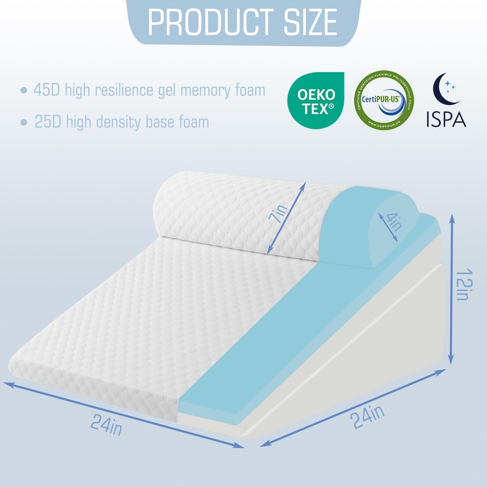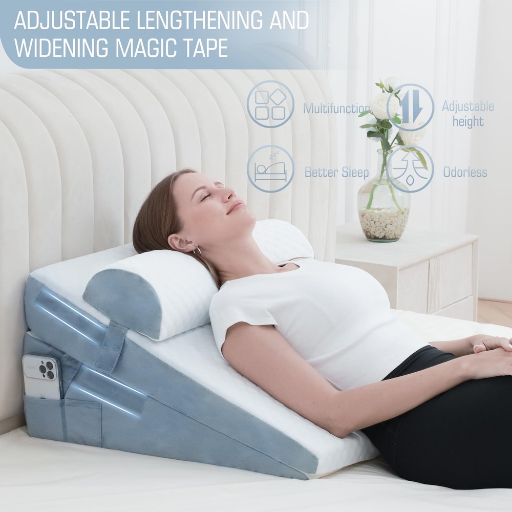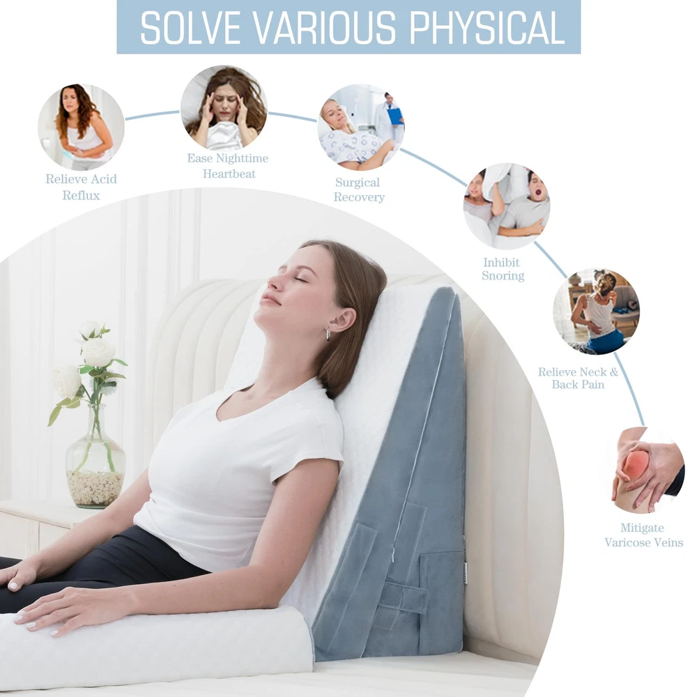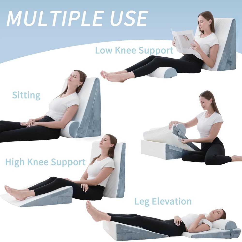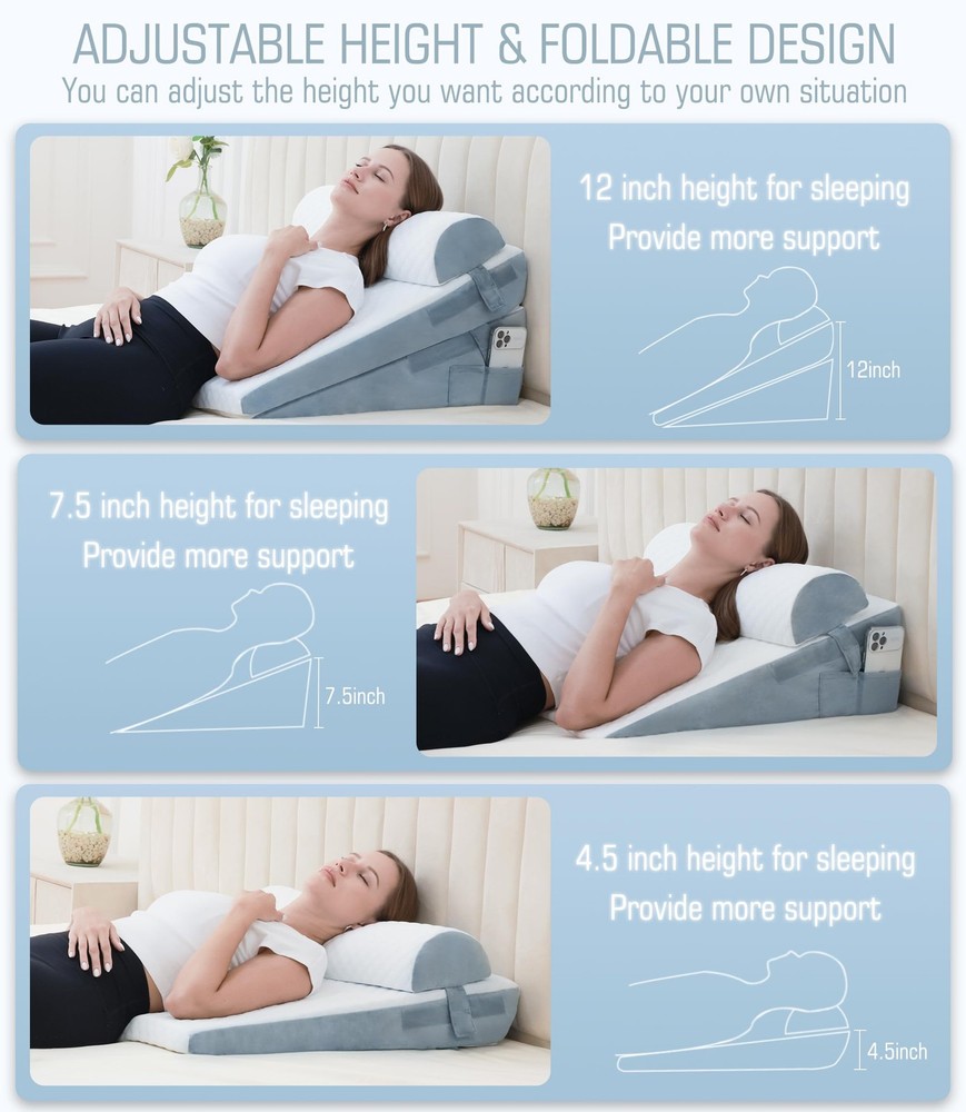 Bed Wedge Pillow HIGH QUALITY MATERIAL: Our half-moon headrest features 45D high rebound cooling gel memory foam for excellent slow rebound and comfortable support for the neck. At the same time, the main upper layer of the bed wedge pillow uses 45D gel memory foam, and the lower layer uses 25D high-density high-quality polyurethane foam to provide sufficient support and avoid wedge deformation. In addition, the foam is CertiPUR-US certified. HEIGHT ADJUSTABLE DESIGN: Our Memory Foam bed wedge pillow consists of three parts, a half-moon headrest, 7.5 "bottom pillow and 4.5" top pillow, with 2 extended magic tape pieces sewn on the side of the pillow, you can switch the height at will (4.5 ", 7.5 ", 12 ") to meet your daily needs. VERSATILE: Our pillow wedges offer many different ways of using them and can be adjusted according to individual needs. The triangle pillow wedge can be used not only for sleeping, but also for leisure activities, such as watching TV or reading. TAKE CARE OF YOUR HEALTH: Good sleep is very important for our health, especially for the recovery process. Acid reflux pillows also play an important role in treating back pain, acid reflux, snoring and aiding recovery after surgery, as well as reducing knee, back and leg pain and aiding recovery after surgery. EASY CARE: Our bed wedge pillow cover is made of breathable and skin-friendly knitted air-layer fabric with excellent breathability and stay comfortable even after prolonged use. The detachable design makes cleaning pillow covers more convenient and can be washed by hand or machine and reused.