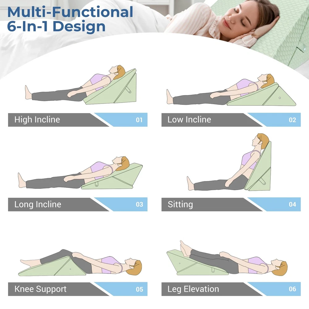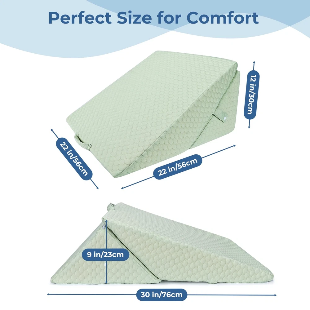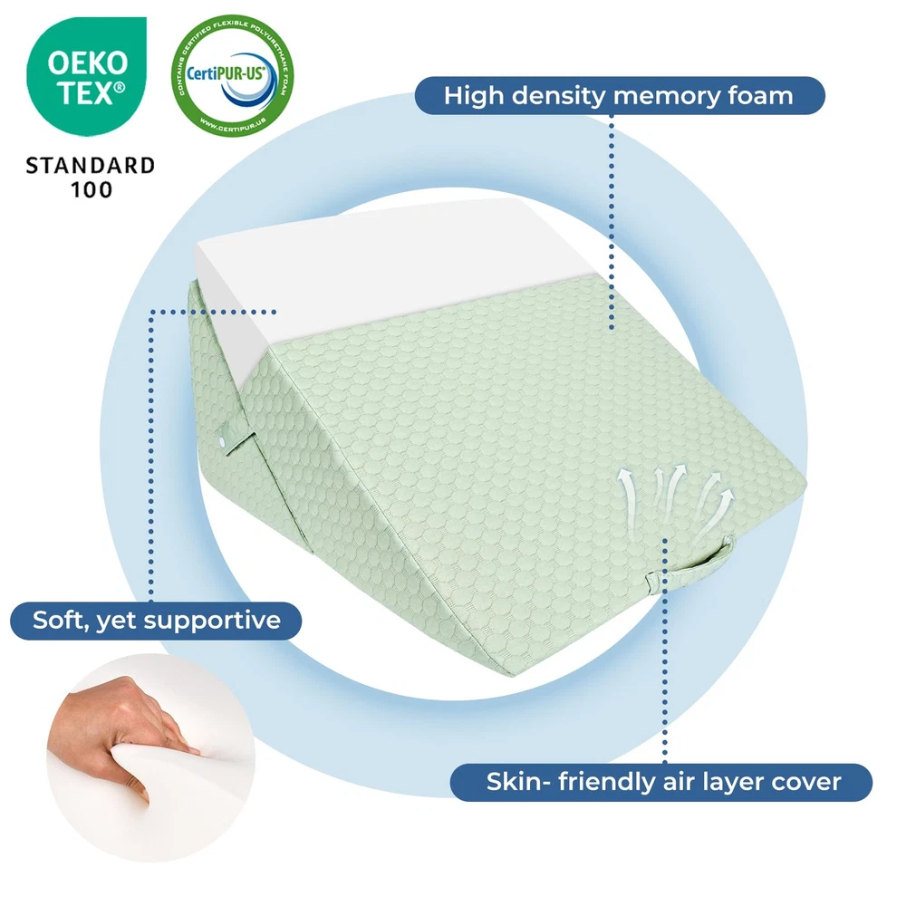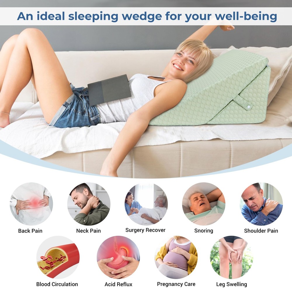 Ergonomic Bed Wedge Pillow: With Its Premium-grade foam base and 1.5-inch layer memory foam, the bed wedge is soft, yet supportive, It remains uniform in density and conforms to your shape to reduce pressure points, help increase blood flow and provide the support, comfort and alignment you need for a comfortable and restful sleep - Foam wedge specifically designed for ultimate relaxation. Versatile Folding Pillow Wedge: The triangular wedge pillow, suitable for snoring, is foldable and adjustable. It can easily adjust the height (9 and 11 inches) and angle, making it perfect for supine and lateral lying. It can provide extra support when learning, watching TV or reading Premium Bed Wedge Pillow: The ergonomic wedge pillow is made of premium-grade 25D memory foam, which is comfortable and breathable, wedge pillow for sleeping has been certified by CertiPUR US and OEKO-TEX, which is safe and hypoallergenic Friendly-design for Pain Relief: Supportive and elevated post-surgery wedge pillow helps you reduce snoring, relieve back pain, acid reflux and breathing issues, improving blood circulation and health. Ideal wedge pillows for after surgery and sleep apnea, providing more comfortable night's sleep for you Breathable & Removable Zippered Cover: The bed wedge pillow has a removable soft and breathable air layer pillowcase, which can be washed by hand or machine. Besides, with a handle, our foam wedge pillow is easy to carry and move around Good Choice: If you struggle to sleep at night, this wedge pillow for sleeping is a good choice for you, it can help you solve the problem. Whatever concerns about the wedge pillow you have, we provide customer service for you and reply within 24 hours