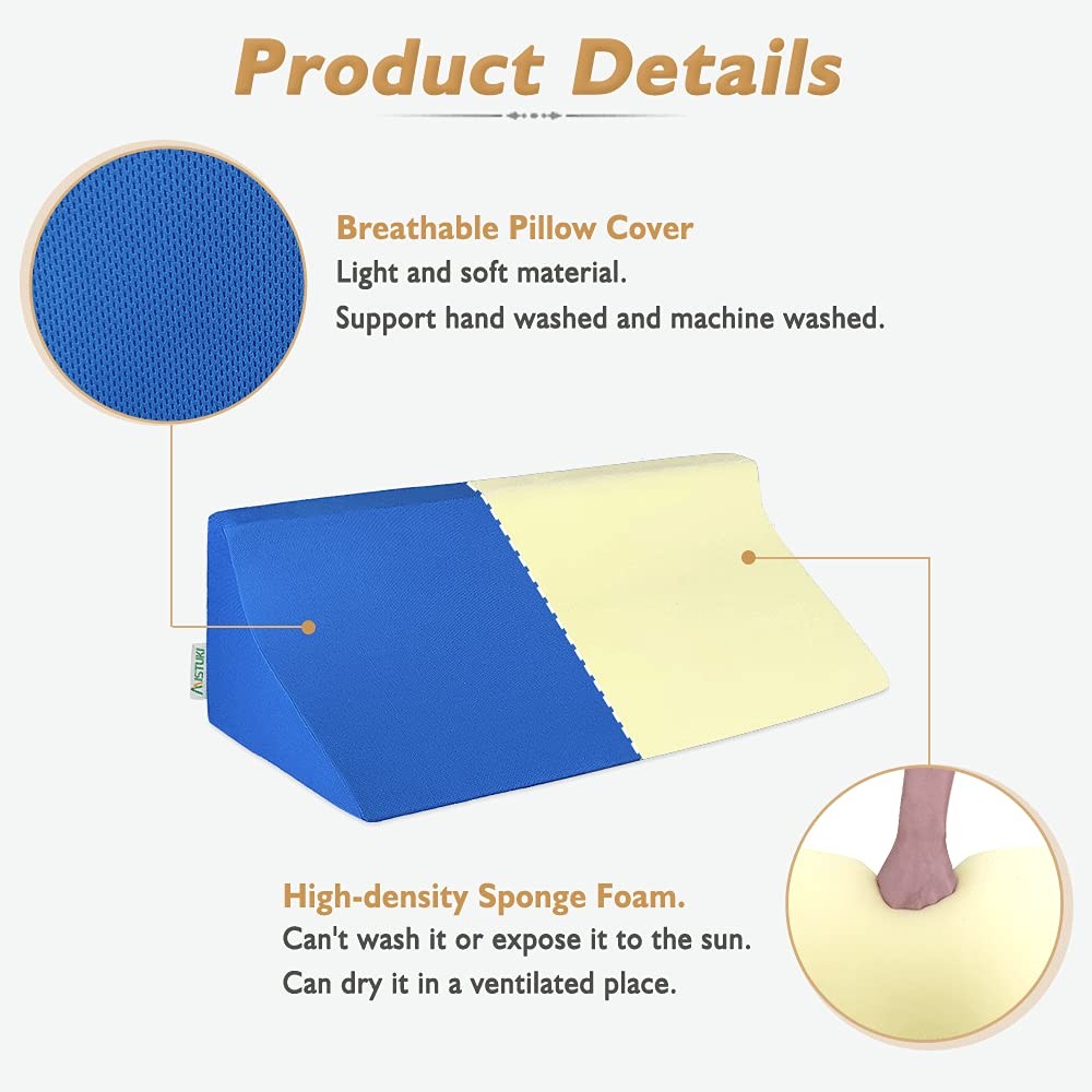 Wedge Pillows For After Surgery For Sleeping Foam Wedge Bed Incline Pillow 30 Degree Elevated Leg Therapedic Wedge Pillow For Body Positioning Support For Adults, EIderly, Bed Sore Prevention The Features Of This Wedge Pillows: 1. Builtin high-density foam, high elasticity, durable. 2. Machine washable and comfortable high-quality polyester wedge pillowcase. 3.Foam Wedge Bed Incline Pillow can be positioning in many ways to relieve fatigue in the back,Knees, ankles,and the discomfort of pregnancy Why Choose Our Bed Wedge Pillows ? 1.Body Positioning Wedge Pillows can help patients turn over,change their posture,prevent back bedsores 2. Assist leg passive lifting, improve leg blood circulation. 3.It is conducive to supporting pregnant women's belly to create a good environment for pregnant women to sleep. 4.Helps to reduce the pressure on the patient's back after surgery and relieve back pain. 5.Used with Blanket Lifts,lifts your sheets to help discomfort associated with many injuries and post surgery recovery. Suitable Users: post-surgical recovery patients,elderly,bedridden patients, lower limb fracture patients,pregnant women,handicap. Use Place: Bedroom, Hospital, Home, Sofa, Bed , Nursingq home Specification: Color: Blue Size: 8.7*23.7*11inch Material: High Density Foam Sponge + High-quality Polyester Pillowcase 【Recovery Companion】 Whether you're recovering from surgery or childbirth, this Medical Wedge pillow is your ideal partner. By supporting your back, legs, and belly, this Triangle pillow can help you sleep on your side and turn over more easily, relieve pressure, and speed up your recovery. 【Unmatched Comfort】 We use soft yet sturdy Foam Wedge to give you an unparalleled level of comfort. This Leg Elevation pillow can reduce pressure and alleviate bedsore,neck and back pain, allowing you to enjoy high-quality sleep. 【Easy to Clean】 Our removable Bolster pillowcase can be easily machine-washed to ensure that your Support pillow stays fresh and hygienic. This means you can stay clean and comfortable at any time without worrying about dirt. 【All-Round Support】 The Bed wedge pillow provides an ideal angle and position for Body positioner support, with a 30-degree angle placing the body in the best position for all-round comfort. The Orthopedic pillow is soft yet supportive, but please note that if it feels too soft, leave this Comfort pillow for a while. If it slides, insert it a little. 【Quality Assurance】 We use the highest quality materials to manufacture this Incline pillow to ensure its durability and longevity. The bottom of this Sleeping aid pillow is designed with an anti-skid base to make it easy for you to fix the Bed support pillow during use. This means you can buy with confidence, without worrying about its quality and performance. Enjoy the best sleep experience and wake up energized and refreshed every day with our Side sleeper pillow.