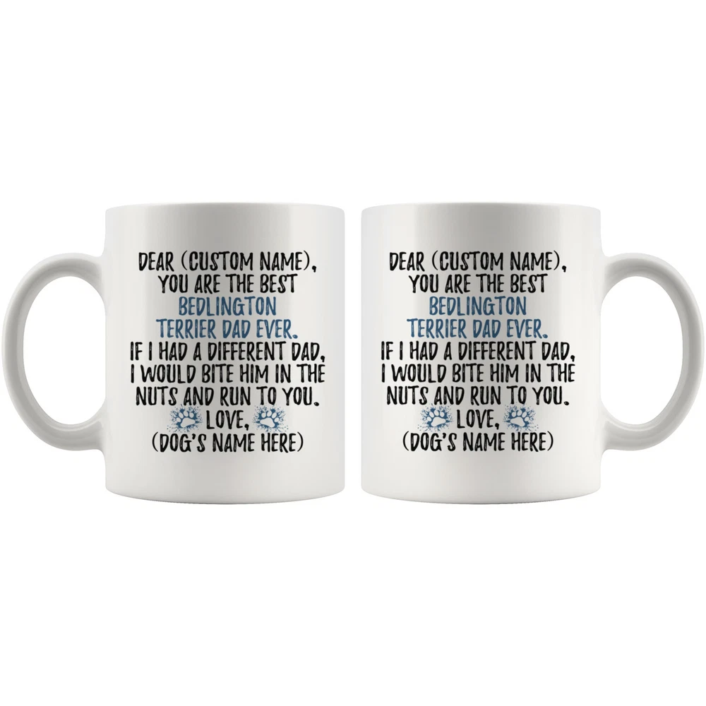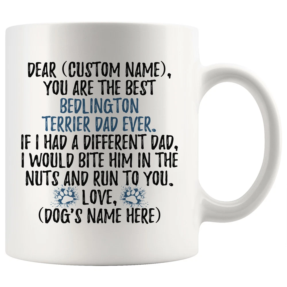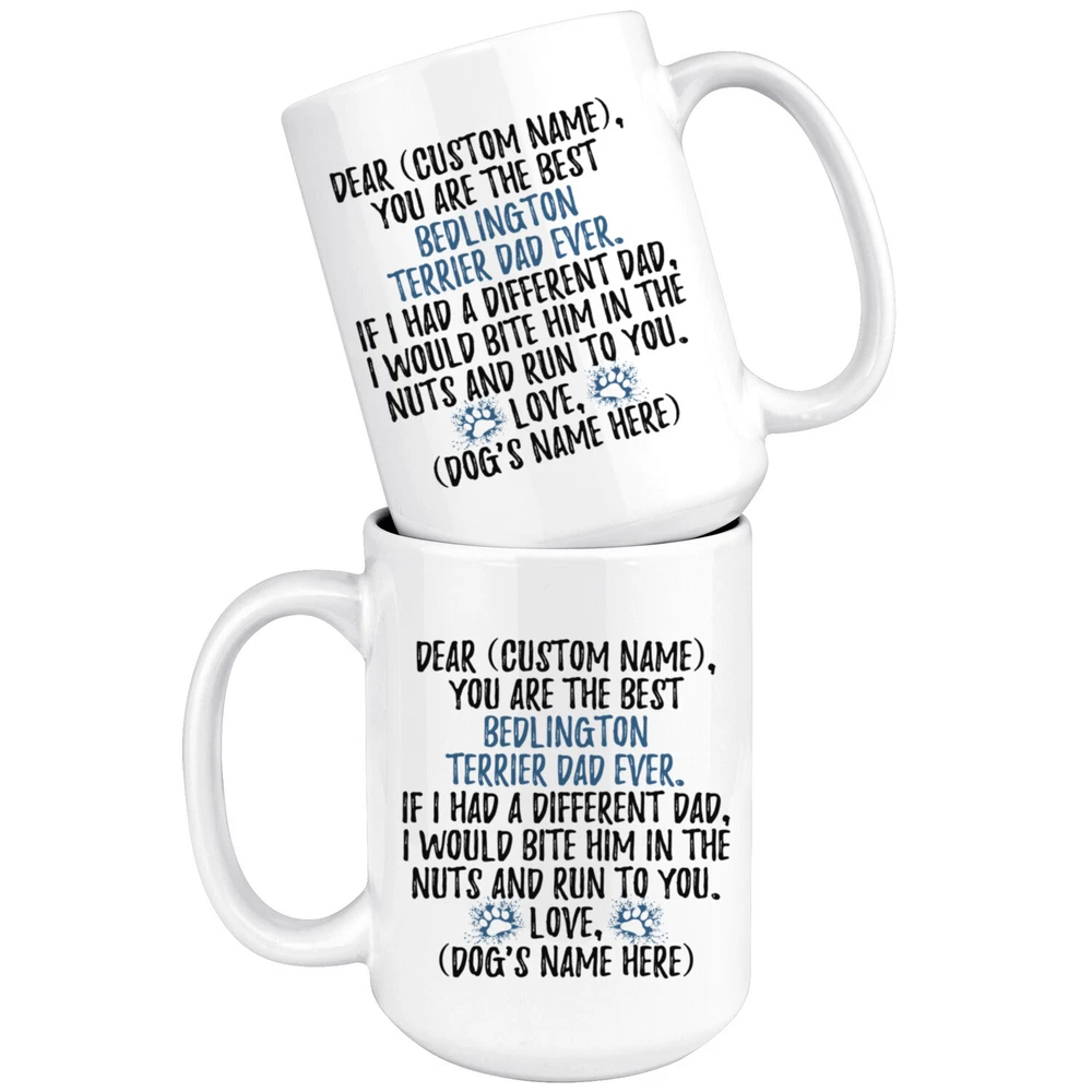 personalized bedlington terrier dog mug, rothbury terrier coffee mug, rodbery terrier dog gifts, bedlington terrier dad present gift, bedlington terrier daddy mug, bedlington terrier owner mug, i love bedlington terrier, custom bedlington terrier gift, dog coffee cup, fathers day gift This is the perfect coffee mug with content "DEAR 'CUSTOM NAME', YOU ARE THE BEST BEDLINGTON TERRIER DAD EVER. IF I HAD A DIFFERENT DAD, I WOULD BITE HIM IN THE NUTS AND RUN TO YOU. LOVE, 'DOG'S NAME HERE' ". CUSTOM DAD'S NAME AND DOG'S NAME Please put the dad's name and dog's name in the notes at the checkout or send us a message. By not doing this, it will delay your order. Example: Dad's Name: Bill; Dog's name: Charlie PERFECT FUNNY GIFT FOR A BEDLINGTON TERRIER DOG DAD! This special coffee cup can be a great gift for every Bedlington Terrier dad. DISHWASHER AND MICROWAVE SAFE! This version of ceramic mug shows it's true colors with quality assurance to withstand heat in the microwave and put it in the dishwasher as many times as you like, the quality will not be Altered. THE MUG DESIGN IS PRINTED ON BOTH SIDES! No matter if you hold your teacup in your right or left hand, you and everyone else will be able to see this unique design. Looking at this cute coffee mug will put a smile on everyone's face! We want you to be 100% satisfied, so please let us know if there is anything wrong with your order so we can fix it right away.