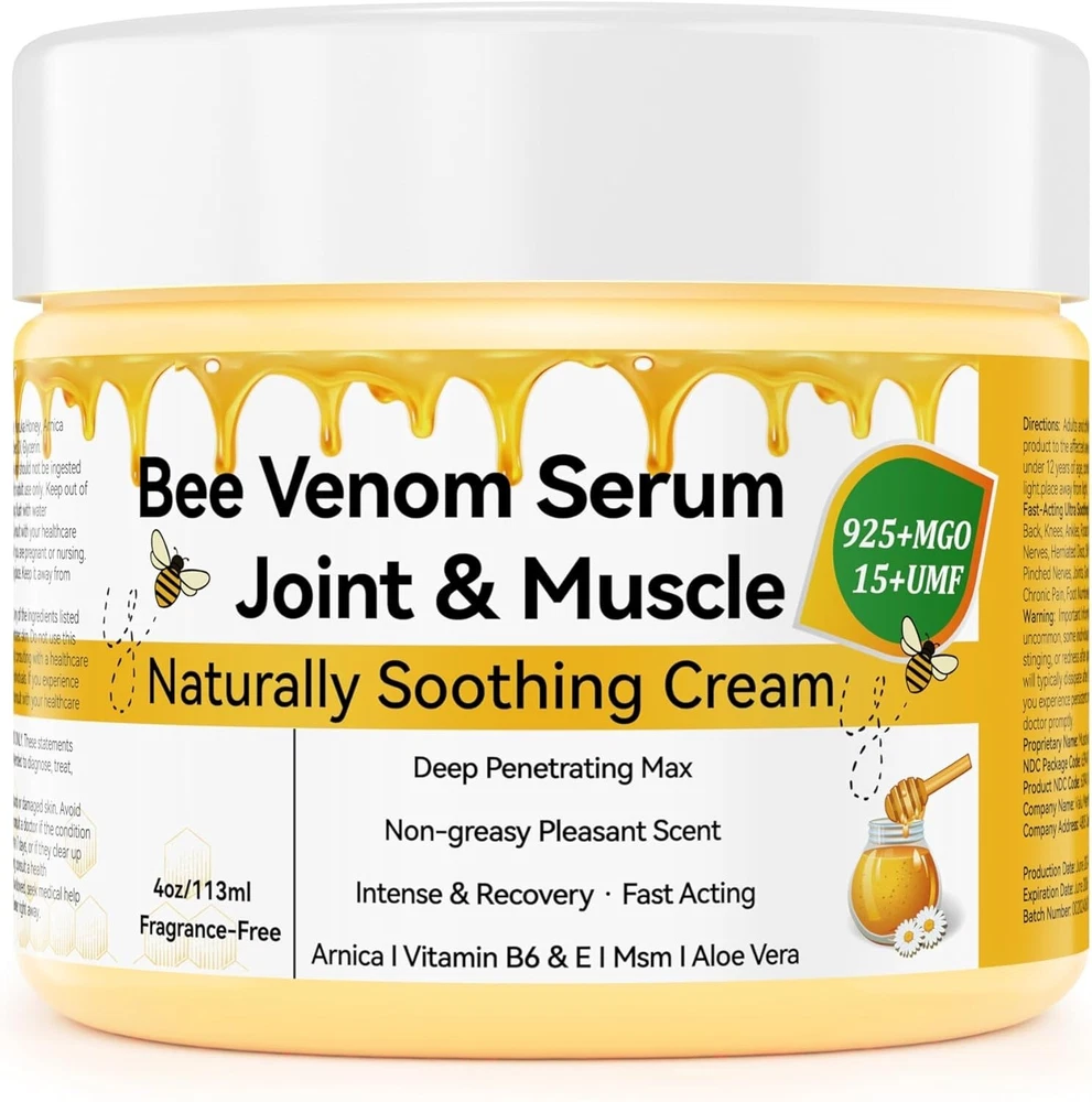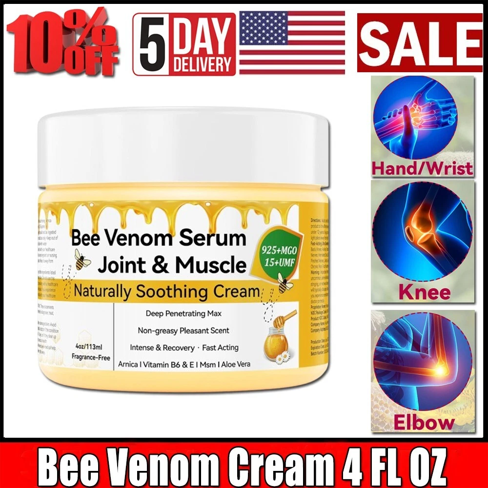 Bee Venom Muscle Bone Cream, Fast Acting, Relief for Back, Neck, Hand, Feet, Knee, Muscle, Shoulder, Topical, Wrist, Elbow, Hip, Nerve, Plantar, Ankle, Foot Discomfort, Vitamin B6 -4oz/113gm Discover the Power of Nature: Introducing Bee Venom Cream—an extra-strength ointment that blends natural bee venom with herbal extracts to tackle muscle and joint discomfort.Our meticulously selected ingredients provide gentle yet effective relief, harnessing nature’s best for your wellness. Experience Visible Improvement: Feel the relief as discomfort melts away and your well-being transforms. Perfect for busy professionals, active athletes, or dedicated students, this cream supports your journey to optimal health, enhancing your strength and potential. Target Deep Discomfort: Bee Venom Cream delivers targeted relief precisely where you need it. Its advanced formula penetrates deeply to address issues like meniscus and general muscle and discomfort, offering comprehensive care. Enjoy Quick Absorption: The cream absorbs swiftly without leaving any greasy residue or lingering scent. Use it confidently throughout your day, knowing it won’t disrupt your routine or activities. Satisfaction Guaranteed: We stand by your satisfaction. Bee Venom Joint Cream comes with a 90-day return guarantee. If you're not completely satisfied, return it within 90 days for a full refund. We’re committed to ensuring a risk-free experience and your peace of mind. Note: This Product is designed to deliver optimal results, offering high-quality performance and satisfaction. Please note that individual experiences and outcomes may vary based on personal use, preferences, and unique circumstances. For best results, we recommend following the provided guidelines and ensuring the product is used as intended. Product result may vary for every individual. NOTE Hello Buyer, Thank you for your interest in our product! Please note that I am a reseller, and your order will be shipped directly from our nearest warehouse to your address. If you have any questions or need assistance, feel free to reach out.