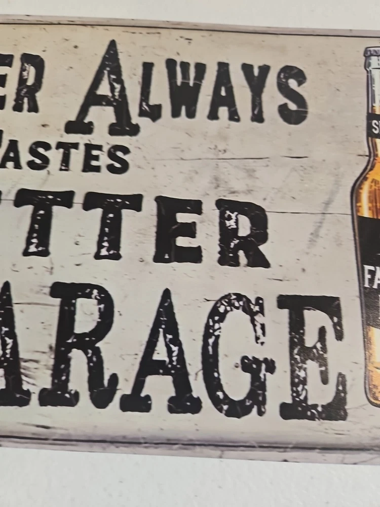 Add some rustic charm to your garage with this decorative metal sign that boasts a quaint, primitive style. The sign features a humorous message that's sure to elicit a laugh, and its hanging and wall-mounted design makes it easy to display. Measuring 8x12 inches, this sign is perfect for any garage or man cave, and its metallic finish adds a touch of industrial flair to your decor. Crafted from high-quality metal, this sign is built to last and requires no additional parts to hang or display. Its colorful design and rusty look make it a great addition to any space, and its rectangular shape and horizontal orientation make it a perfect fit for your wall or door. Bring some personality to your garage with this unique and eye-catching sign that's sure to be a conversation starter.