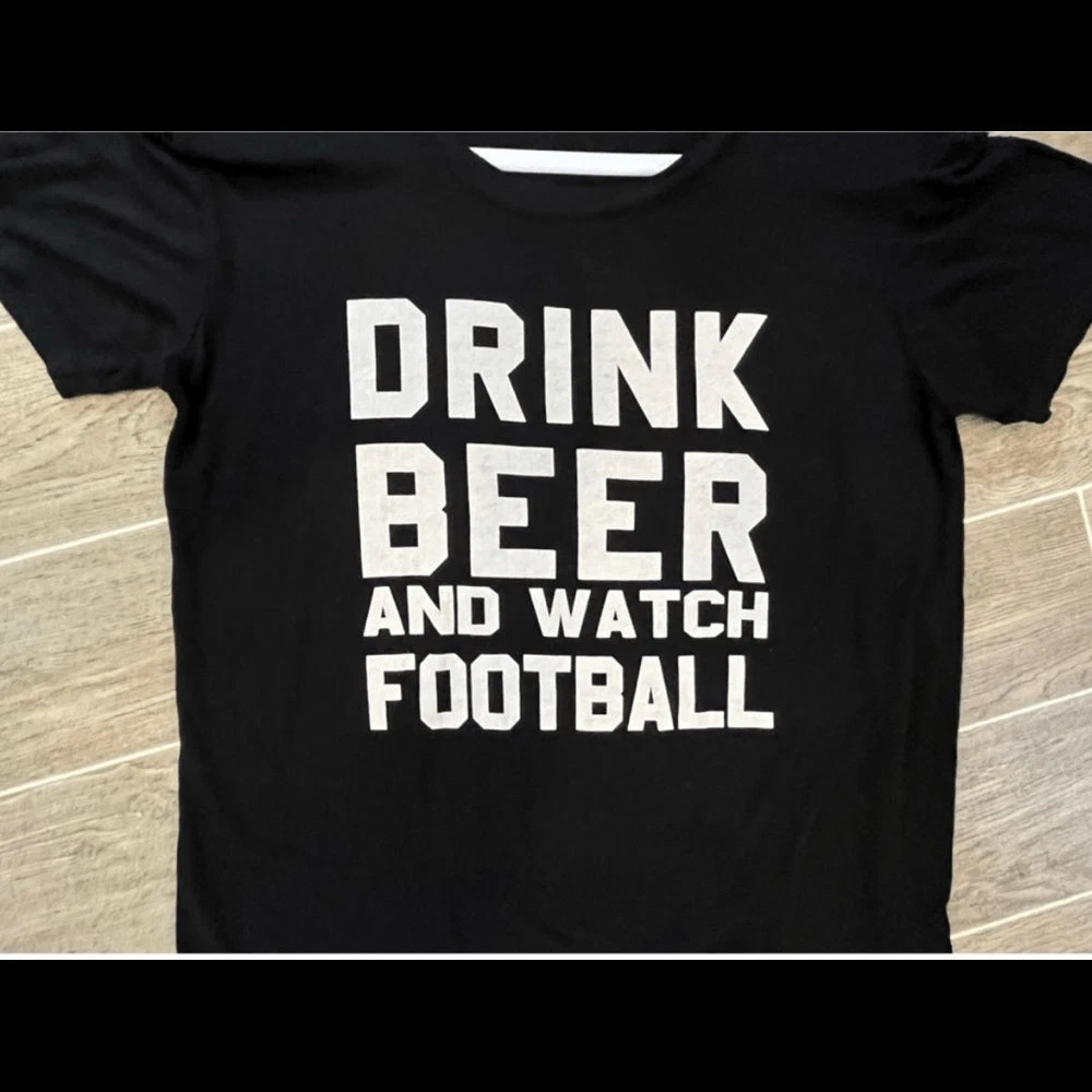 Football ladies here’s your shirt. Says drink beer and watch football. It’s black with white Writing. Short sleeve T-shirt. Excellent condition I think one once. Made by twine and stark. It is made in the USA. Size small. 96% rayon 4% cotton. Nothing wrong no flaws no tears no stains.It says it all: Drink Beer, Watch Football!