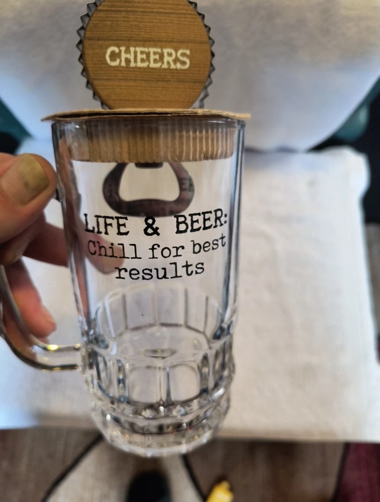 This beer mug and bottle opener set is perfect for any beer enthusiast. The set features a unique design that reads "Life & Beer: Chill For Best Results" and is made by Mud Pie, a well-known brand in the industry. The opener is specifically designed for opening bottles and the mug is perfect for enjoying your favorite brew. The set falls under the categories of Collectibles and Breweriana, Beer and Openers. The country/region of manufacture is unknown, but the opener is made with high-quality materials to ensure durability. This set is a must-have for anyone who loves beer and wants to add a unique piece to their collection. Makes a great gift too!! 🎁