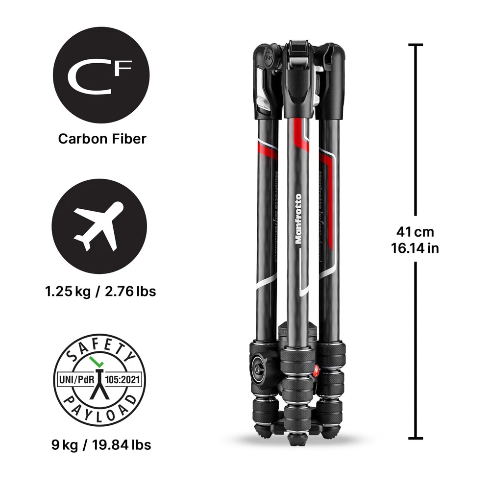 Perfect for travel photography, the Befree Advanced Carbon Fiber Travel Tripod weighs just under 3 pounds and fits easily into backpacks and carry on luggage. Offering superior performance with maximum lightness, this tripod lets you capture the stunning quality images that only steady as a rock stability can achieve. 494 Center Ball HeadThe Befree Advanced Carbon Fiber Travel Tripod features a 494 center ball head with 3 independent controls. Its main knob manages the sphere lock while an integrated friction control knob adjusts the ball tension to balance equipment weight and frame shots. FeaturesTop Attachment: 3/8-inch screwCenter Column: RapidClosed Length: 16. 14-inchesLegs Tube Diameter: 0. 44- 0. 58- 0. 72- 0. 85-inchesLeg Angles: 22°, 54°, 89°Leg Sections: 4Maximum Height (with Center Column Down): 50-inches Maximum Height: 59-inchesMin Height: 16. 14-inches Plate Type: 200PL PROBase Diameter: 1. 57-inchesMaterial: Carbon fiber Load Capacity: 17. 64 poundsWeight: 2. 76 pounds Advanced Travel Tripod kit Carbon Superior performance with maximum lightness Center Ball Head with three independent ergonomic controls Side pull selector ensures quick setup with both hands Unique premium design, 100% Made in Italy