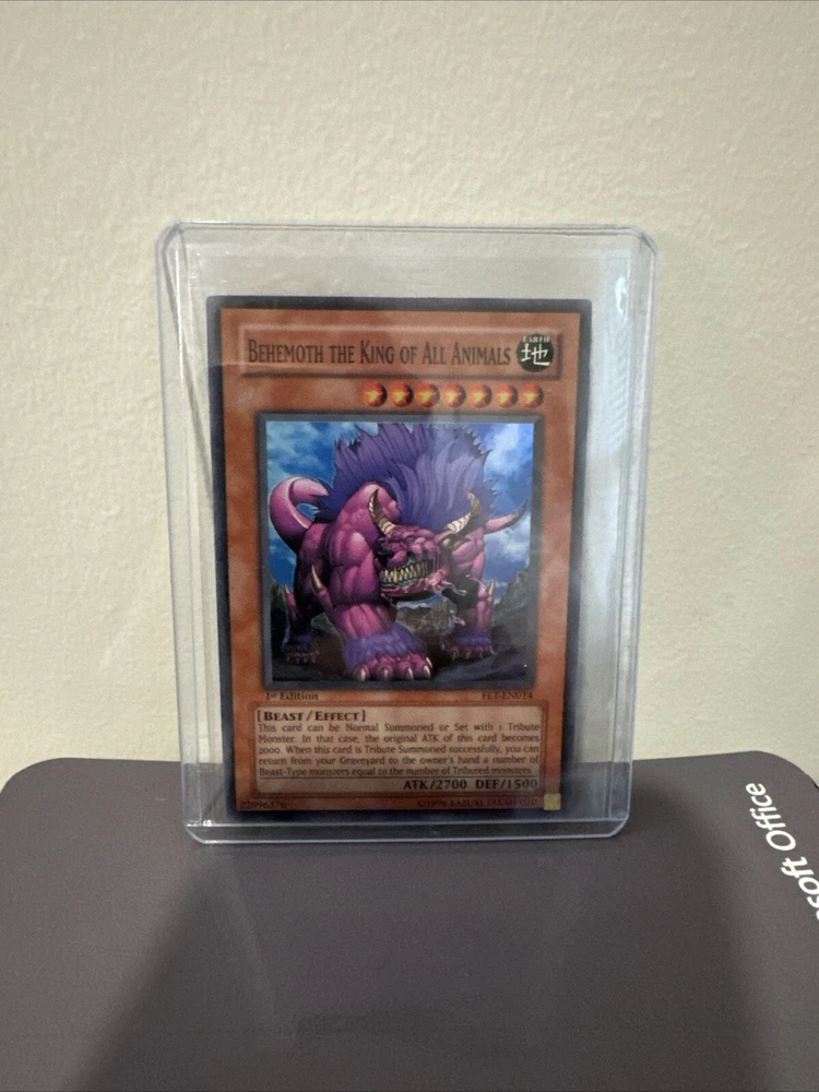 This collectible card game item features the rare animal Behemoth the King of All Animals from the Flaming Eternity set of the Yu-Gi-Oh! TCG. The card is in English language and manufactured by Konami in 1996, making it a vintage item for collectors. It is an ultimate rare card with a 1st edition and the card number FET-EN014. The card size is standard and it is suitable for ages 6+. This card is a must-have for any animal-themed collector or Yu-Gi-Oh! enthusiast.