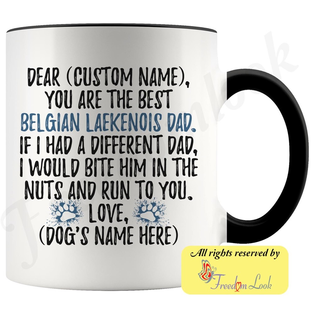 personalized belgian shepherd laekenois dog mug, belgian laekenois coffee mug, belgian shepherd dog (laeken) gifts, chien de berger belge dad present gift, belgian shepherd laekenois daddy mug, belgian shepherd laekenois owner, i love belgian shepherd laekenois, custom dog coffee cup, fathers day gift Are you looking for a great, unique and personalized gift for a dog owner? Search no more and get this mug TODAY. They will be thankful forever. Don't miss it because you'll regret it later by not getting it. This is the perfect coffee mug with content "DEAR 'CUSTOM NAME', YOU ARE THE BEST BELGIAN LAEKENOIS DAD. IF I HAD A DIFFERENT DAD, I WOULD BITE HIM IN THE NUTS AND RUN TO YOU. LOVE, 'DOG'S NAME HERE' ". CUSTOM DAD'S NAME AND DOG'S NAME Please put the dad's and dog's name in the notes at the checkout or just send us a message. By not doing this, it will delay your order. Example: Dad's name: Bill; Dog's name: Charlie A PERFECT FUNNY GIFT FOR A BELGIAN SHEPHERD LAEKENOIS DAD! This special coffee cup can be a great gift for every Belgian Laekenois dog dad. Sizes: Colored coffee mug size: 11 oz White coffee mug size: 11 oz or 15 oz DISHWASHER AND MICROWAVE SAFE! This version of ceramic mug shows it's true colors with quality assurance to withstand heat in the microwave and put it in the dishwasher as many times as you like, the quality will not be Altered. THE MUG DESIGN IS PRINTED ON BOTH SIDES! No matter if you hold your teacup in your right or left hand, you and everyone else will be able to see this unique design. Looking at this cute coffee mug will put a smile on everyone's face! We want you to be 100% satisfied, so please let us know if there is anything wrong with your order so we can fix it right away. We truly offer the most stunning, unique and trendy highest-quality products in the world. All of our products are custom-made-to-order and handcrafted to the highest quality standards. We stand by our products the quality is outstanding rest assured. Triple check your address , we copy addresses exactly as written, any undeliverable orders due to customer error are not our responsibility. Mug for every day. Christmas birthday brother sister mom mother father dad aunt grandma grandpa girlfriend gift
