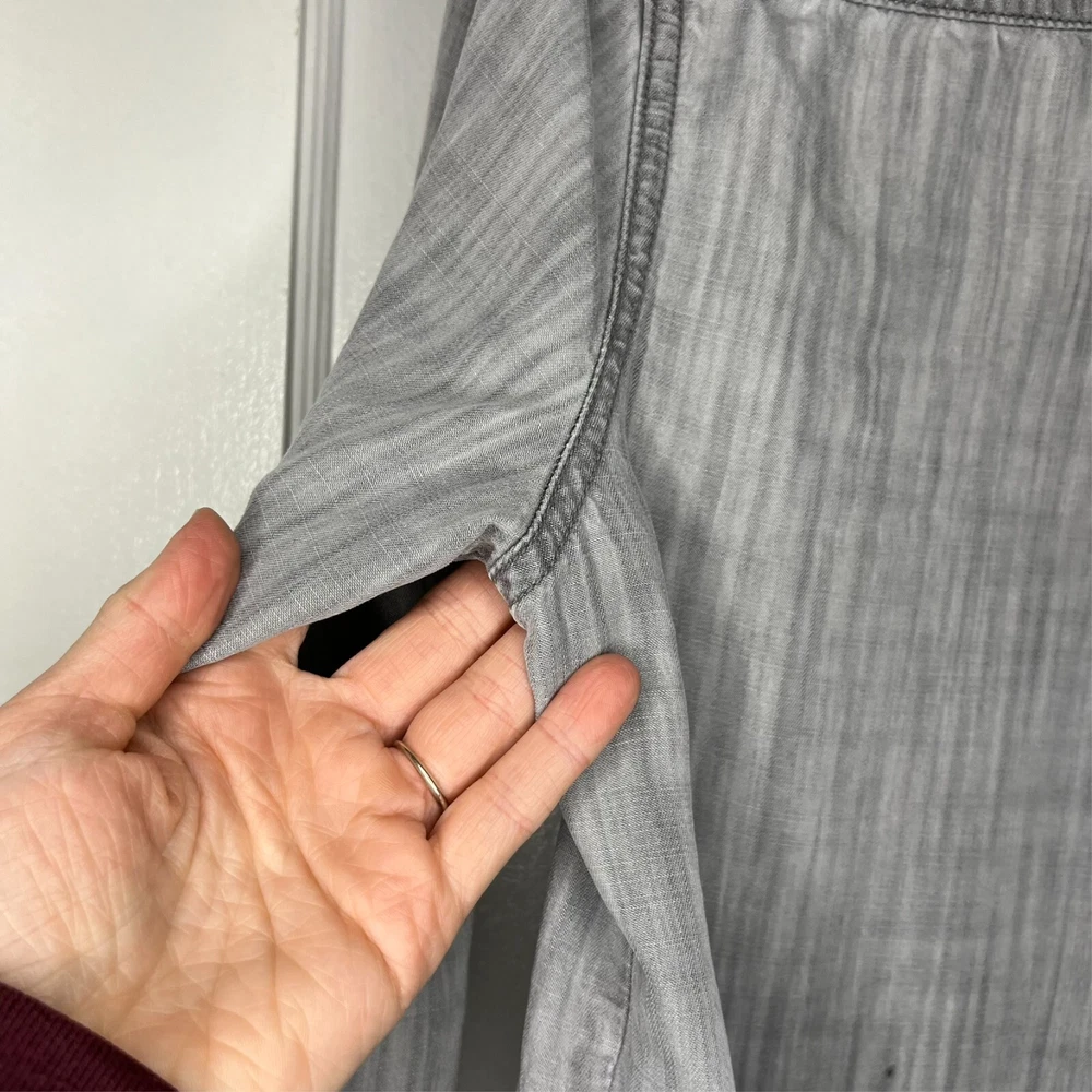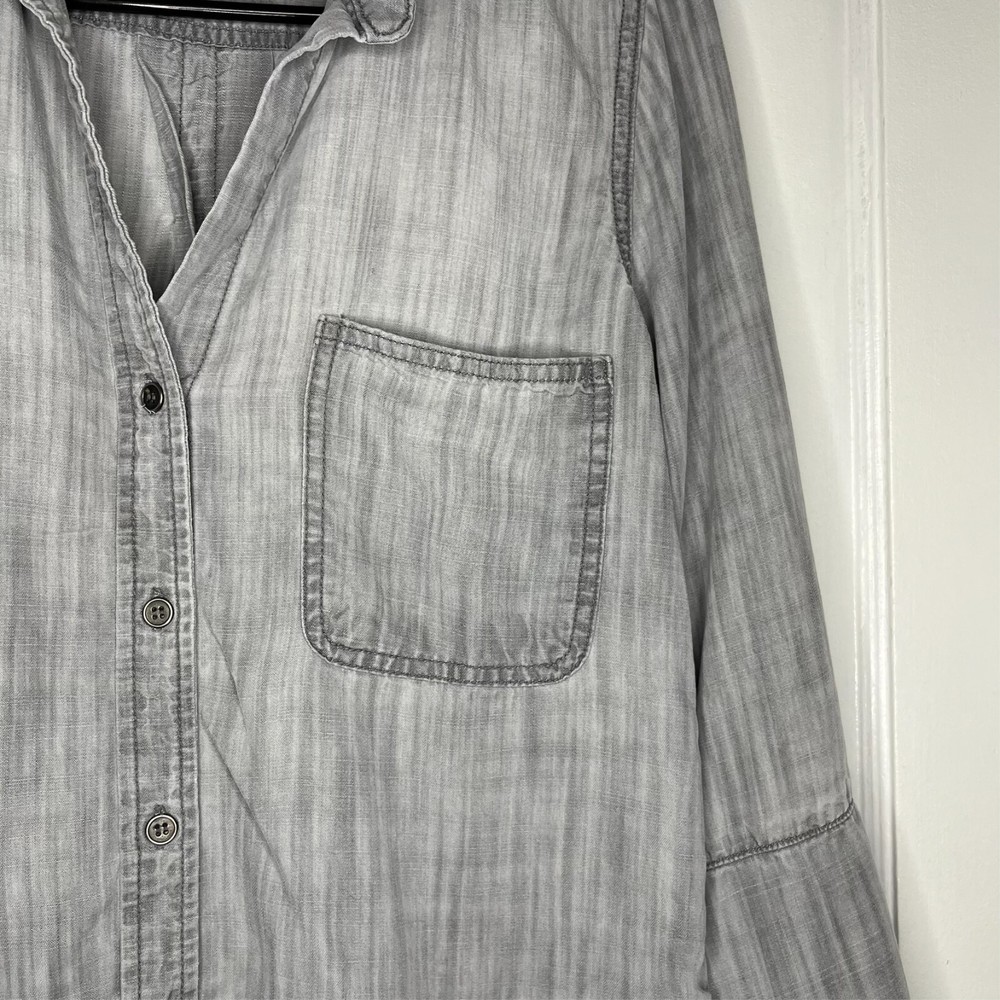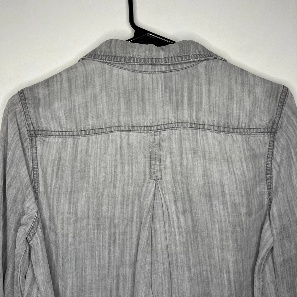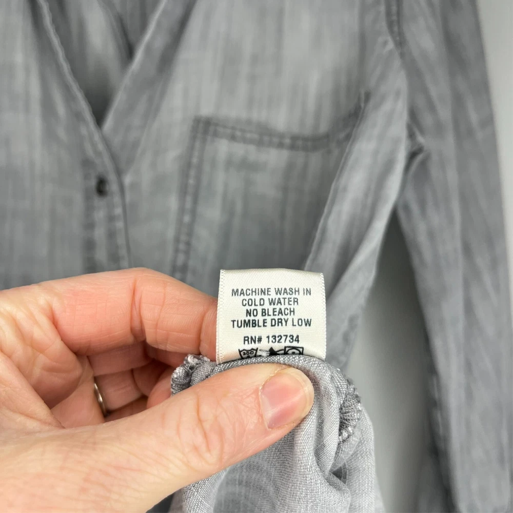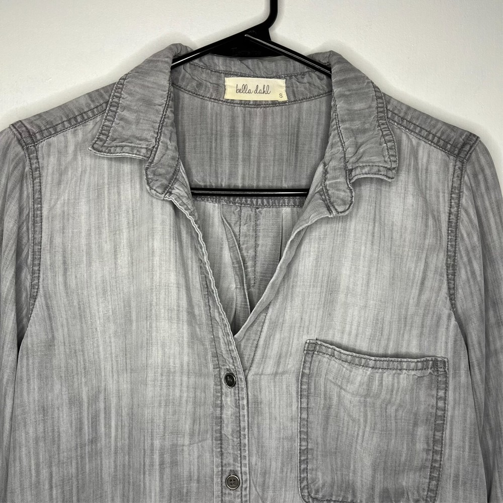 This is the classic Bella Dahl Shirt Tail Button Down Shirt in a size small and medium gray color It features a collared v-neckline, chest pocket, 1/2 length roll sleeves, and a hi-low hem. Excellent Used Condition - No stains, holes, tears or other notable issues. Approximate Measurements: Length: 24.5" (front), 26.5" (back) Chest: 38" Shoulders: 15" Sleeve length: 20" Sleeve Opening: 10.5" Bottom Hem: 42" If you have any questions, or would like any additional measurements, please ask!