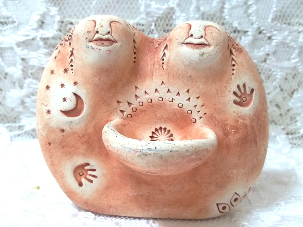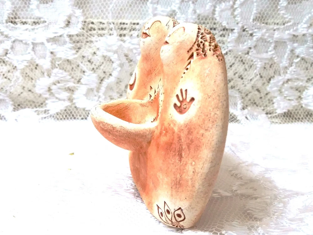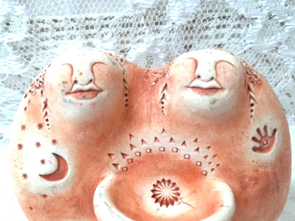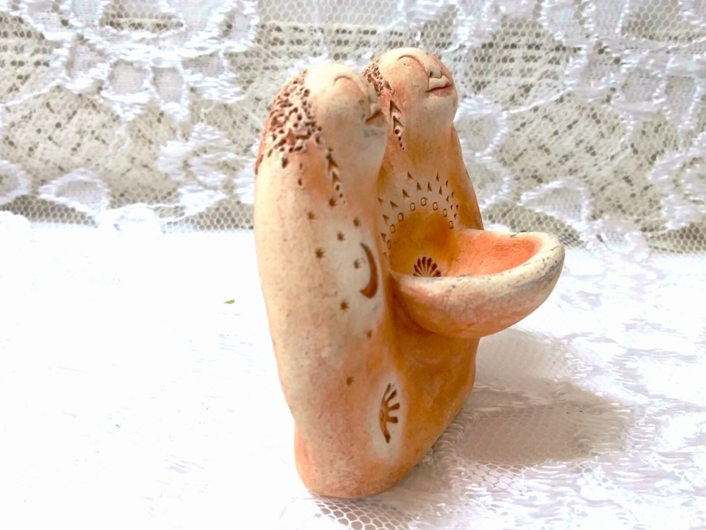 Bell Pine Art Farm Sisters Clay sculpture 1.5"D x 2.5"W x 2.5"H Excellent Used Condition Crafted with meticulous attention to detail, the Bell Pine Art Farm Clay Sculpture encapsulates the essence of sisterhood in a beautiful abstract form. This small-sized, original piece showcases the artist's skill in pottery, bringing to life two sisters entwined in a gesture of unconditional love and support, captured within the sculpture's elegant curves. The artwork is an expression of artistic vision, rendered in a medium that allows for a tactile experience of the piece's texture and form. It stands as a testament to the themes of art and the profound bond of sisterhood, making it a thoughtful gift or a cherished addition to any art enthusiast's collection. Per the Bell Pine Art Farm website, this sculpture represents "Sisterhood: The bowl of female wisdom contains deep knowledge of our connnection to ech other..."