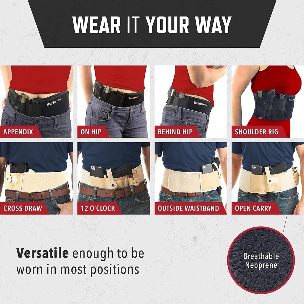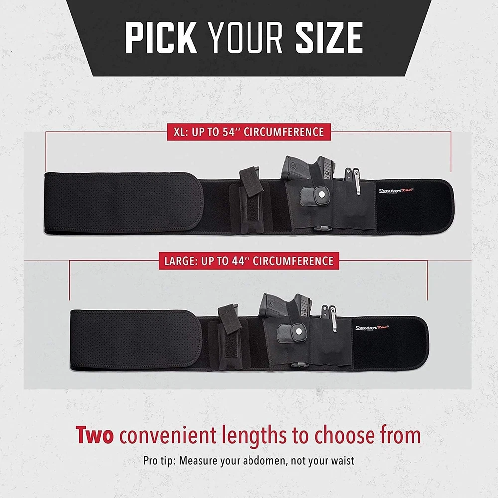 Belly Band Holster for Men and Women - Gun Holster by , Fits Smith and Wesson, Shield, Glock 19, 17, 42, 43, P238, Ruger LCP, and Similar Guns for Most Pistols and Revolvers Our belly band holster is available in right- and left-hand draw; designed for firearms of various sizes, including subcompact, compact, and full-size pistols and revolvers From wearing it at the appendix or hip, to sporting it outside the pants cross draw or open carry style, you can wear this pistol holster your way Our gun holster for women & men is compatible with Glock 19, 23, 38, 25, 32, 26, 27, 29, 30, 39, 28, 33, 42, 43, 36, Smith and Wesson, Bodyguard, M&P Shield, Sig Sauer, Ruger, Kahr, Beretta, Springfield, Taurus PT111, Kimber, Rock Island, Bersa, Kel Tec, Walther, and more The Large, adjustable neoprene waistband on our bellyband holster for men and women fits up to a 44" belly while the XL fits up to a 54" belly These belly band holsters come with a hard plastic trigger guard and metal snap retention strap as a helpful safety feature to keep your gear secure