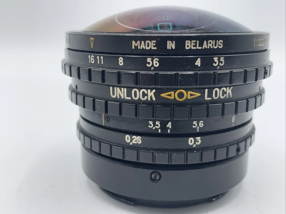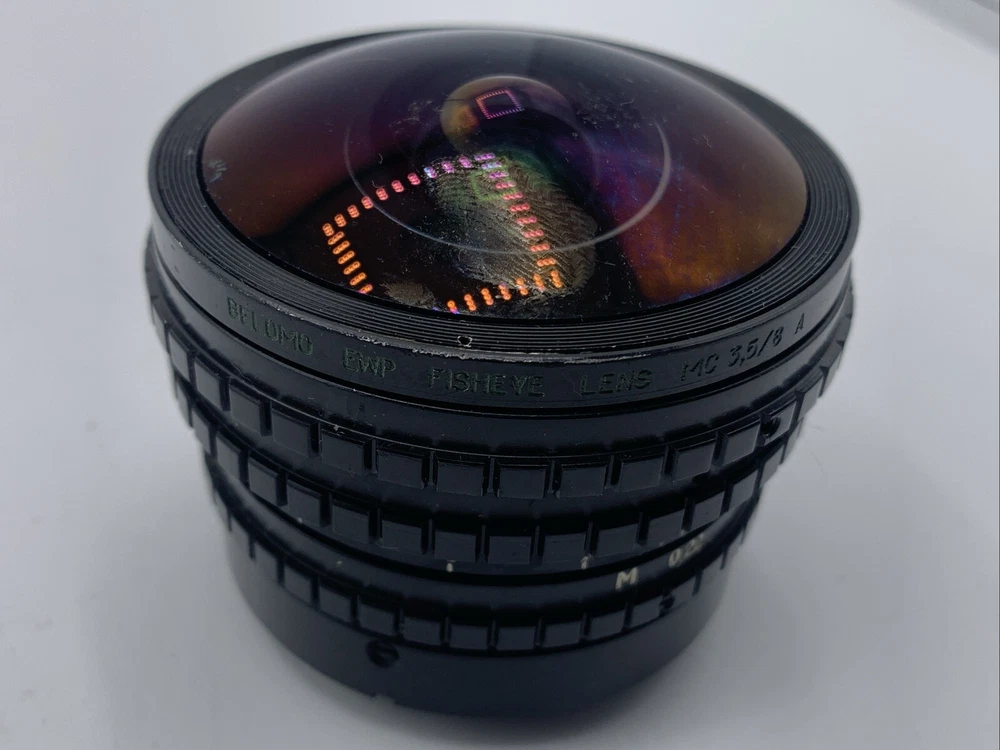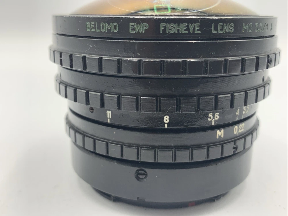 The BelOMO Fisheye Lens MC 3.5/8A is a fisheye lens with a maximum aperture of f/3.5 designed for Canon EF mount cameras. Made in Belarus, this fixed/prime lens has a focal length of 8mm, providing a unique fisheye perspective for creative photography. The lens comes with a case for storage and protection, making it convenient for photographers on the go. Perfect for Canon camera users looking to add a fisheye option to their lens collection.