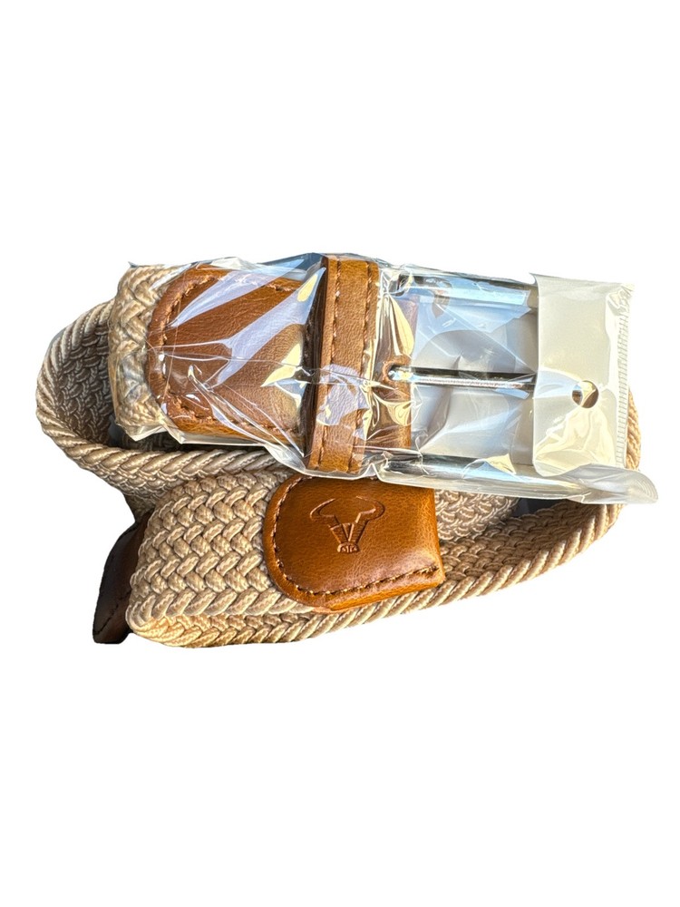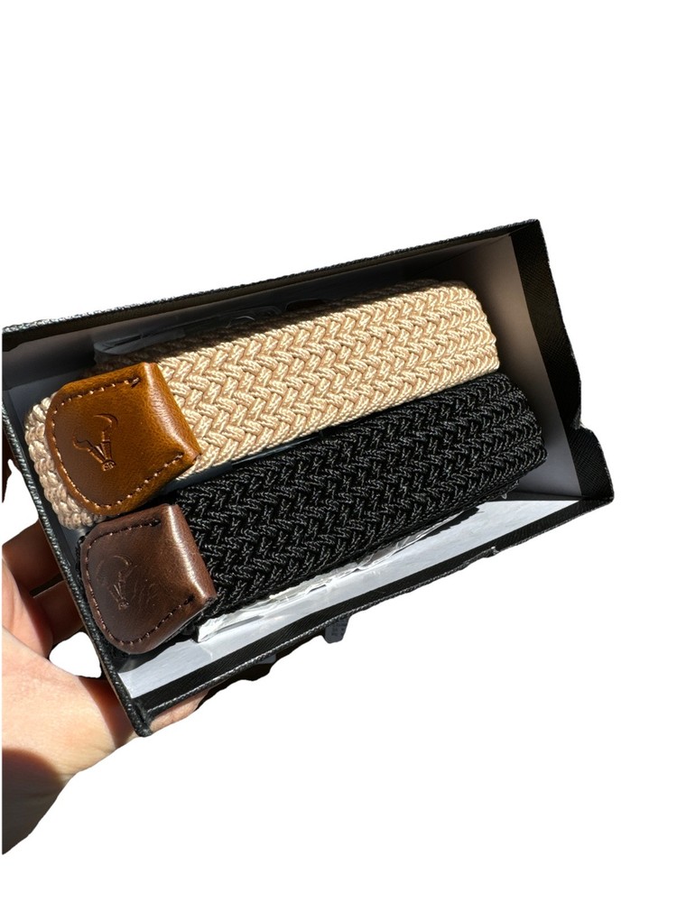 This is a men's belt designed for casual wear, specifically for golf or everyday use. The belt is made from stretchy nylon material, ensuring a comfortable fit and flexibility. It features a braided web design in black and beige colors, making it versatile and easy to pair with various outfits. The belt is in size 41/115 and is suitable for regular-sized individuals. Perfect as a gift for men who enjoy sports or are in need of a stylish accessory for their wardrobe.