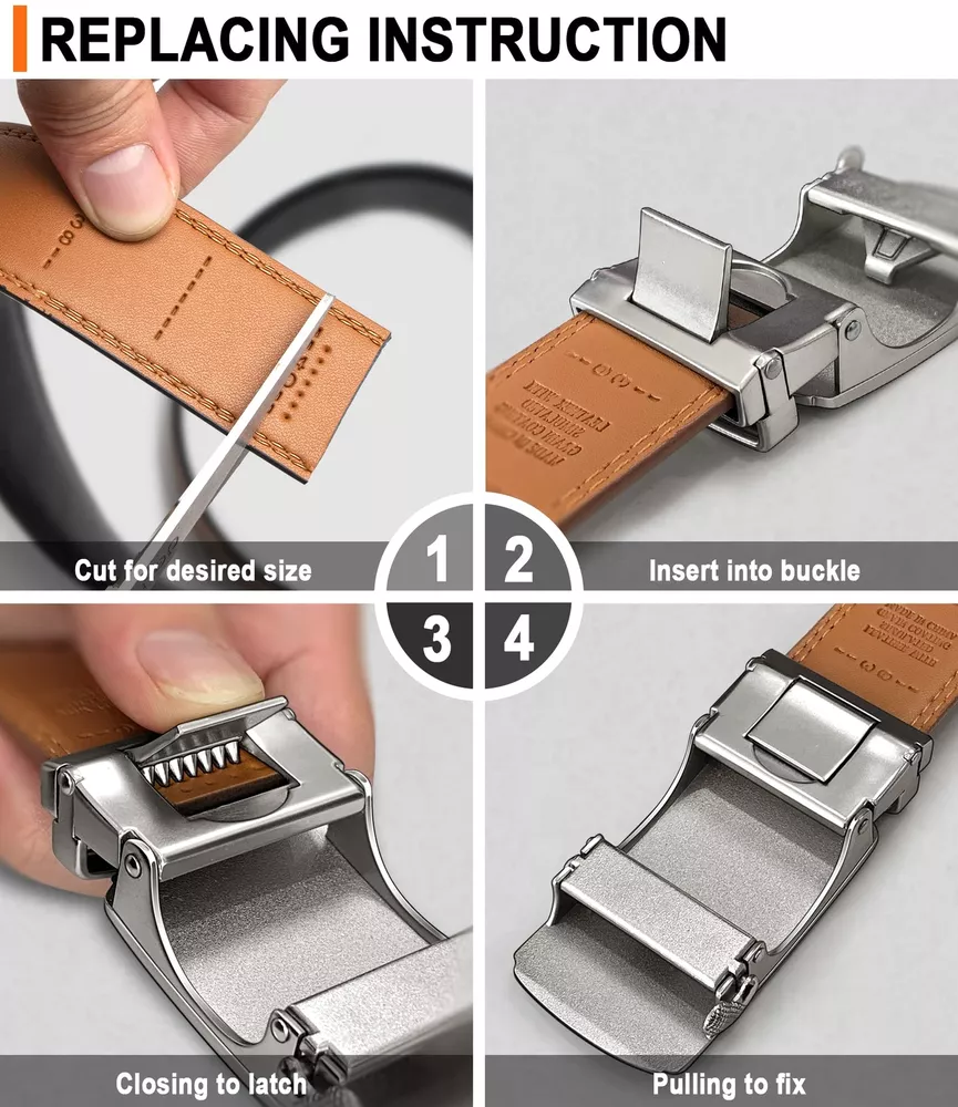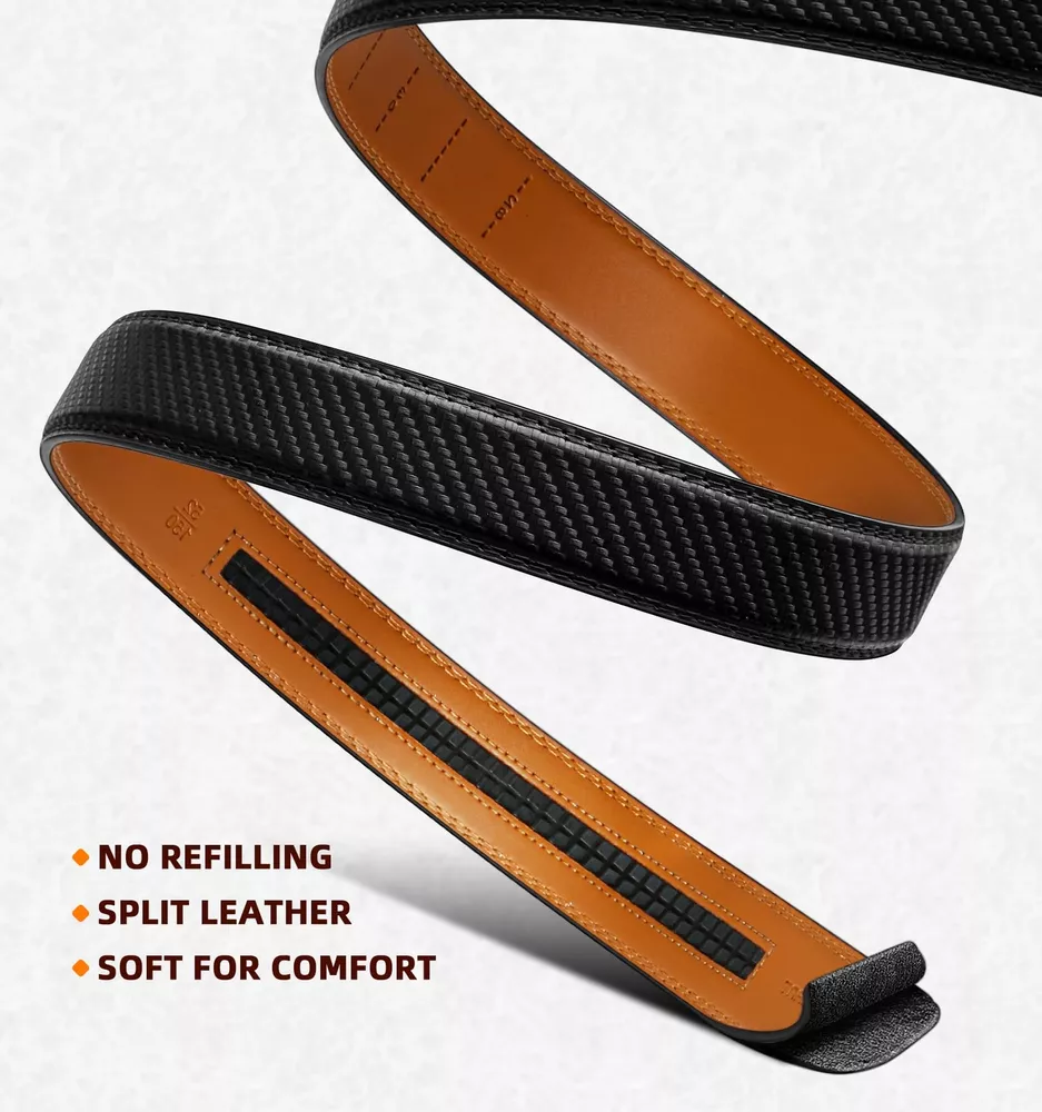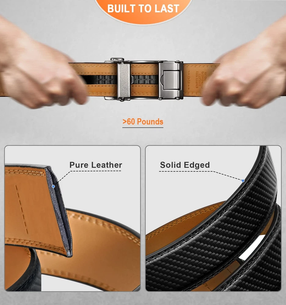 For ratchet belt width 1 3/8; CUT FOR FIT--One Size with waist range 28"-52" by cut for fit,there are size marks in the back of strap for your desired size,easy to cut and never wrong size; MATERIAL--Two layers spilit leather without any mid-refiiling,reiforced flat edge with solid stitching makes it strong. It enable a pulling force up to 60Pounds for daiy use by fat guys; USER FRIENDLY--Feeling soft and friendly in hand,warm but firm delicated coating will always hold your pant on and keep it clean; STYLISH--Multi colors for selection,easy matching for dress,casual or jeans.