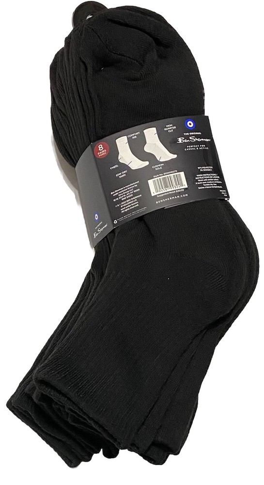 The Original Ben Sherman Men's Cushioned 8 -Pair High Quarter Cut Socks 97% Polyester 3% Spandex Black Sock Size 10-13 fits U.S. Shoe Size 6-12