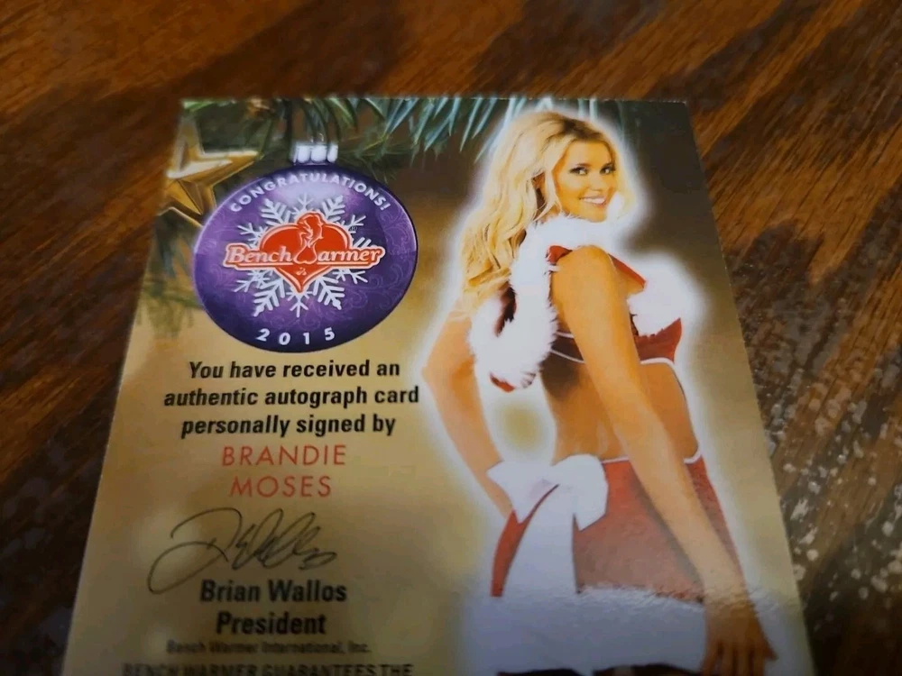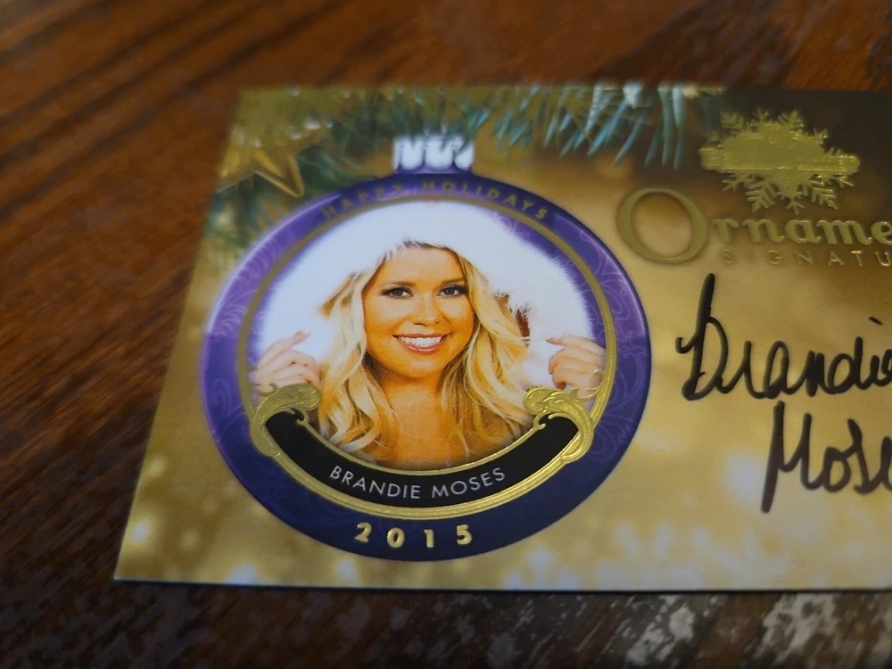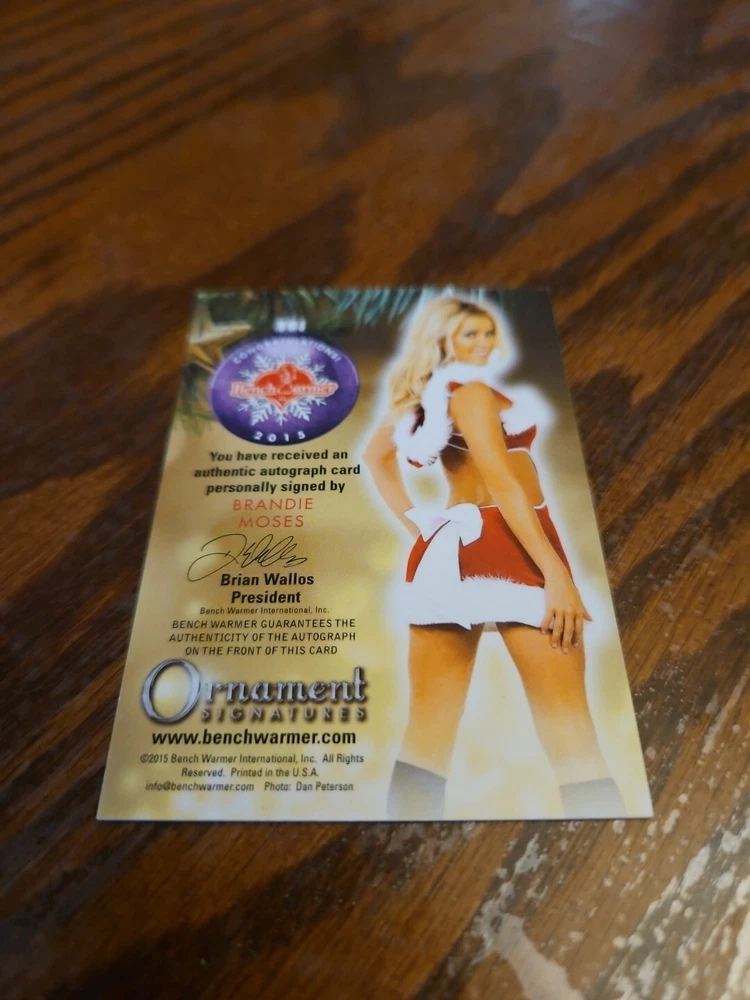 Benchwarmer 2015 Brandie Moses Happy Holidays Ornament Signatures Autograph Card Playboy Playmate Buxom and shapely 5'5' blonde bombshell Brandie Moses was born on July 19, 1979 in Corpus Christi, Texas. Moses first began modeling in 2004 and created her own line of beauty and bath products prior to becoming the Playboy Cybergirl of the Week for September 18, 2006. Moreover, Brandie not only has been featured in a handful of Playboy special editions, but also hosted several episodes of Playboy's Beach House (2010) . Outside of Playboy, Moses has also modeled for such notable clients as Mac & Bumble, Miller Lite Beer, Surfer Magazine, Sex Symbol Jeans, BenchWarmer Cards, Texas Girls Calendar, and Easy Rider Magazine. Please, look at all the pictures. Please check out my other eBay accounts... https://www.ebay.com/usr/kimmyrael https://www.ebay.com/usr/matlac99 https://www.ebay.com/usr/lacr6837 https://www.ebay.com/usr/malac9440 https://www.ebay.com/usr/lacr_3567 https://www.ebay.com/usr/lacroki8 https://www.ebay.com/usr/lacroki9 Shipping only to the continental US unless you contact me first. Will combine shipping!!!