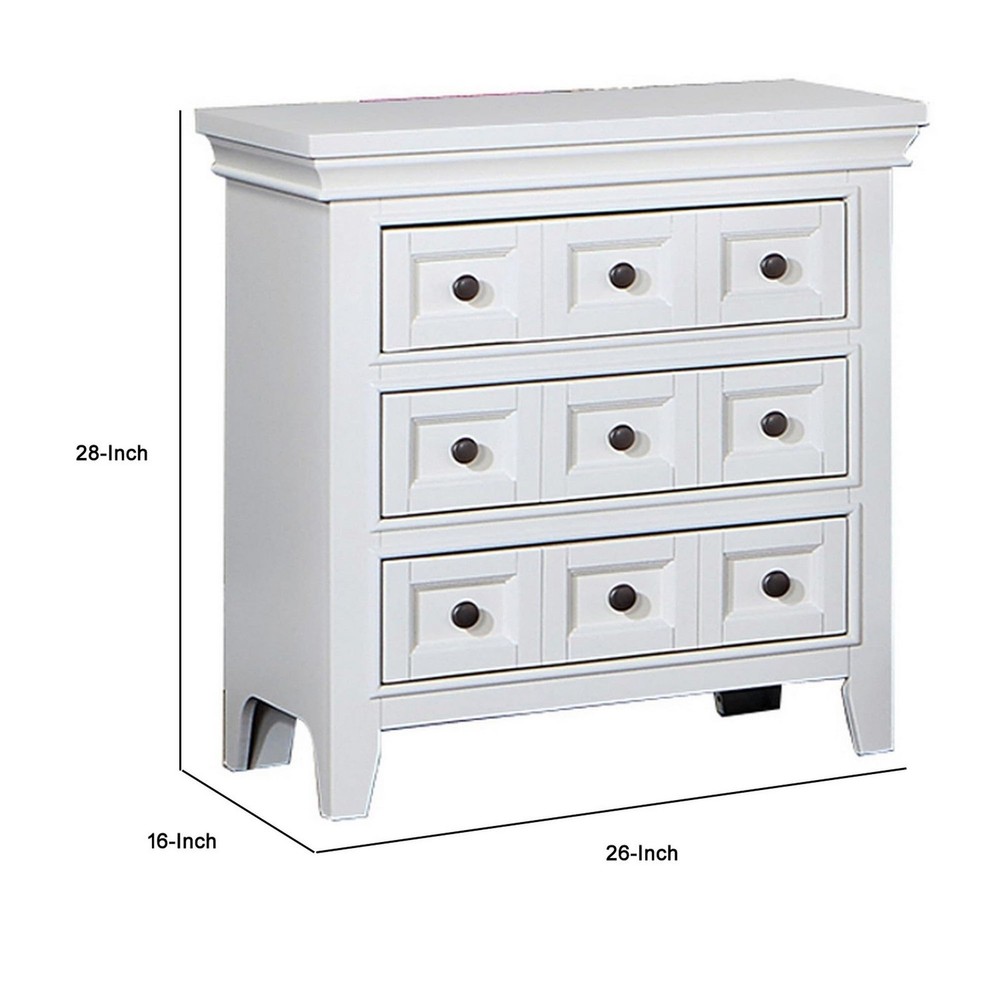 One nightstand Durable solid wood construction promises long lasting use Elegant white finish blends with various decor styles with gorgeous crown molded details accentuate the design. Three window pane inspired drawers with ball bearing glider tracks. Sleek round nickel handles add a modern flair with Dimensions : 16L x 26W x 28H, in inches