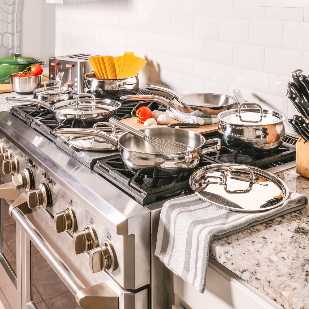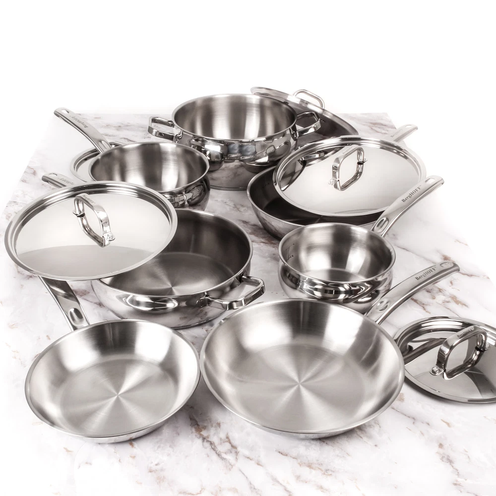 BergHOFF's 18/10 Stainless Steel Belly Cookware Collection, elegant beauty that will last for years. Crafted from hygienic 18/10 stainless steel with a mirrored finish, this cookware shows off sleek curves that accent each piece giving this cookware a unique and attractive look. Professional quality cooking with effortless cleanup. The Belly 12pc Cookware Set includes 1x 8" fry pan, 1x 9.5" fry pan, 1x 6.25"/1.5qt covered sauce pan, 1x 8"/3.2qt covered sauce pan, 1x 9.5"/5.5qt covered stock pot, 1x 9.5" covered deep skillet, 1x 10.5"/2.5qt covered skillet. The stainless steel lids allow you to cook more efficiently by securing heat inside. Our durable stainless steel cookware, designed with versatility and functionality in mind, is built to withstand a lifetime of use in the home. Free Shipping Over $49.99* Details BergHOFF Belly Shape 12pc 18/10 SS Cookware Set Metal Lids Product Description: BergHOFF's 18/10 Stainless Steel Belly Cookware Collection, elegant beauty that will last for years. Crafted from hygienic 18/10 stainless steel with a mirrored finish, this cookware shows off sleek curves that accent each piece giving this cookware a unique and attractive look. Professional quality cooking with effortless cleanup. The Belly 12pc Cookware Set includes 1x 8" fry pan, 1x 9.5" fry pan, 1x 6.25"/1.5qt covered sauce pan, 1x 8"/3.2qt covered sauce pan, 1x 9.5"/5.5qt covered stock pot, 1x 9.5" covered deep skillet, 1x 10.5"/2.5qt covered skillet. The stainless steel lids allow you to cook more efficiently by securing heat inside. Our durable stainless steel cookware, designed with versatility and functionality in mind, is built to withstand a lifetime of use in the home. Ergonomic, double-riveted stainless steel handles provide a secure grip. High quality elements were put into every aspect of this cookware. The solid tri-ply base allows you to use on all cooktops including ceramic, gas, induction, electric, and glass. Please allow cookware to cool completely before attempting to clean. Dishwasher safe.