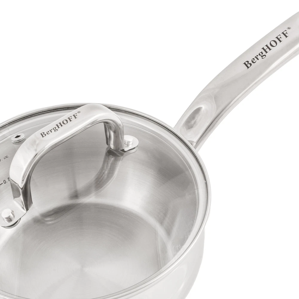 BergHOFF's Belly Shape 7pc Cookware set combines elegance with functionality, crafted from premium 18/10 stainless steel for lasting durability and a stunning mirror finish. The glass lids allow you to keep an eye on your ingredients without allowing essential heat escape from the pot. Each piece are equipped with ergonomic, comfort-grip double-riveted handles and built-in measurement marks, located inside, add convenience and ease of use. Additionally, this cookware set features a 3-layered base bottom for quick and even heat distribution and retention, ensuring optimal cooking performance. Compatible with any cooktop including vitro-ceramic, gas, induction, electric, and glass cooktops. Oven safe up to 440°F. From searing, sauteing and frying to making sauces, soups, stocks, this Free Shipping Over $49.99* Details BergHOFF Belly Shape 7pc 18/10 Stainless Steel Cookware Set with Glass Lids Product Description: BergHOFF's Belly Shape 7pc Cookware set combines elegance with functionality, crafted from premium 18/10 stainless steel for lasting durability and a stunning mirror finish. The glass lids allow you to keep an eye on your ingredients without allowing essential heat escape from the pot. Each piece are equipped with ergonomic, comfort-grip double-riveted handles and built-in measurement marks, located inside, add convenience and ease of use. Additionally, this cookware set features a 3-layered base bottom for quick and even heat distribution and retention, ensuring optimal cooking performance. Compatible with any cooktop including vitro-ceramic, gas, induction, electric, and glass cooktops. Oven safe up to 440°F. From searing, sauteing and frying to making sauces, soups, stocks, this cookware set is perfect for a variety of dishes. Dishwasher safe. Set includesFry pan 9.5", Saucepan 8" 3.2qt., Stockpot 9.5" 5.5qt., Deep Skillet 9.5", and 3x glass lids Set includes high quality 18/10 Stainless steel 9.5" Fry pan, 8" Saucepan 3.2qt., 9.5" Stockpot 5.5qt., 9.5" Deep Skillet with helper handle, and 3x glass lids, featuring long, ergonomically designed comfort-grip handles and mirror finish. The 18/10 stainless steel composition is resistant to rust, staining, and corrosion which ensures the cookware's long-lasting performance and lifespan. This material is non-toxic, free of PFAS and PTFE, making it the healthiest to cook with. Enjoy cooking at high temperatures without worrying about harmful chemicals leeching into your food. With measurement markings located on the inside of the pan, portion control has never been easier. Accurately measure the amount of ingredients you need, ensuring that your dishes turn out perfectly every time. Deep skillet features a helper handle for easy mobility when transferring from stovetop to oven or serving dish. No need to worry about your meal turning out undercooked or overcooked. Featuring a 3-layered base that ensures even heat distribution so that your food is cooked evenly and thoroughly. Compatible with a wide variety of cooktops such as Induction, Electric, Gas, Halogen, Vitro-ceramic. Oven safe without lid up to 440°F, with lid up to 350°F. Discover the key to well-maintained stainless steel cookwarelet cool before washing, gently remove food residue and stains with a sponge or nylon scrubbing pad, wash with warm water and mild soap and steer clear of abrasive materials or harsh detergents. Dishwasher safe.