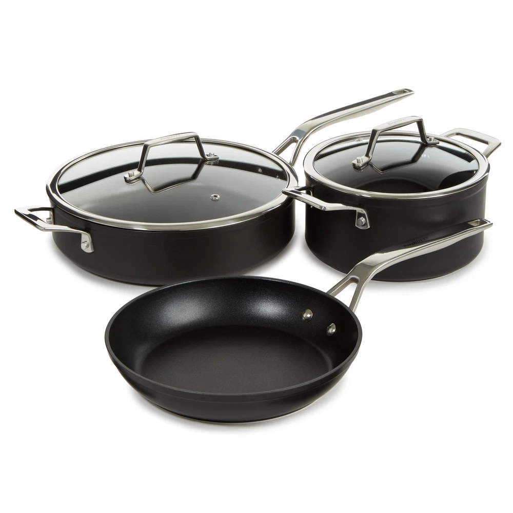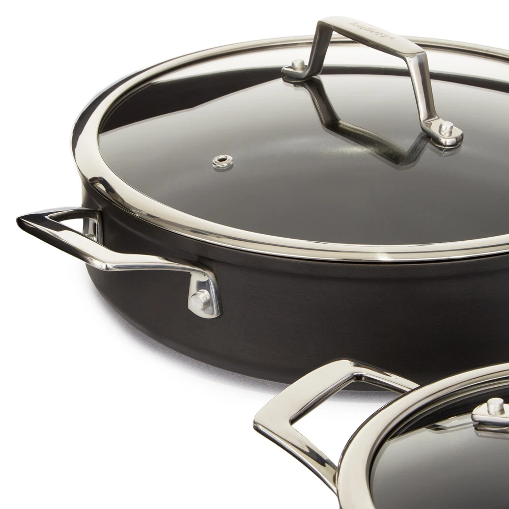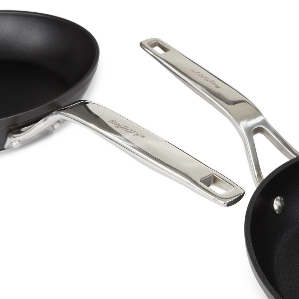 BergHOFF's Essentials 5pc Cookware set features hard-anodized aluminum construction for exceptional durability. Layered with BergHOFF's FernoGreen nonstick coating, 100% Non-Toxic and does not contain PFOA, GEN-X, BPA, APEO, NMP or PFOS for healthier no-oil or low oil cooking and make it easy to clean. Each piece includes ergonomic, polished comfort-grip stainless steel handles for a safe, secure and comfortable grip. Additionally, the glass lids also features stainless steel rims and venting holes, allowing you to keep an eye on the food while cooking. This set is designed with full disk bottom to avoid scratches on your glass top cooktop and to ensure rapid, even heat distribution for energy-efficient cooking. They can be used on any kind of stovetop including induction, oven safe up to Free Shipping Over $49.99* Details BergHOFF Essentials 5Pc Non-stick Hard Anodized Cookware Starter Set, Black Product Description: BergHOFF's Essentials 5pc Cookware set features hard-anodized aluminum construction for exceptional durability. Layered with BergHOFF's FernoGreen nonstick coating, 100% Non-Toxic and does not contain PFOA, GEN-X, BPA, APEO, NMP or PFOS for healthier no-oil or low oil cooking and make it easy to clean. Each piece includes ergonomic, polished comfort-grip stainless steel handles for a safe, secure and comfortable grip. Additionally, the glass lids also features stainless steel rims and venting holes, allowing you to keep an eye on the food while cooking. This set is designed with full disk bottom to avoid scratches on your glass top cooktop and to ensure rapid, even heat distribution for energy-efficient cooking. They can be used on any kind of stovetop including induction, oven safe up to 450°F, allowing seamless transition from stovetop to oven to table. Hand wash only. Set includes10" Fry pan, 11" Deep skillet 4.3qt., 8" Stockpot 3.3qt., 2x Glass Lids. Package includes Fry Pan 10", 11" deep skillet 4.3-quart, 8" stockpot 3.3-quart, and 2x glass lids with steam vent. Made with top-tier hard-anodized aluminum, featuring FernoGreen non-stick coating. Stainless steel and ergonomic handle offers a safe and comfortable grip for secure lifting. FernoGreen, 100% Non-Toxic and does not contain PFOA, GEN-X, BPA, APEO, NMP or PFOS for healthier no-oil or low oil cooking, promoting healthier lifestyles without compromising on flavor. Enjoy no-oil or low oil cooking with peace of mind, knowing that your food is free from any potentially harmful substances. This high-quality hard anodized starter set provides exceptional durability and superior heat distribution. Its full disk bottom ensures a fast and even heat distribution for energy-efficient cooking. Perfect for achieving precise cooking results and is incredibly resilient, making it a fantastic addition to any kitchen. The even heat distribution allows for precise temperature control and reduces the need for excessive heat, promoting energy-efficient cooking. Designed to suit all kinds of heat sources such as Induction, Electric, Gas, Halogen, vitro-ceramic. Can be transferred from Stovetop to Oven to Table, Oven safe up to 450°F. Maintain the quality of your cookware set by allowing the pan to cool and then wash with warm water and mild soap while using a sponge or nylon scrubbing pad to remove food residue and stains. Non-stick coating boasts easy food release for a fast and simple cleanup. Hand wash only.