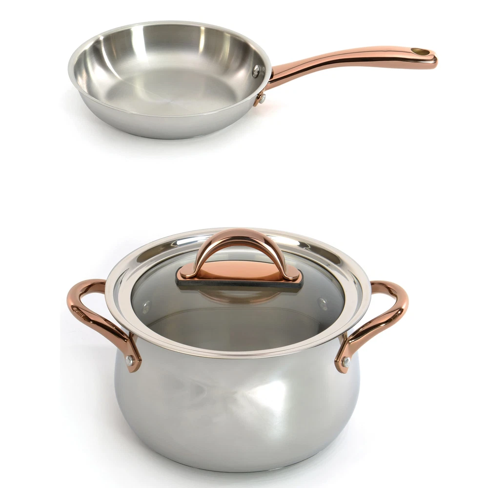 Ouro Gold 3-pc Starter Set seamlessly combines style, durability, and functionality for contemporary kitchens. Made from high-quality, durable 18/10 stainless steel, this eco-friendly and sustainable set features stylish rose gold handles for a comfortable, secure grip. The stockpot includes a glass lid designed to lock in heat and moisture, enabling efficient waterless cooking that preserves nutrients and enhances flavors. Prepare a variety of dishes, from nutrient-rich steamed vegetables and tender braised meats to rich soups and stews, all while benefiting from energy-efficient performance. The 3-layered base provides even heat distribution across multiple cooktops, including Induction, Electric, Gas, Halogen, Glass Top, and Vitro-ceramic. Combining practical functionality with a sleek, Free Shipping Over $49.99* Details BergHOFF Ouro Gold 3pc 18/10 Stainless Steel Cookware Set, Glass Lids, Rose Gold Product Description: Ouro Gold 3-pc Starter Set seamlessly combines style, durability, and functionality for contemporary kitchens. Made from high-quality, durable 18/10 stainless steel, this eco-friendly and sustainable set features stylish rose gold handles for a comfortable, secure grip. The stockpot includes a glass lid designed to lock in heat and moisture, enabling efficient waterless cooking that preserves nutrients and enhances flavors. Prepare a variety of dishes, from nutrient-rich steamed vegetables and tender braised meats to rich soups and stews, all while benefiting from energy-efficient performance. The 3-layered base provides even heat distribution across multiple cooktops, including Induction, Electric, Gas, Halogen, Glass Top, and Vitro-ceramic. Combining practical functionality with a sleek, elegant design, this set is a must-have for both efficient and eco-conscious cooking. Hand wash recommended. Package includesFrying Pan 8", 9.5" Stockpot 8.1qt., and glass lid, Silver & Rose Gold Package includesFrying Pan 8", 9.5" Stockpot 8.1qt., and Glass lid. Upgrade and experience our cookware set, crafted from high-quality 18/10 Stainless Steel with a sleek mirror finish and features ergonomically designed rose gold handles for a firm, secure grip. A 18/10 Stainless steel body is resistant to rust, staining and corrosion for a long-lasting lifespan. The non-toxic material, that's PTFE-free and PFAS-free, ensures that no harmful chemicals will leach into your food while cooking at high temperatures, making this one of the safest and healthiest material to cook with. Featuring a vapor seal lid, designed without a vent, that maintains the retention of foods' nutrients and taste by cooking them below the boiling point with medium to low heat. The tightly-fitted lid eliminates the need for excess water, allowing the food to self-baste for an energy-efficient cooking process. Achieve perfect results every time with the cookware set's 3-layered base design. The multi-layered bottom guarantees even heat distribution, ensuring perfectly cooked meals every time. This set is designed to be compatible with a wide range of cooktops such as Induction, Electric, Gas, Halogen, Vitro-ceramic Stove. Preserve the pristine condition of your cookware set by following these cleaning tipsallow it to cool before washing, use a sponge or nylon scrubbing pad to remove food residue and stains, wash with warm water and mild soap, and avoid abrasive materials or harsh detergents.