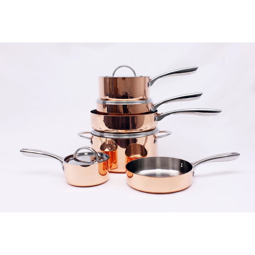 Vintage 10pc polished tri-ply copper cookware set, a true masterpiece that will undoubtedly become the centerpiece of your kitchen. Made with durable polished copper exterior with aluminum alloy core & surgical grade stainless steel interior. The tri-ply construction of this cookware ensures even heat distribution, making it perfect for all your culinary creations. The ergonomic, comfort-grip handles make it easy to maneuver the pots and pans, while the polished design adds a touch of elegance to your kitchen decor. Whether you are a professional chef or a passionate home cook, this copper cookware set is a must-have for those who appreciate both style and functionality in their kitchen. Elevate your cooking experience and impress your guests with this exceptional cookware set that Free Shipping Over $49.99* Details BergHOFF Vintage 10pc Tri-Ply Copper Cookware Set with Lids, Polished Product Description: Vintage 10pc polished tri-ply copper cookware set, a true masterpiece that will undoubtedly become the centerpiece of your kitchen. Made with durable polished copper exterior with aluminum alloy core & surgical grade stainless steel interior. The tri-ply construction of this cookware ensures even heat distribution, making it perfect for all your culinary creations. The ergonomic, comfort-grip handles make it easy to maneuver the pots and pans, while the polished design adds a touch of elegance to your kitchen decor. Whether you are a professional chef or a passionate home cook, this copper cookware set is a must-have for those who appreciate both style and functionality in their kitchen. Elevate your cooking experience and impress your guests with this exceptional cookware set that combines artistry and performance seamlessly. Whether you're sautéing, simmering, or searing, this versatile cookware set has you covered, suitable for Electric, Gas, Halogen, and Vitro-ceramic. Oven safe 450°F. Hand wash recommended. Set includes 5.5" saucepan 1qt., 7" sauce pan 2qt., 8" sauce pan 3qt., 9.5" stockpot 5.75qt., 8" & 9.5" deep skillet with 4x lids. Set includes 5.5" saucepan 1qt., 7" saucepan 2qt., 8" saucepan 3qt., 9.5" stockpot 5.75qt., 8" & 9.5" deep skillet, crafted with tri-ply material, layered with 18/10 Stainless steel, aluminum core and copper exterior and equipped with ergonomic, comfort-grip handles. Includes 4x matching lids. Polished design. Featuring a tri-ply body that provides even heat distribution and retention, ensuring that your meals will cook thoroughly and evenly. Non-toxic and healthy, this material is PFAS-free and PTFE-free with a resistance to rust, corrosion and staining for long-lasting performance. Featuring a vapor seal lid, designed without a vent, that maintains the retention of foods' nutrients and taste by preventing moisture and juices from escaping and ensures your dishes remain flavorful and tender. This eliminates the need for excess water, as the foods are self-basted for an energy-efficient cooking process. No need to worry about under or overcooked meals thanks to this cookware's tri-ply construction, guaranteeing your food will be cooked evenly and thoroughly. Compatible with a wide range of cooktops including Electric, Gas, Halogen, and Vitro-ceramic. Ensure the longevity of your cookware with proper careallow to cool before washing, use a sponge or nylon scrubbing pad to remove food residue and stains, wash with warm water and mild soap, and avoid abrasive materials or harsh detergents.