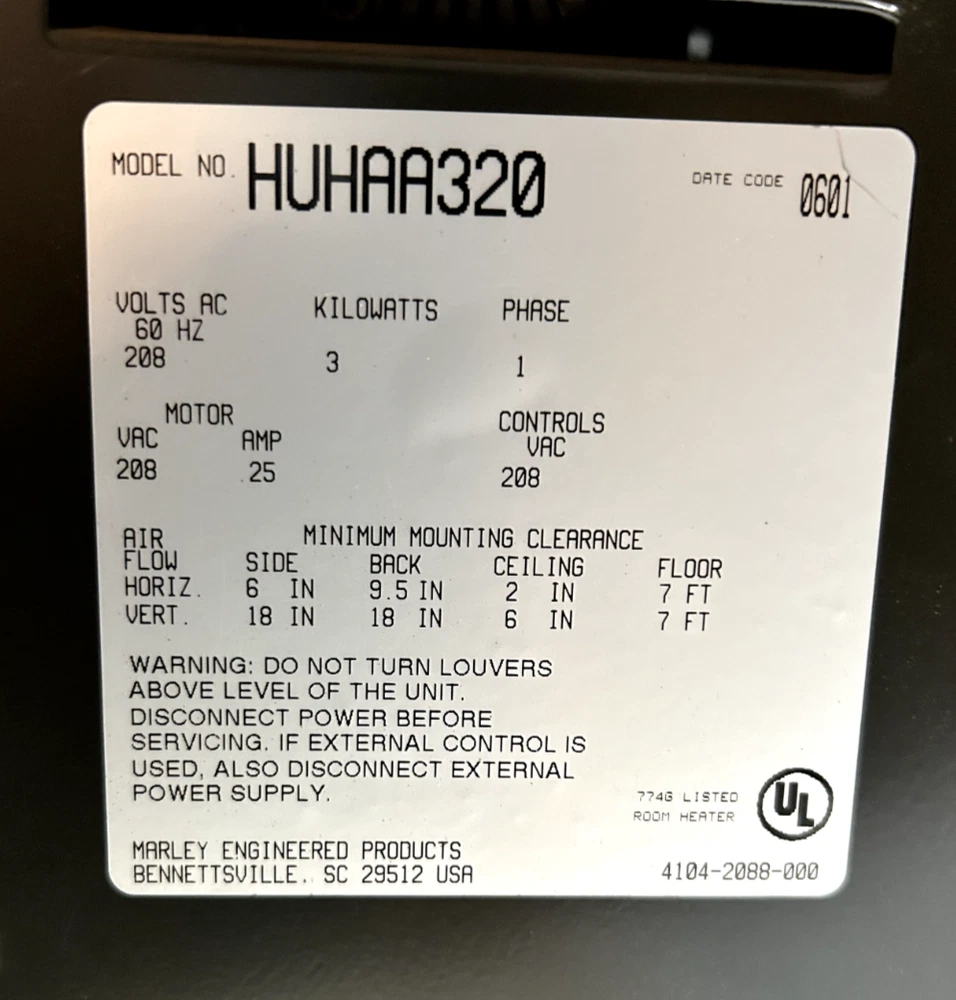 Berko HUHAA320 Heater - See Pics Tested & Working MARLEY ENGINEERED PRODUCTS HUHAA320