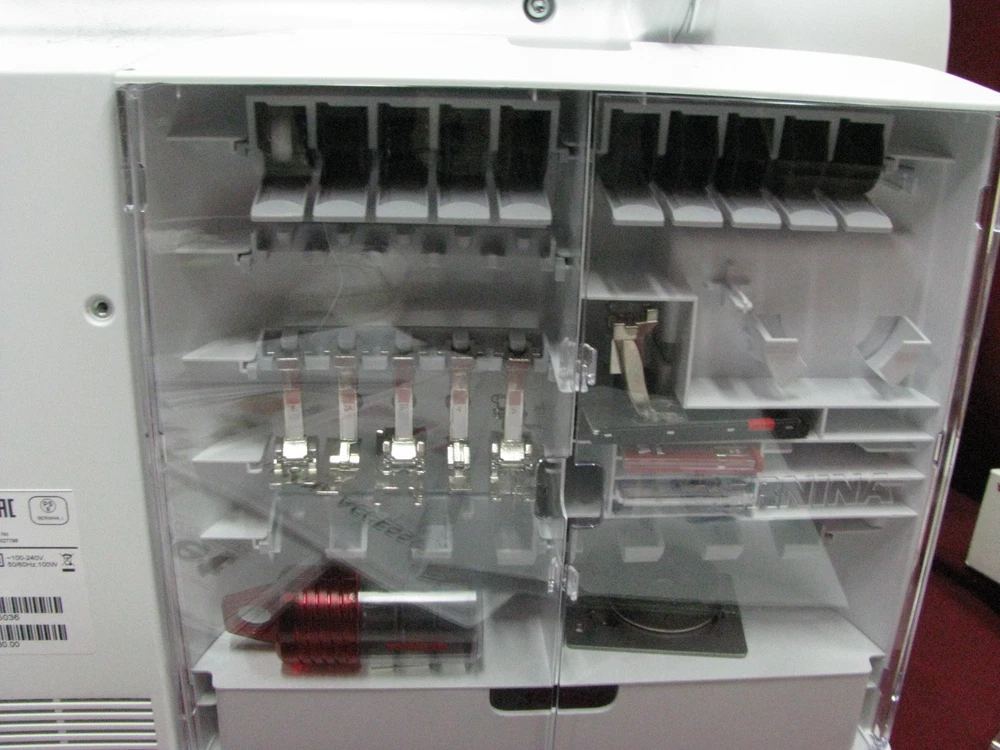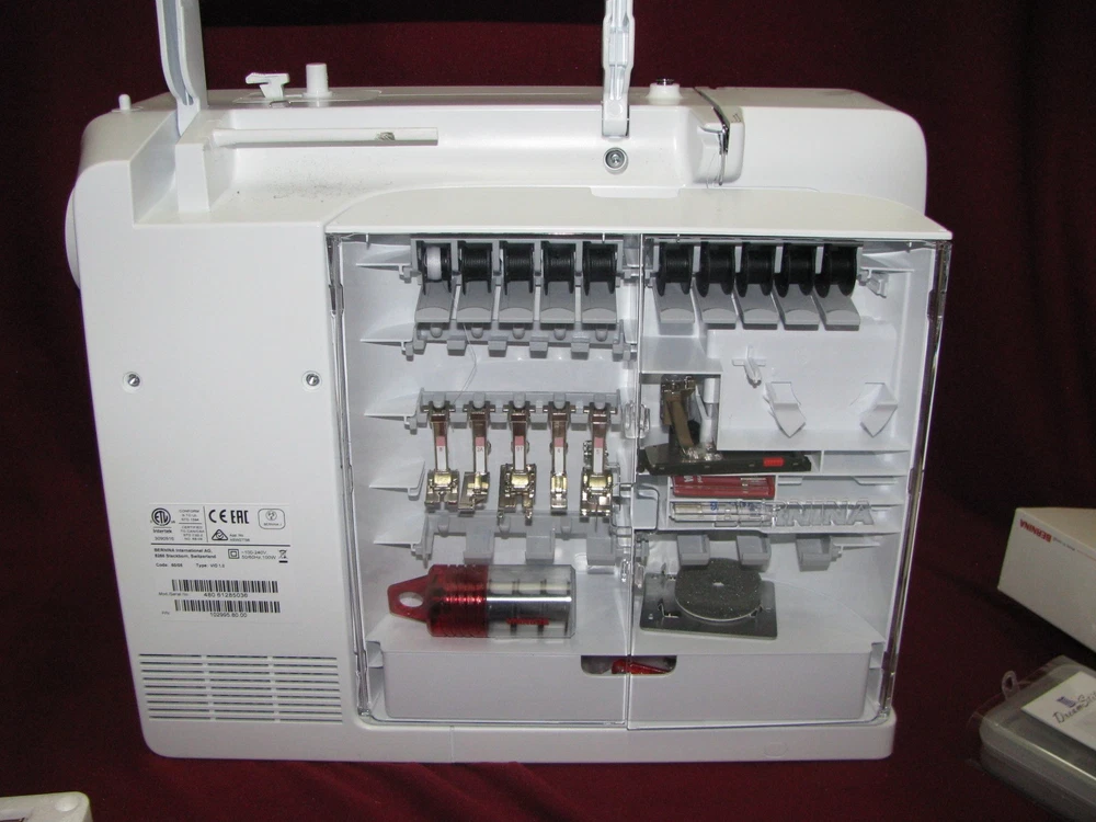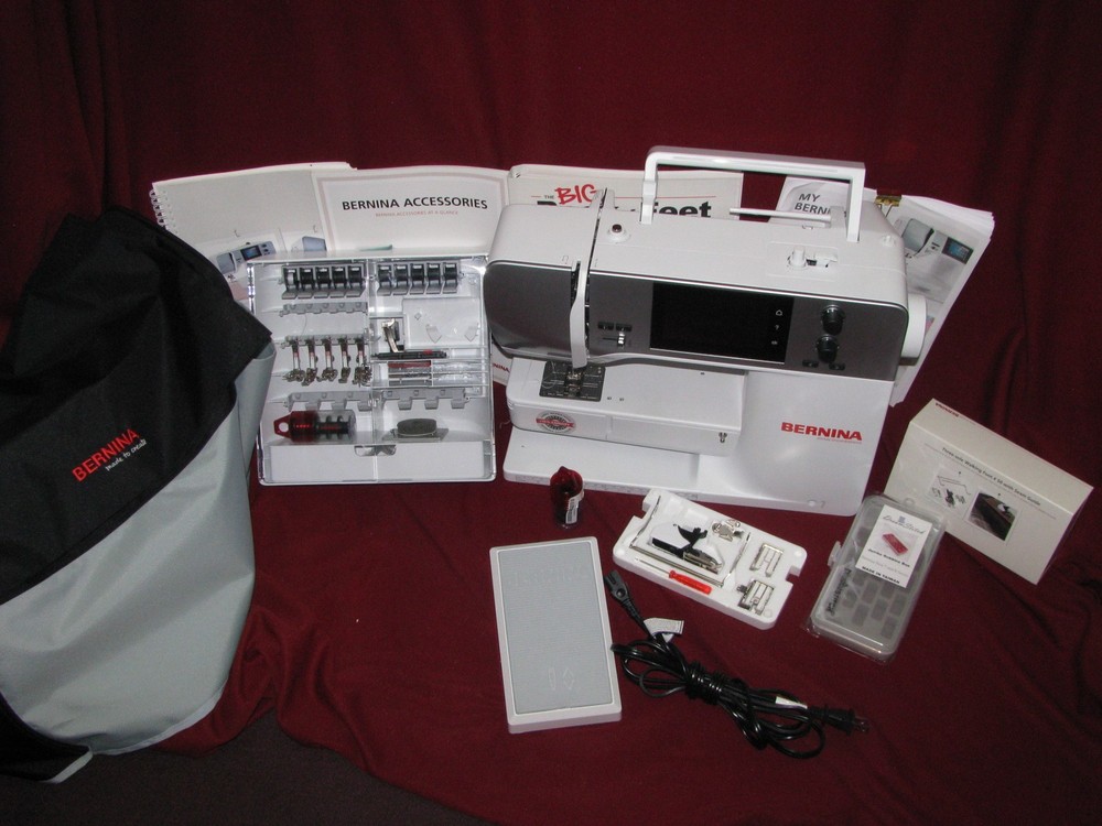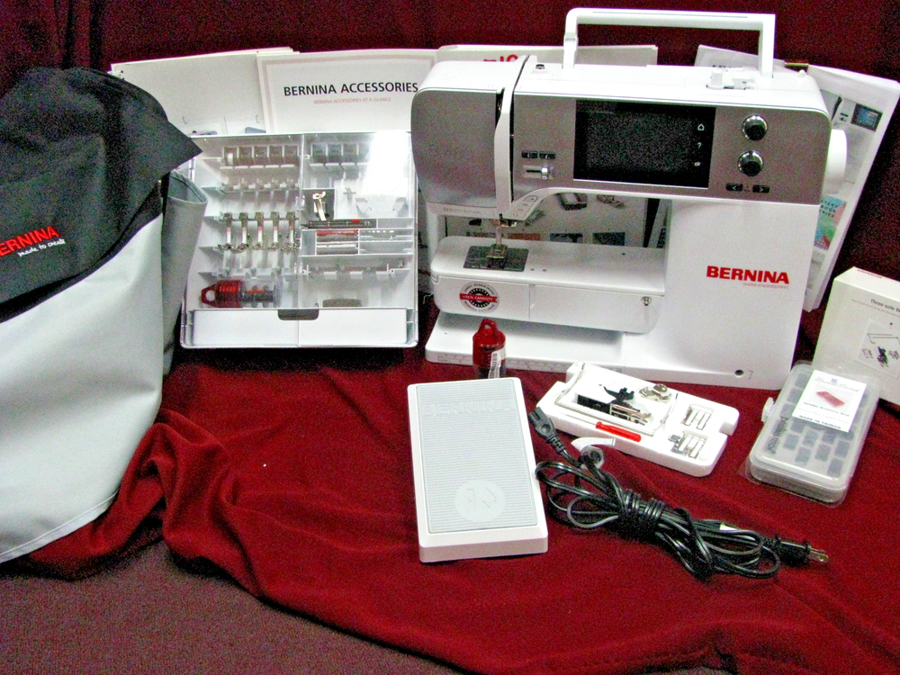 Like NEW - Estate Sale Find Also I Just Professionally serviced. Rarely Used - Non-Smoking home ( Bought 6 Machines-None of them used much) NOTE: Our 100% Positive feedback-25 years, Over 450 sales ! Comes with all the Accessories shown, ( IF You do not see something - please ask) Amazing machine with so many features: ( Will be shipped Packed / Padded & protected & Insured ) Note our 100% satisfied Customer rating All Used and Estate Sale items are Sold "Final Sales No Returns" - However Buyers are of course fully Covered by EBAY Satisfaction Gty that it Ships Safely and is "As described & Expected" Up to 9mm Stitch width BERNINA (tm) Jumbo Bobbin Automatic Thread Cutter Automatic Needle Up/Down BSR ready enabled (not included) Exclusive Face Place 994 Stitch Patterns, plus Quilting Stitches 3 sole Walking Foot with seam guide Color Touch Screen Slide on extension table Bobbin winder protective cover Knee Lifter Bernina Black Cover