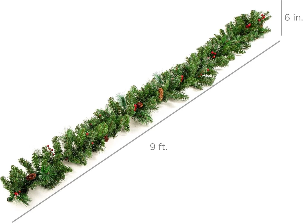 FULL APPEARANCE: Fully fluffed spruce-style branches use hundreds of tips to lend a healthy, natural appearance to your holiday display PRE-LIT HOLIDAY ESSENTIAL: Decorate your stair railing, fireplace, and more with a realistic, 9-foot garland strip that's pre-strung with 50 lights to brighten up the season HIGH-QUALITY DESIGN: Crafted with durable, flame-retardant PVC branches and a hidden battery box, so you can light it up in a variety of decorative setups without loose cords hanging CORDLESS DESIGN: This garland comes with a weather-resistant battery box, making it ideal for both indoor and outdoor use-no plugs needed, simply add it to your favorite display and watch it shine! PRE-DECORATED: Trimmed with pine cones and artificial red berries to create lively, yet wintery appeal that captures the holiday spirit; OVERALL DIMENSIONS: 108"(L) x 8"(W) x 6"(H)