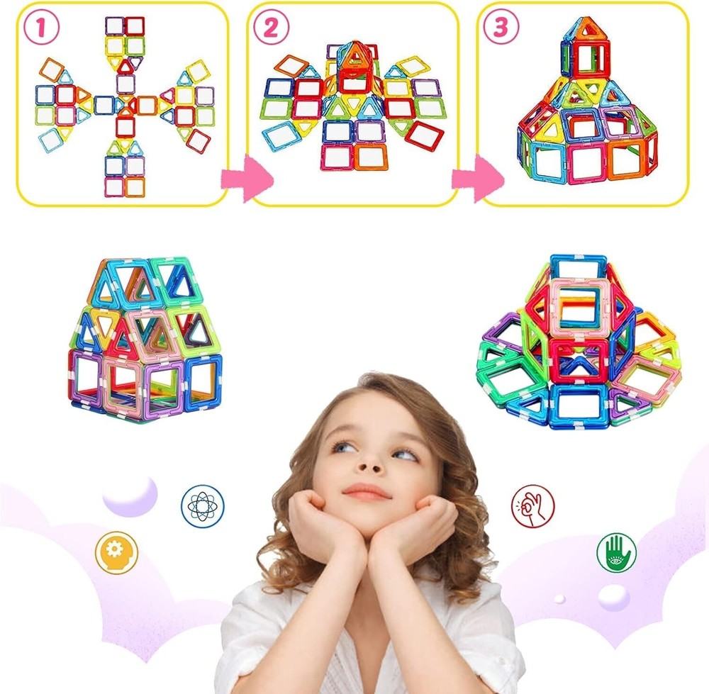 These magnetic tiles are a fantastic way to spark creativity and learning! My little one loves building all sorts of shapes, from simple houses to wild 3D structures. The strong magnets make it easy for small hands to connect the pieces, and the bright colors keep them engaged for hours. It’s amazing how much they learn while playing—problem-solving, spatial awareness, and even teamwork when building together. The quality is solid, and they’ve held up well to daily use. Perfect gift for curious minds!