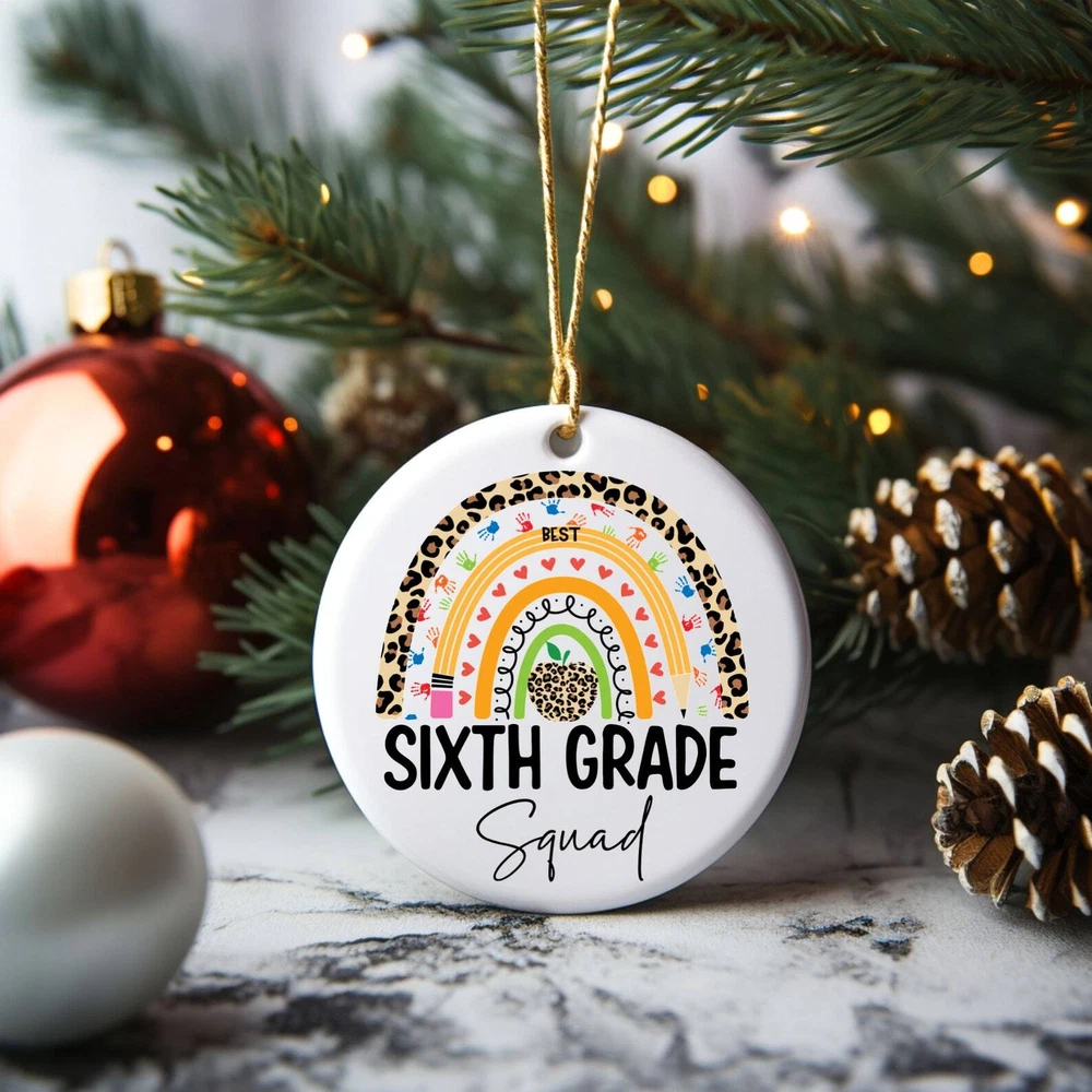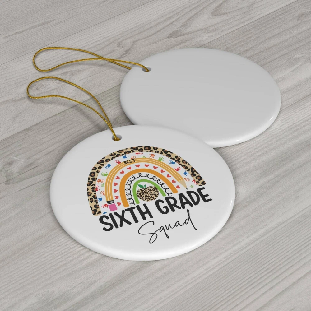 Best Sixth Grade Squad Ornament Sixth Grade Class 6th Grade Gift Teacher Gift Sixth Grade Teacher Material: Ceramic Color: White Shapes: Circle, star, heart and oval Can be printed on both sides Imprint full-color artwork, photos, or logos Hole for hanging string and hanging string included Printed in the USA