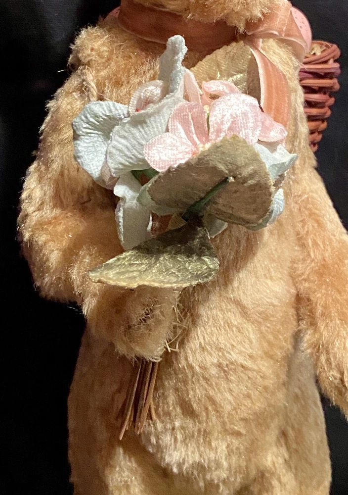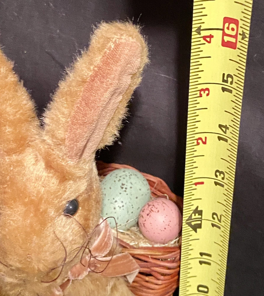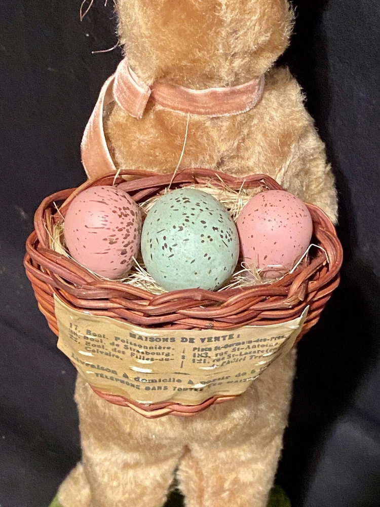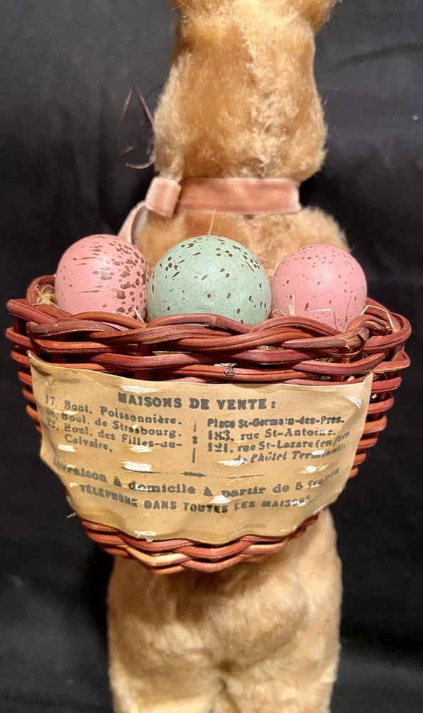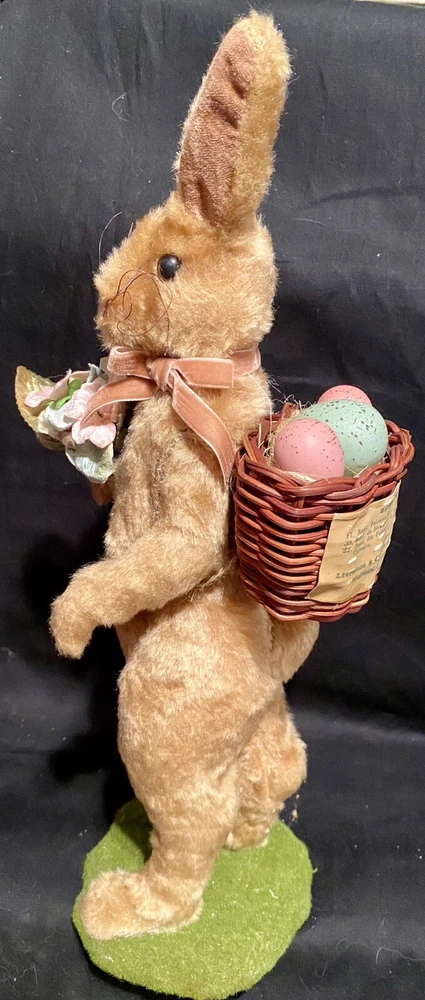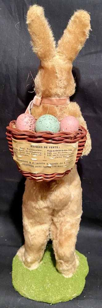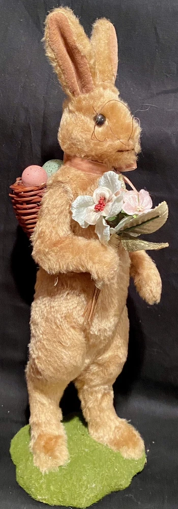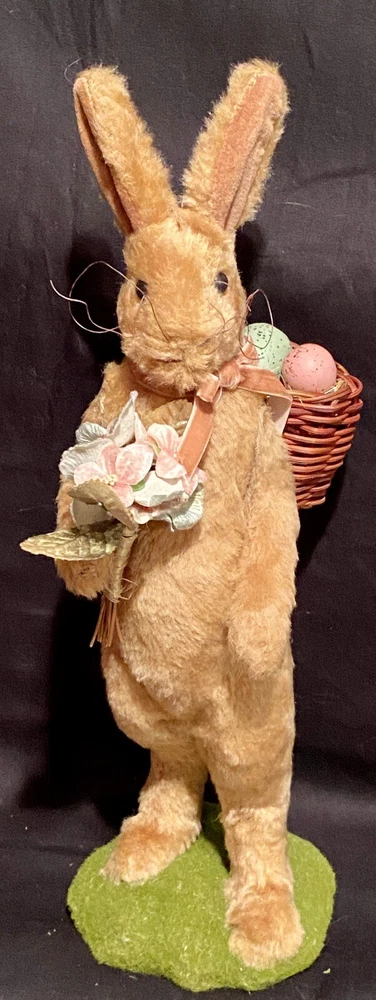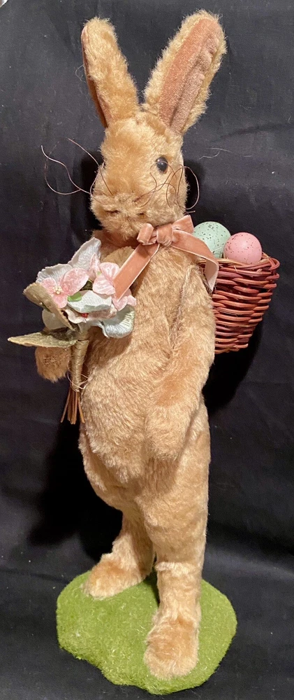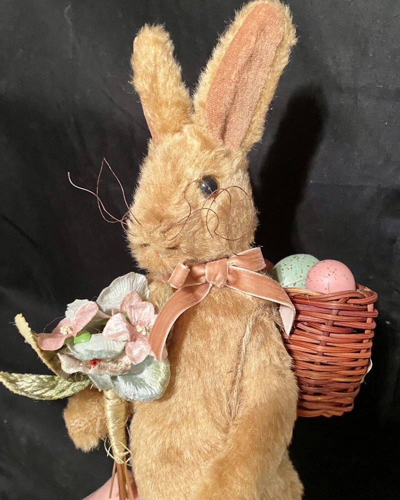 This is a vintage Bethany Lowe French Easter Bunny Rabbit figurine standing at 16 inches tall. The Rabbit has a basket of robin’s eggs with a French advertising label on it which states "Maisons De Vente" (Green Houses) along with Boulevard addresses and delivery notes. The velveteen material is clean and shines with different color variations in different lighting. It is in very good condition (see pics). It has intricate details and high-quality craftsmanship which are sure to impress and bring joy to any Easter enthusiast or collection. No card or tag.