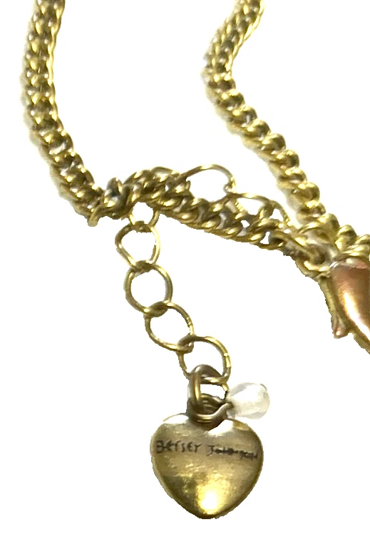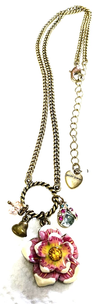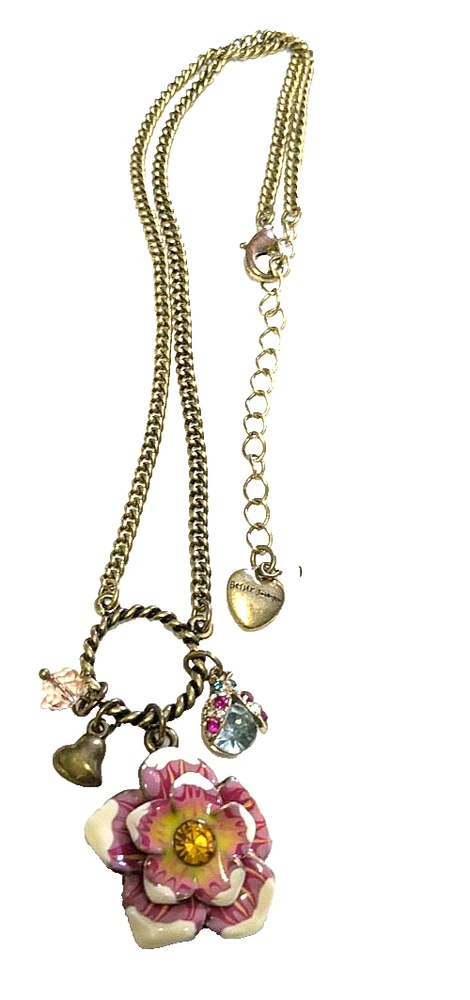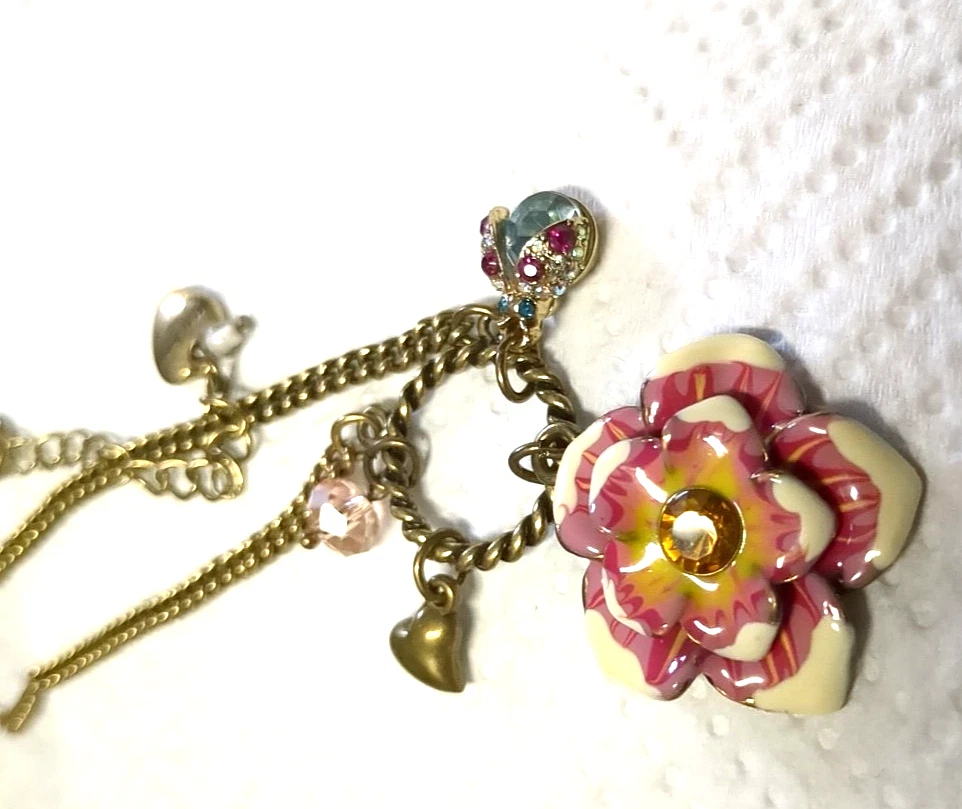 This Betsey Johnson necklace features a tropical flower charm in pink and orange enamel on a goldtone 18" chain. The pendant shape is a flower, accented with crystal secondary stones in a pavé setting. The necklace is signed by Betsey Johnson and is a charming piece perfect for occasions like Mother's Day, Christmas, or a walk in the park. It exudes a fun and vibrant vibe with its nature-themed design, making it a great accessory for adding a touch of beauty to any outfit.