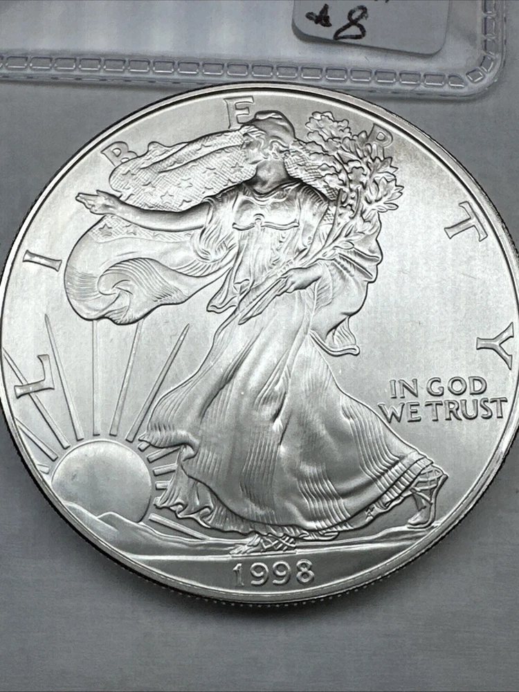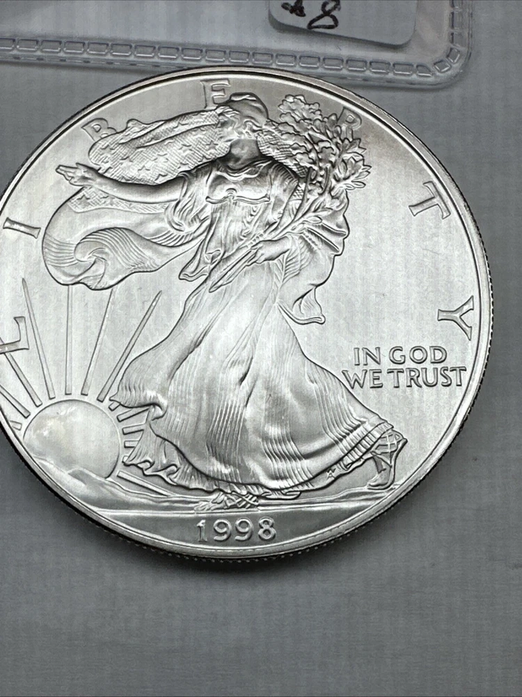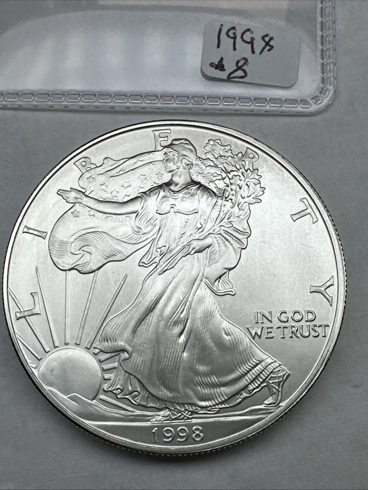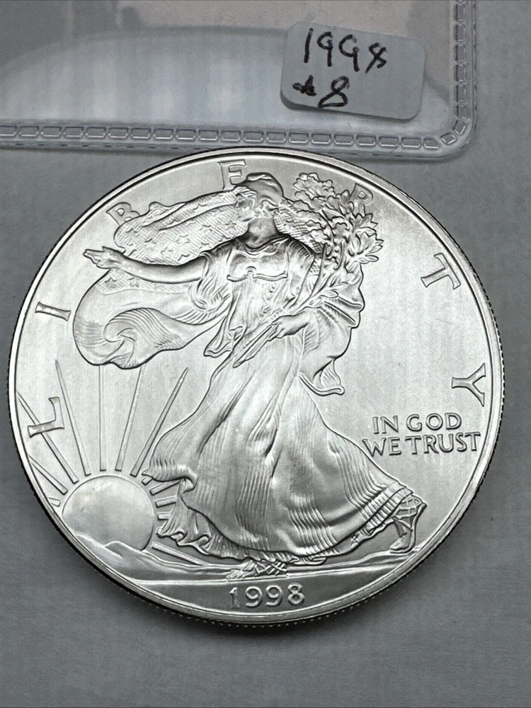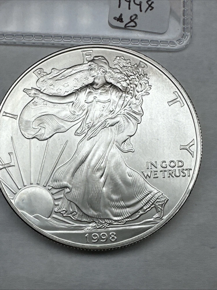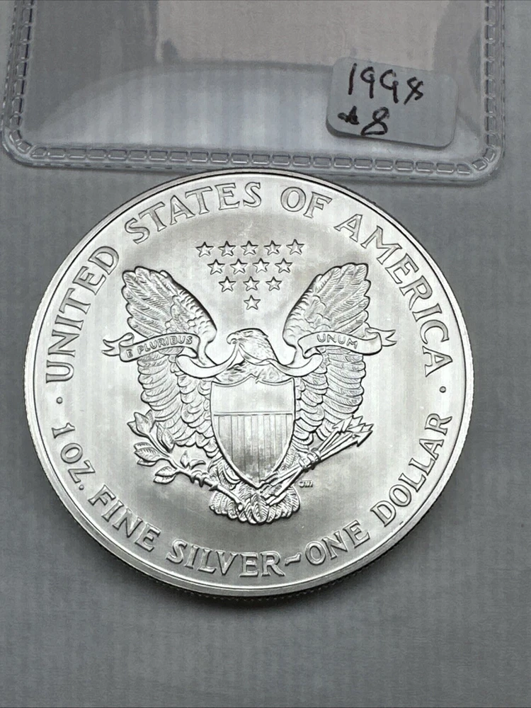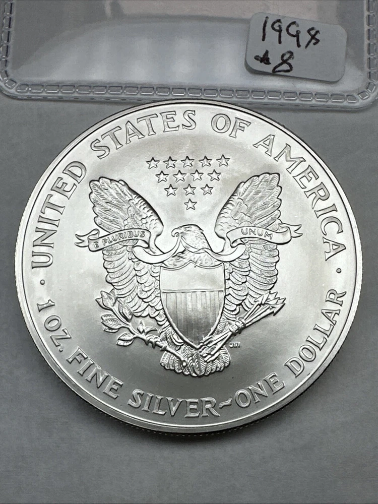 Brand/Mint: U.S. Mint Circulated/Uncirculated: Uncirculated Composition: Silver Country/Region of Manufacture: United States Coin: American Eagle Fineness: 0.999 Precious Metal Content per Unit: 1 oz Denomination: $1 Certification: Uncertified Total Precious Metal Content: 1oz Strike Type: Business Mint Location: Philadelphia Year: 1998 Grade: Ungraded