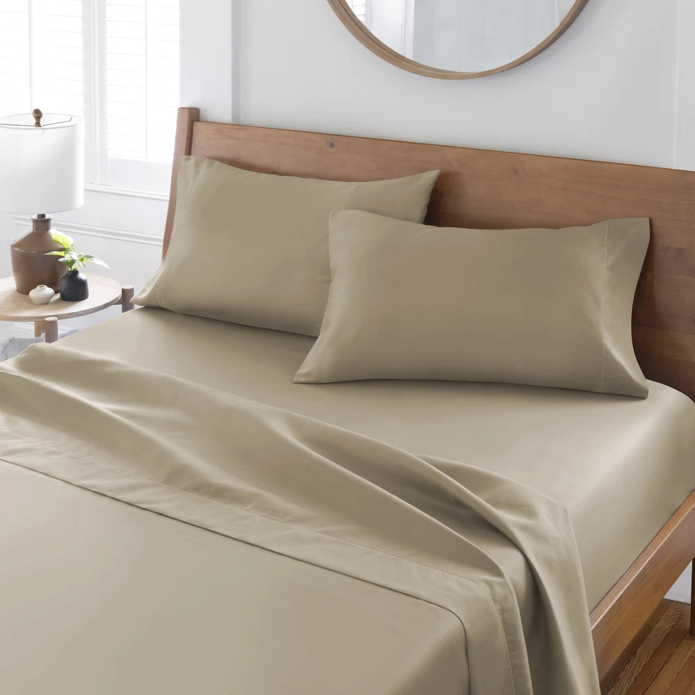 The Better Homes & Gardens 3-Piece 400 Thread Count Ogee Almond Biscuit Performance Hygro Cotton Sheet Set is made from 100% cotton and has a silky smooth sateen weave that gets softer and more breathable after each wash. This adult sheet set features temperature regulating HYGROCOTTON that wicks away moisture, keeping you cool in the summer and warm in the winter. The cotton construction also resists pilling, so your sheet set looks new after repeated washes and also provides wrinkle-free smoothness and durability. The fitted sheets are stitched with FLEXI-FIT technology with patented stretch panels, to provide a snug fit throughout the night. Transform your bedroom with the Better Homes & Gardens 3-Piece 400 Thread Count Ogee Almond Biscuit Performance Hygro Cotton Sheet Set. On Dec 15, 2024 at 18:43:49 PST, seller added the following information: